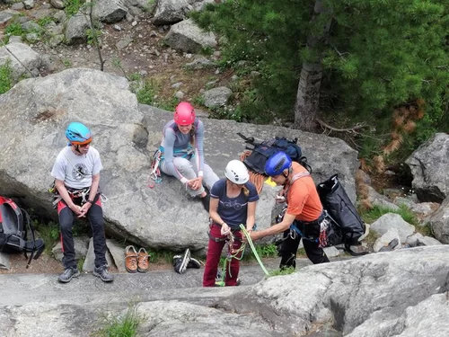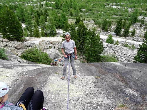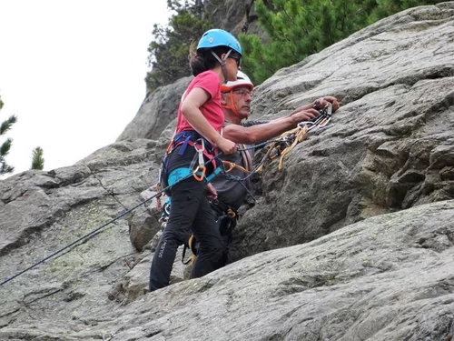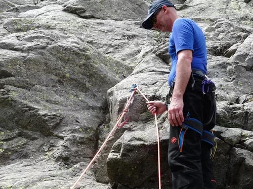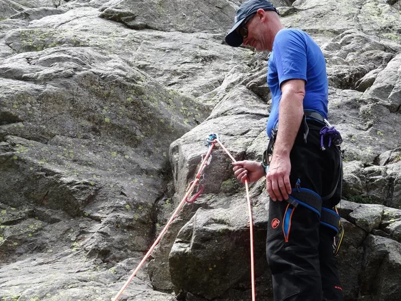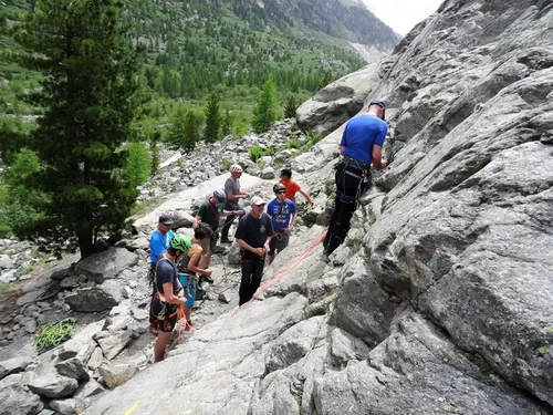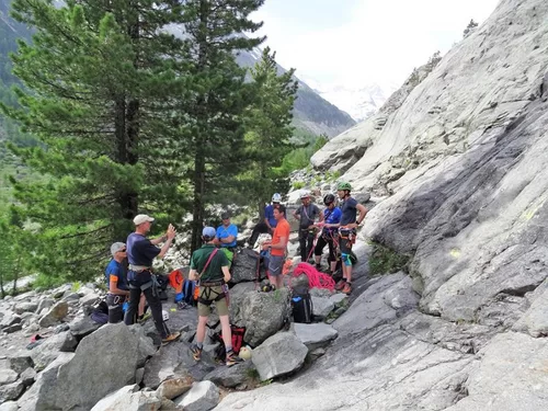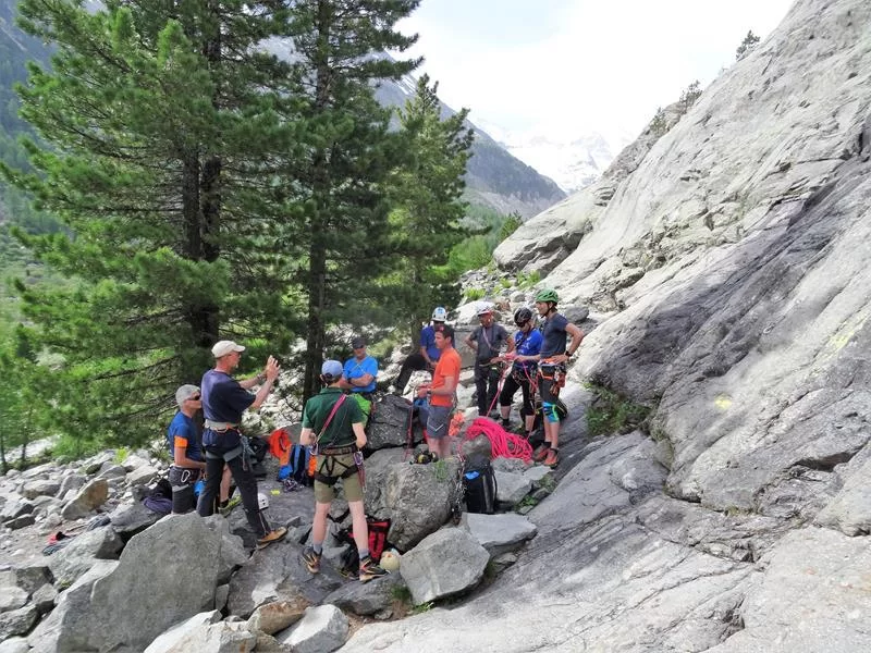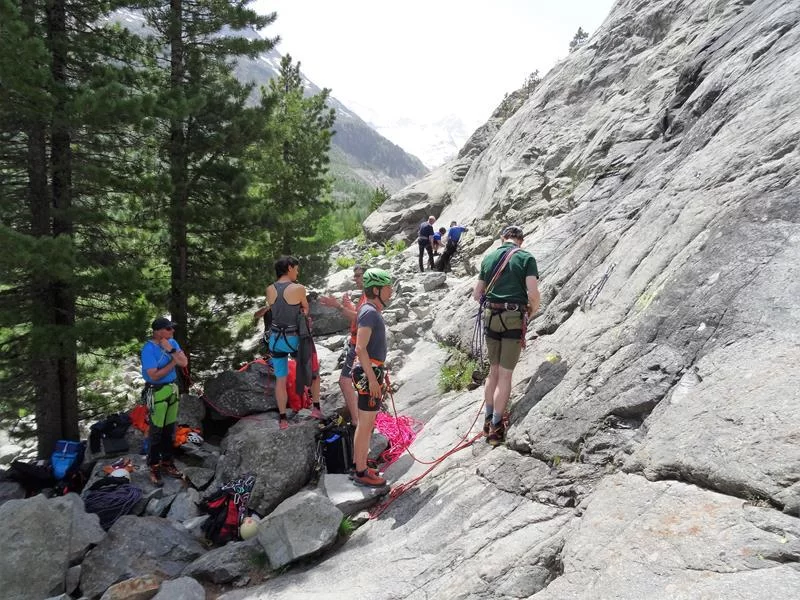 Am Sonntag dann wurden die Teilnehmer in kleinen Gruppen ihren Vorkenntnissen entsprechend aus- oder weitergebildet. Das Gelernte konnte gleich angewendet werden, die Verhältnisse im Klettergarten Morteratsch sind hierfür ideal.