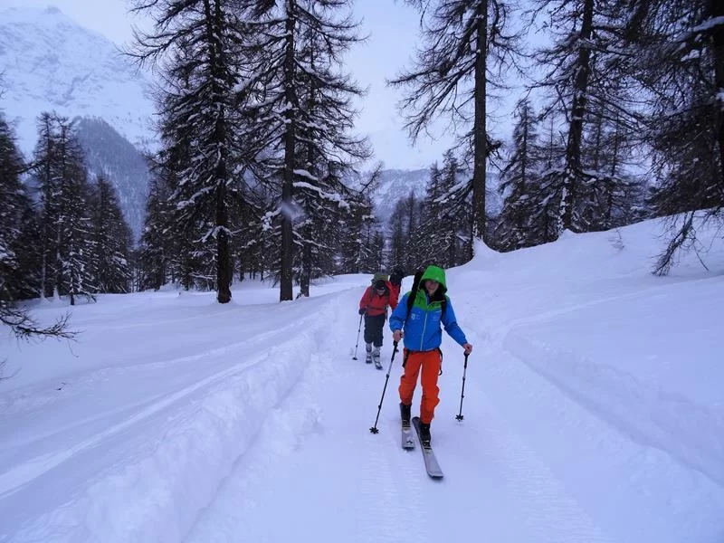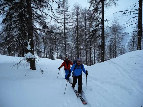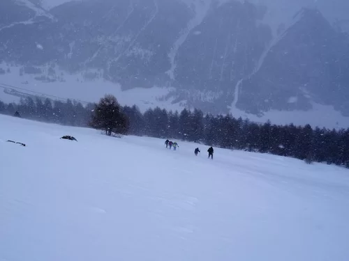 Gestartet in Madulain war das Tourenziel noch offen. Durch tief evrschneiten Wald kamen wir langsam höher. Über dem Wald setzte dann mehr und mehr der Wind ein, der dann bei der Alp schon deutlich spürbar war und die Sicht markant verschlechterte. So beschlossen wir, hier umzudrehen um dann nochmals aufzusteigen.