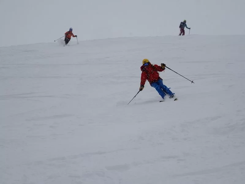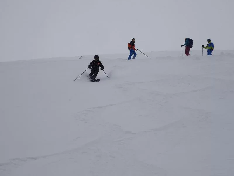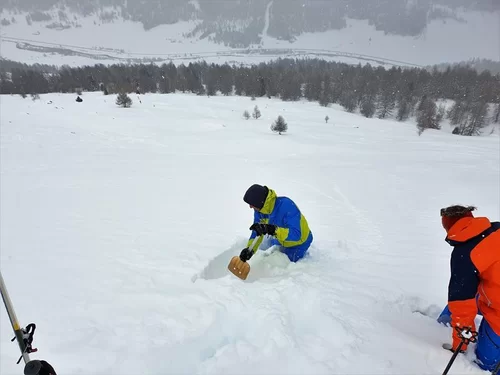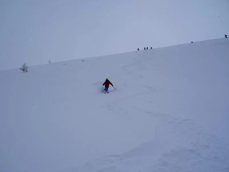 Belvair war heute bella naiv: tiefer Pulverschnee zauberte bei allen ein breites Grinsen ins Gesicht. Kaum in Madulain angekommen war für die Hälfte der Teilnehmer klar: nomol vo vorne. So stiegen wir nochmals auf und schaufelten kurz unter der Alp ein Schneeprofil, welches uns den Inhalt des Lawinenbulletins bestätigte.