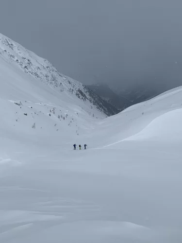 Weil der Engadiner Marathon erneut Corona zum Opfer fiel, machten wir eine spontane Skitour. Geplant wäre gewesen entweder zum Piz Uter oder zum Il Corn. Das Wetter machte aber einen Strich durch die Rechnung und so war unser Ziel die Fuorcla Val Champagna. Die Tour durch das wildromantische Tal hat aber auch bei Nebel und Wind durchaus ihre Reize, denn immerhin waren wir gut vor der Bise geschützt. Gerade noch rechtzeitig kamen wir wieder unten bei Gravatscha an um die Elitelangläufer anzufeuern.