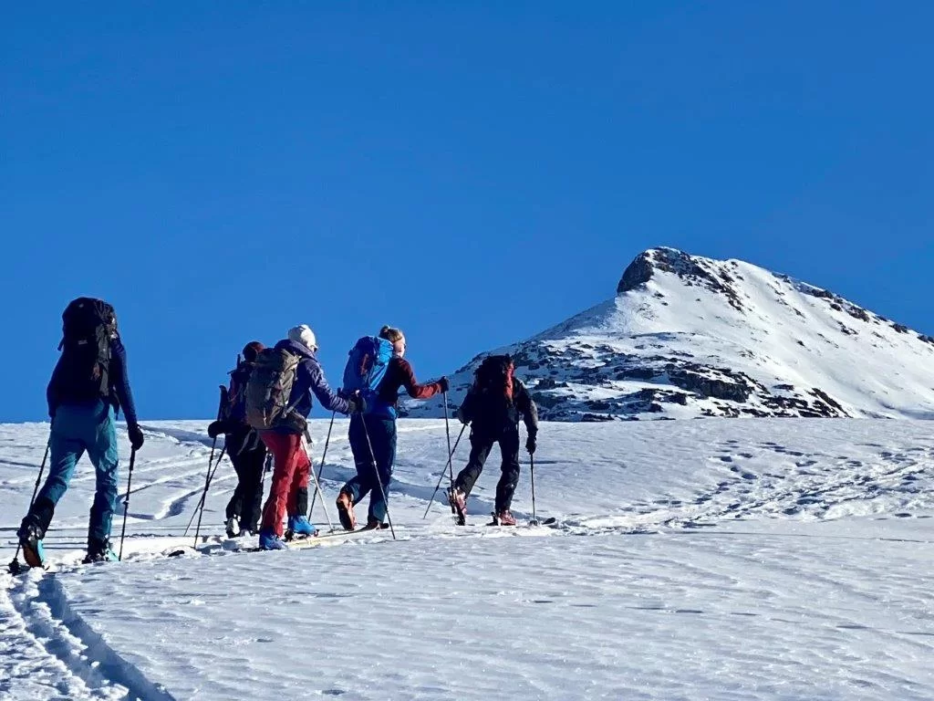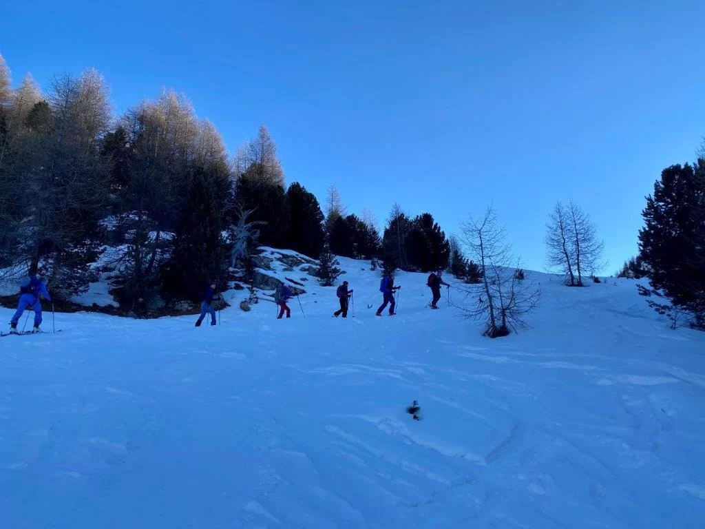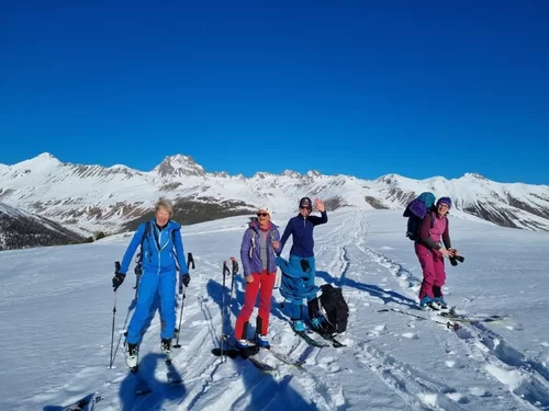 Bei wunderbarem Winterwetter durfte ich 6 Teilnehmerinnen begrüssen. Der 1. Teil des Aufstiegs durch die Waldschneise war etwas Kräftezerrend. Dafür wurden wir mit Sonnenschein und glitzerndem Schnee oben auf der Alp belohnt. Nach kurzer Rast zogen wir mit der Sonne im Gesicht, das weite Gelände ausnutzend, gemütlich unsere Aufstiegsspur Richtung Gipfel.