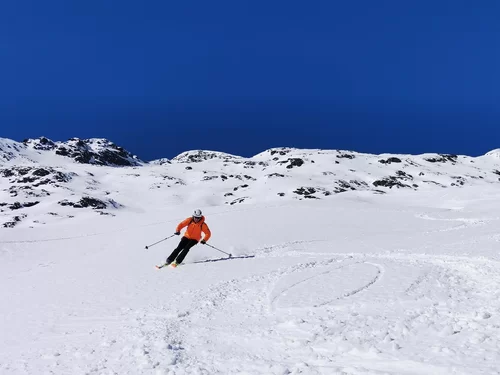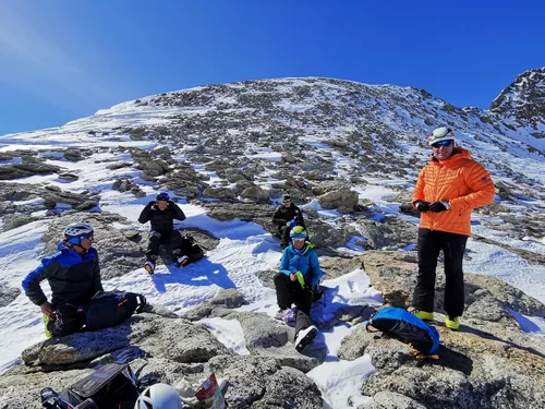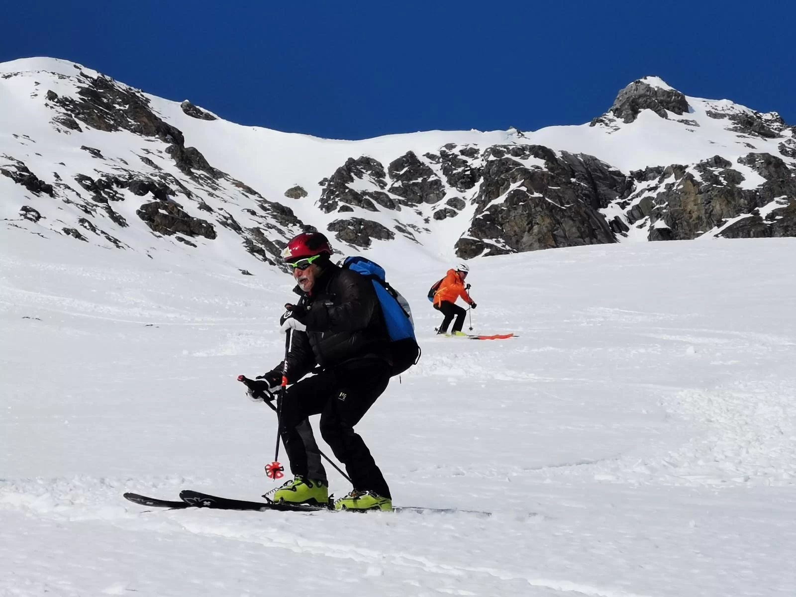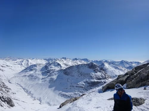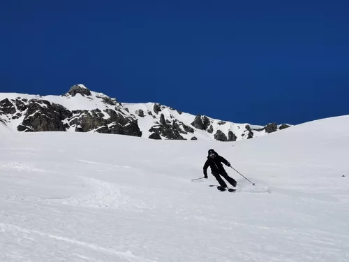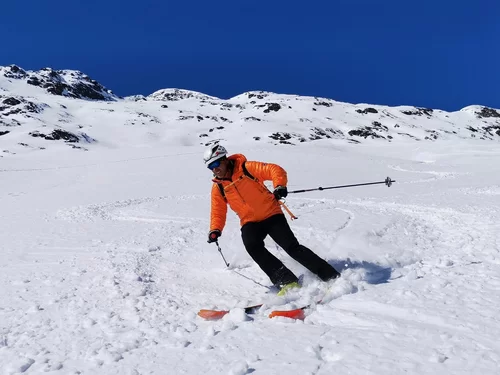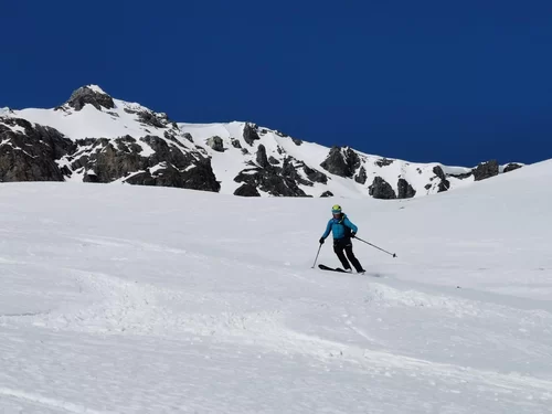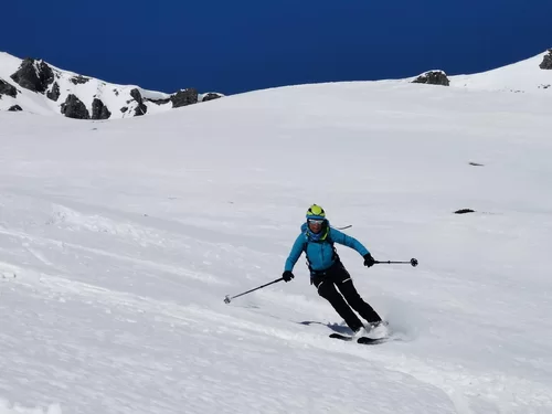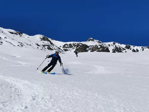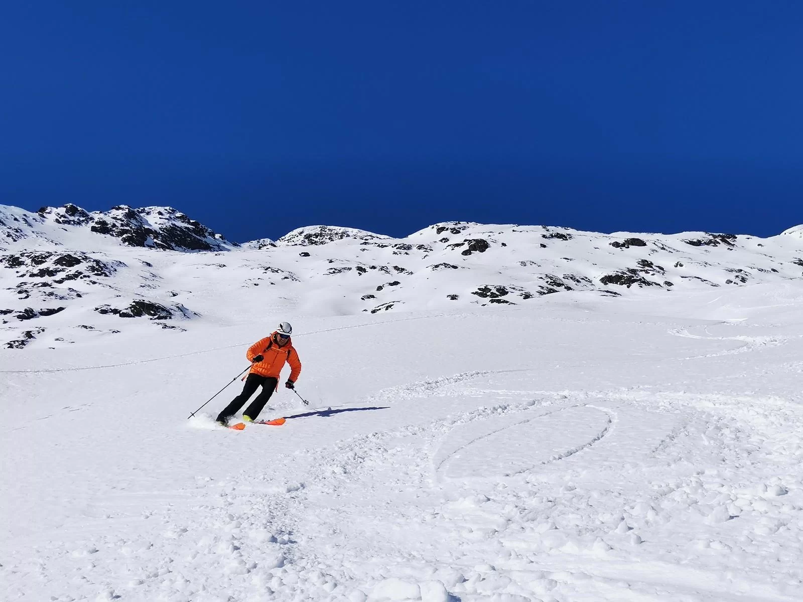 Nach einer sonnigen und aussichtsreichen Gipfelrast machen wir uns auf die Abfahrt. Schon die ersten Schwünge überzeugen mit gutem, lockerem Schnee der nicht vom Wind verzaust worden ist. Die schönen Skihänge bieten genug Platz für schöne Schwünge. Den einen oder anderen Steinkontakt gibt es leider, aber das ist in diesem Winter wohl einfach nicht zu vermeiden... Gegen den Talboden zu wird der Schnee dann etwas krustiger, aber die Abfahrt hat die Erwartungen trotzdem definitiv übertroffen!