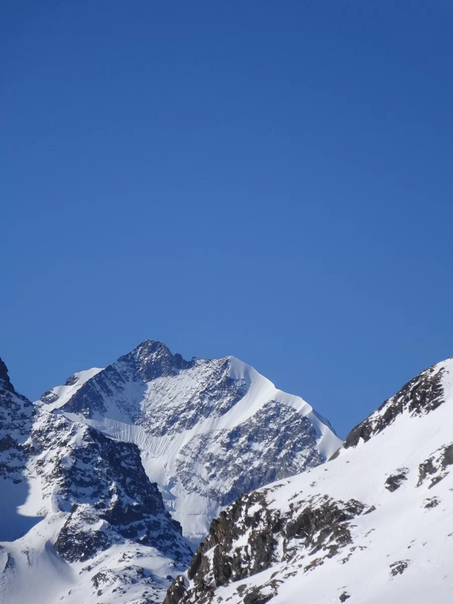 Ohne allzugrosse Erwartungen treffen wir uns um 9 Uhr bei Bernina Suot und beginnen den Aufstieg zum Piz Albris. Der Marsch ins Tal eignet sich zum einlaufen. Aber schon bald geht es auf einer steilen Spur in Richtung Gipfel. Ohne Wind wird es in der Sonne schlagartig warm. Sobald wir den ersten Blick auf den Gipfelhang erhaschen wird klar, dass wir uns heute mit dem Vor-Vorgipfel begnügen werden. Zu steinig und abgeblasen ist es hier oben.