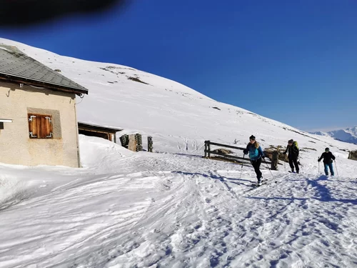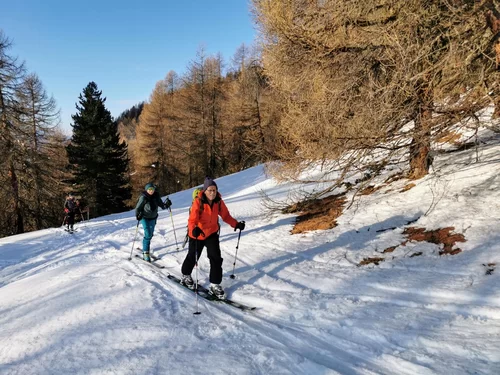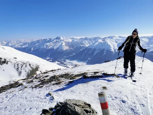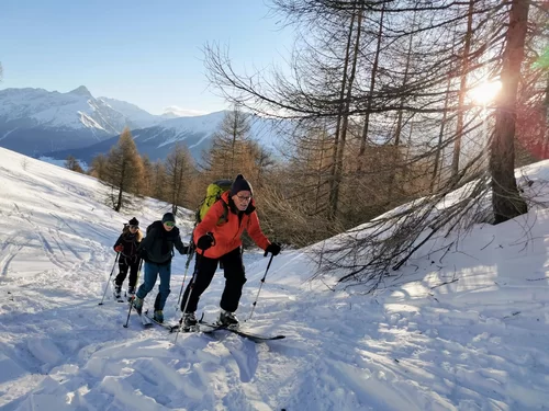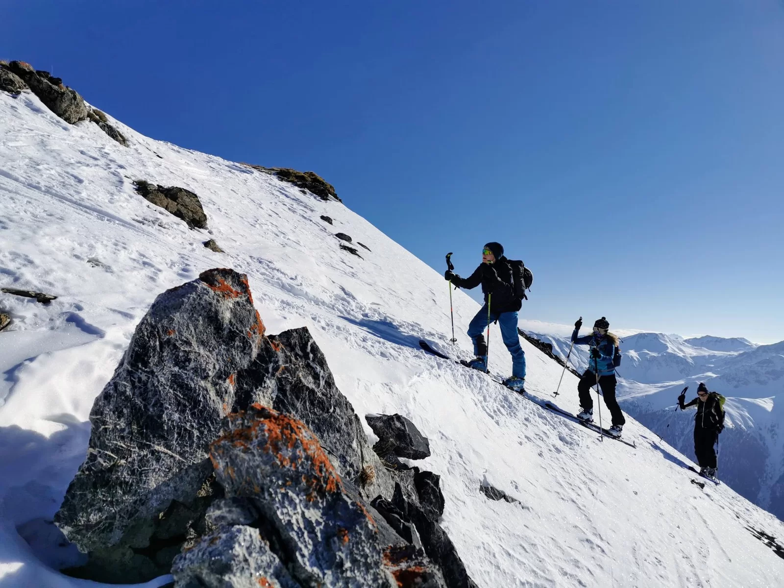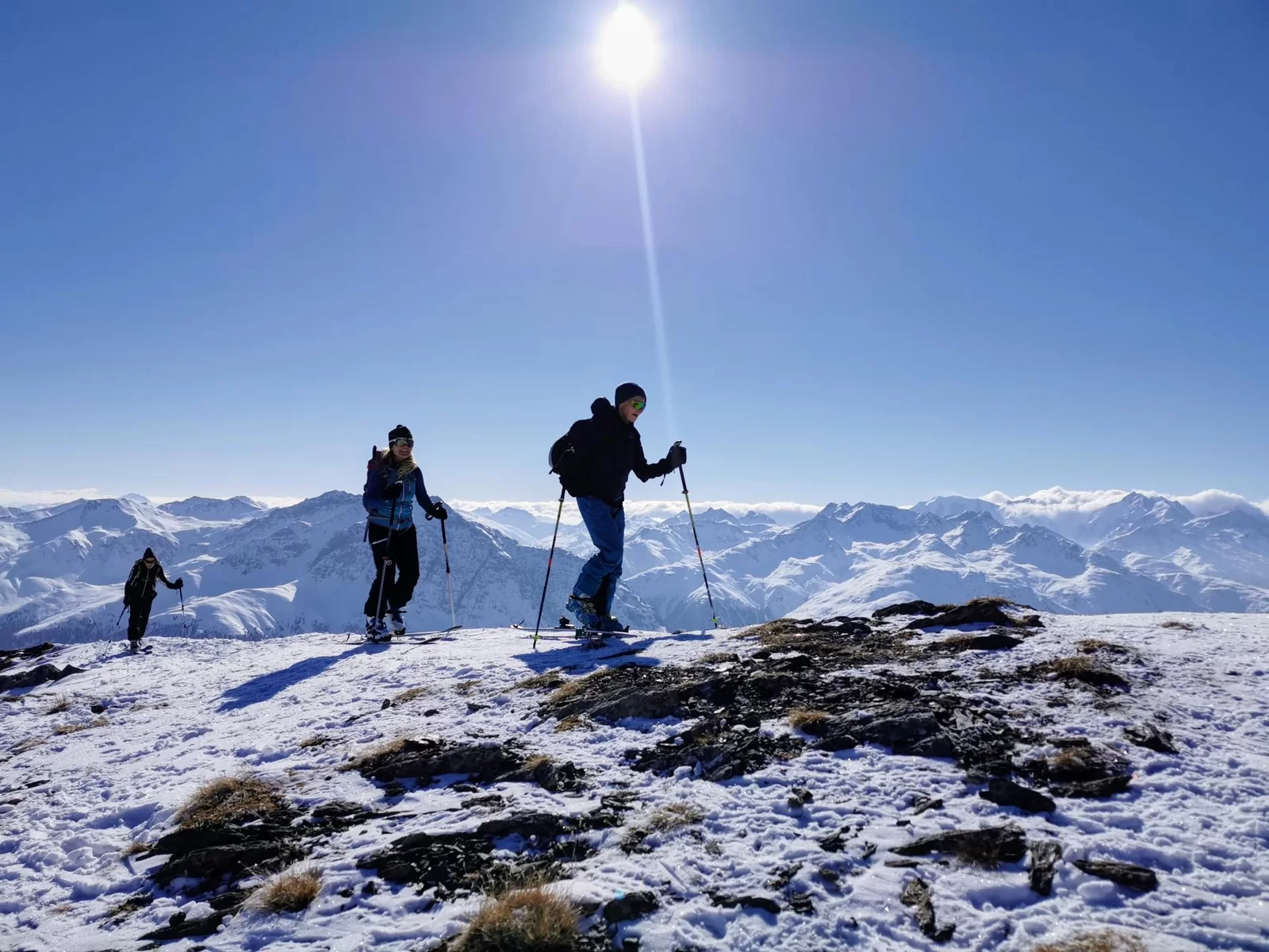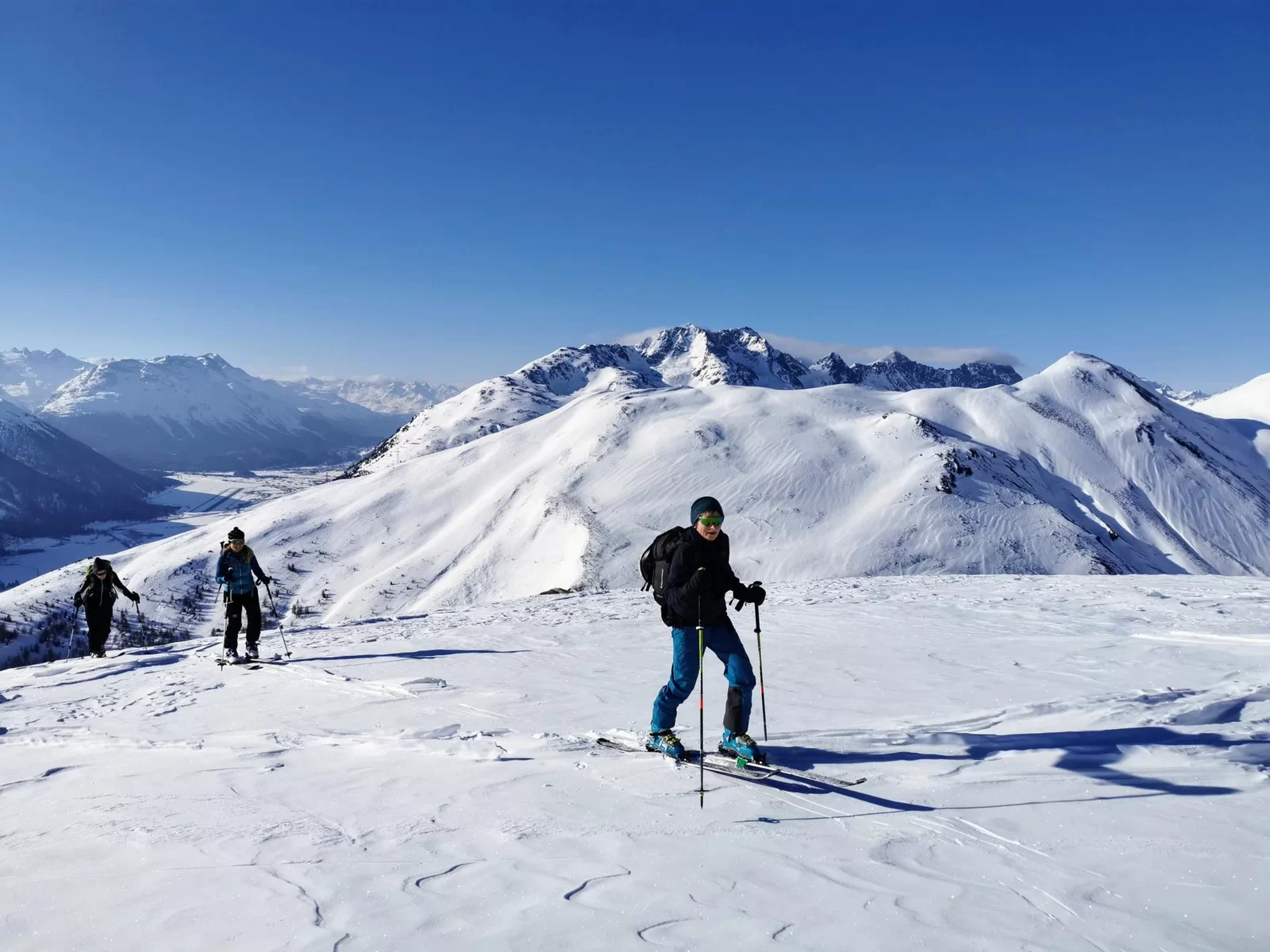 Die Wetterprognose für den heutigen Montag erforderte ein wenig Glück und Geschick bei der Tourenplanung, um die für den Morgen avisierten blauen Störungen zu erwischen. Daher ging es bereits um 7:30 Uhr am Parkplatz vom Bahnhof Madulain los, um den Piz Belvair unter die Ski zu nehmen. Im fahlen Sonnenlicht und bei anfangs noch arktischen Temperaturen starteten wir, um nach anderthalb Stunden und bei strahlendem Sonnenschein die Alp Belvair zu erreichen. Nach kurzer Stärkung und Sonnenbad galt es, die zweite Hälfte des Tagespensums in Angriff zu nehmen, um rechtzeitig vor dem Wetterumschwung wieder im Tal zu sein. Zügig kamen wir voran, bevor dann der stotzige Gipfelhang ausgefeilte Spitzkehrentechnik und ein wenig Akrobatik verlangte. Bei annähernder Windstille und bei noch immer strahlendem Sonnenschein erreichten wir glücklich und zufrieden den Gipfel. Als sich die Wolkenwand von Maloja kommend in einem Affentempo auf uns zuzubewegen begann, galt es abzufellen und umzurüsten. Die Abfahrt erforderte kraftvolle Tiefentlastungen oder alternativ solide Harschdeckelstemmschwünge. Die für einen Montag überraschend zahlreichen Tourengeher, welche uns jetzt noch entgegenkamen, sollten weniger exzellente Sichtverhältnisse vorfinden. Am Parkplatz angekommen, hüllten sich die umliegenden Gipfel nämlich bereits in dicke Wolken. Herzlichen Dank für den schönen Vormittag: Susi, Sonja und Magnus. Sonnige Grüsse - Sebastian