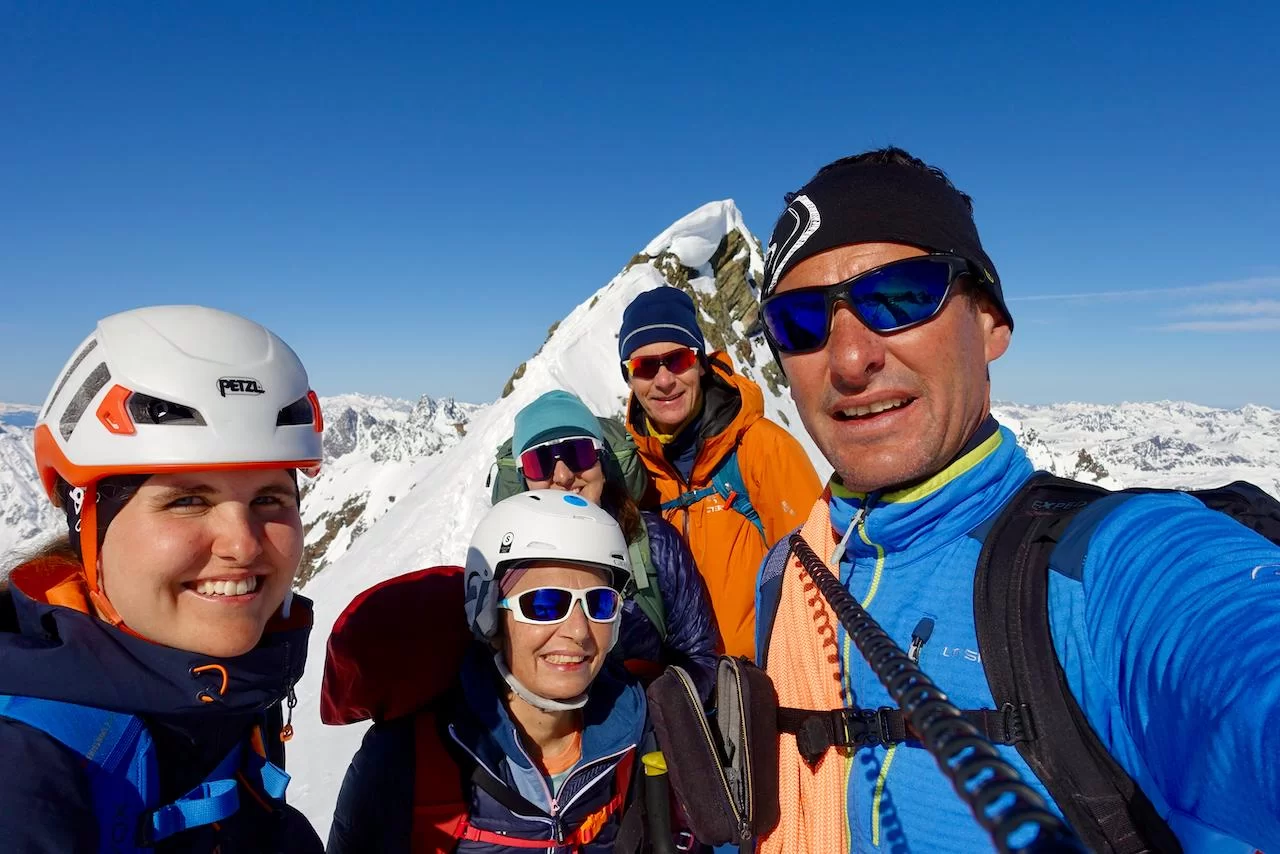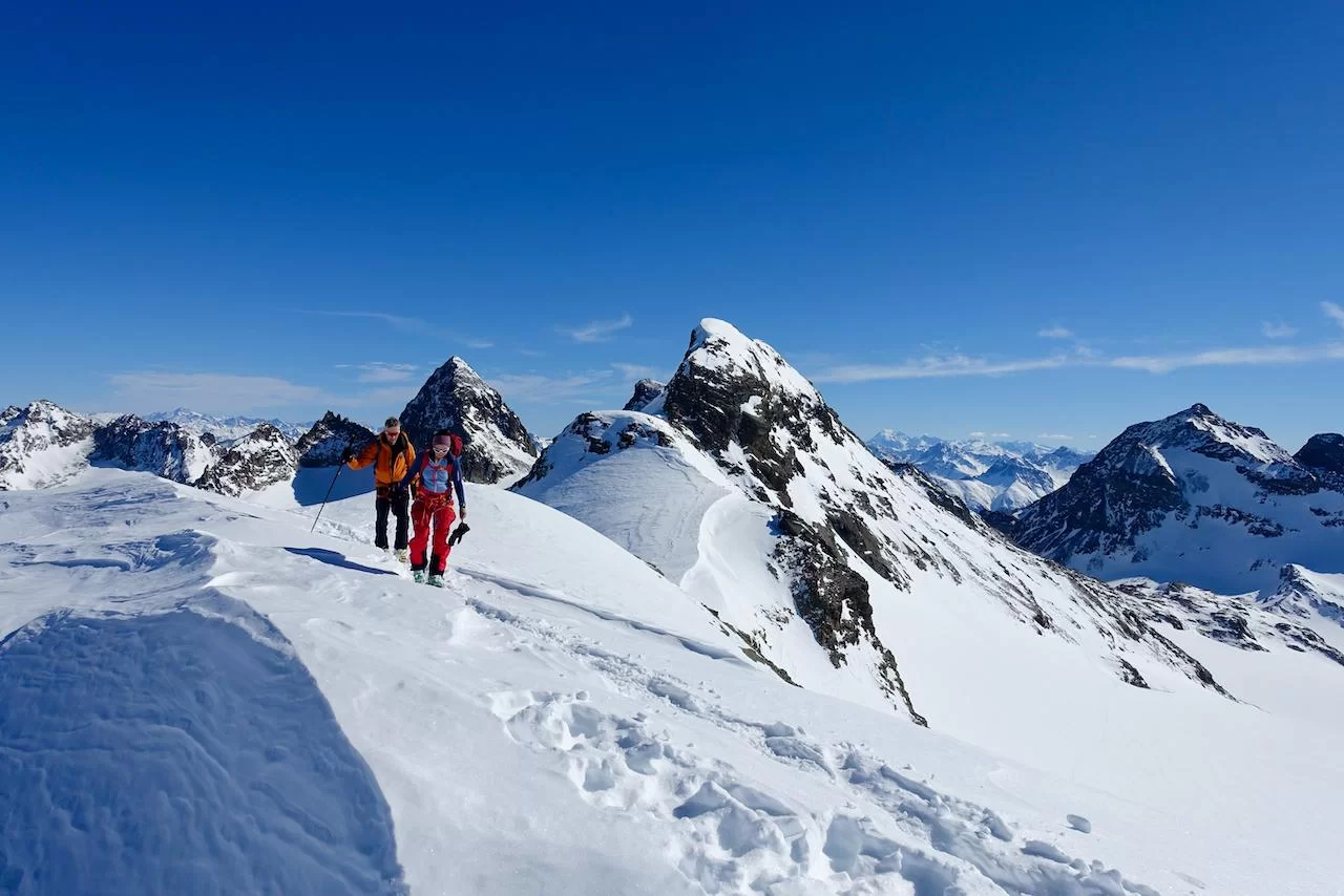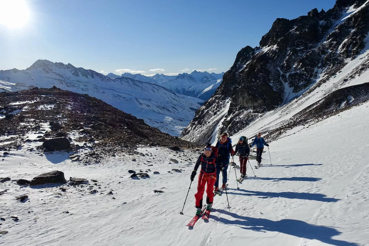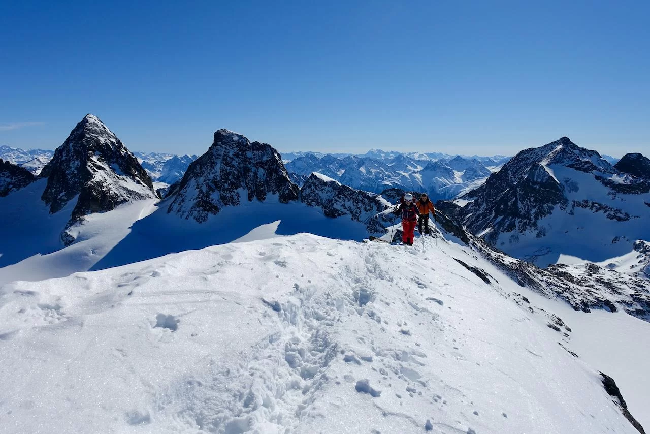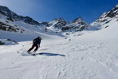 Wetter und Verhältnisse ideal, was will man mehr. Windstill und warm im Aufstieg zum Piz Champatsch am Mittwoch. Gemütlich nahmen wir den Weg zum Gipfel in Angriff und übten uns im steilen Gipfelhang in Spitzkehren. Auf der Nordseite war der Schnee in Gipfelnähe eher Mangelware, so stiegen wir die ersten 60m zu Fuss ab. Danach wurden wir dann umso mehr mit Pulver belohnt. Auch im Couloir runter ins Val Tuoi reichlich und guter Schnee. Abendessen in der Tuoi Hütte wie immer perfekt. Am Donnerstag dann via Plan Rai ins Silvrettagebiet. Signalhorn und Egghorn haben wir ganz alleine gemacht, so schön wenn keine weiteren Tourengänger unterwegs sind. Abfahrt ins Val Lavinuoz und Dank Schlittelbahn bis direkt nach Lavin. Zwei Tourentage in absoluter Einsamkeit. Besten Dank für feine Kameradschaft an Albert, Jacqueline, Julia und Sabine- TL Bert