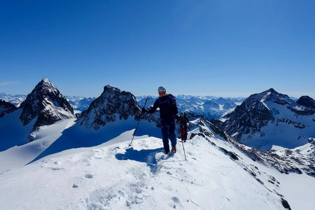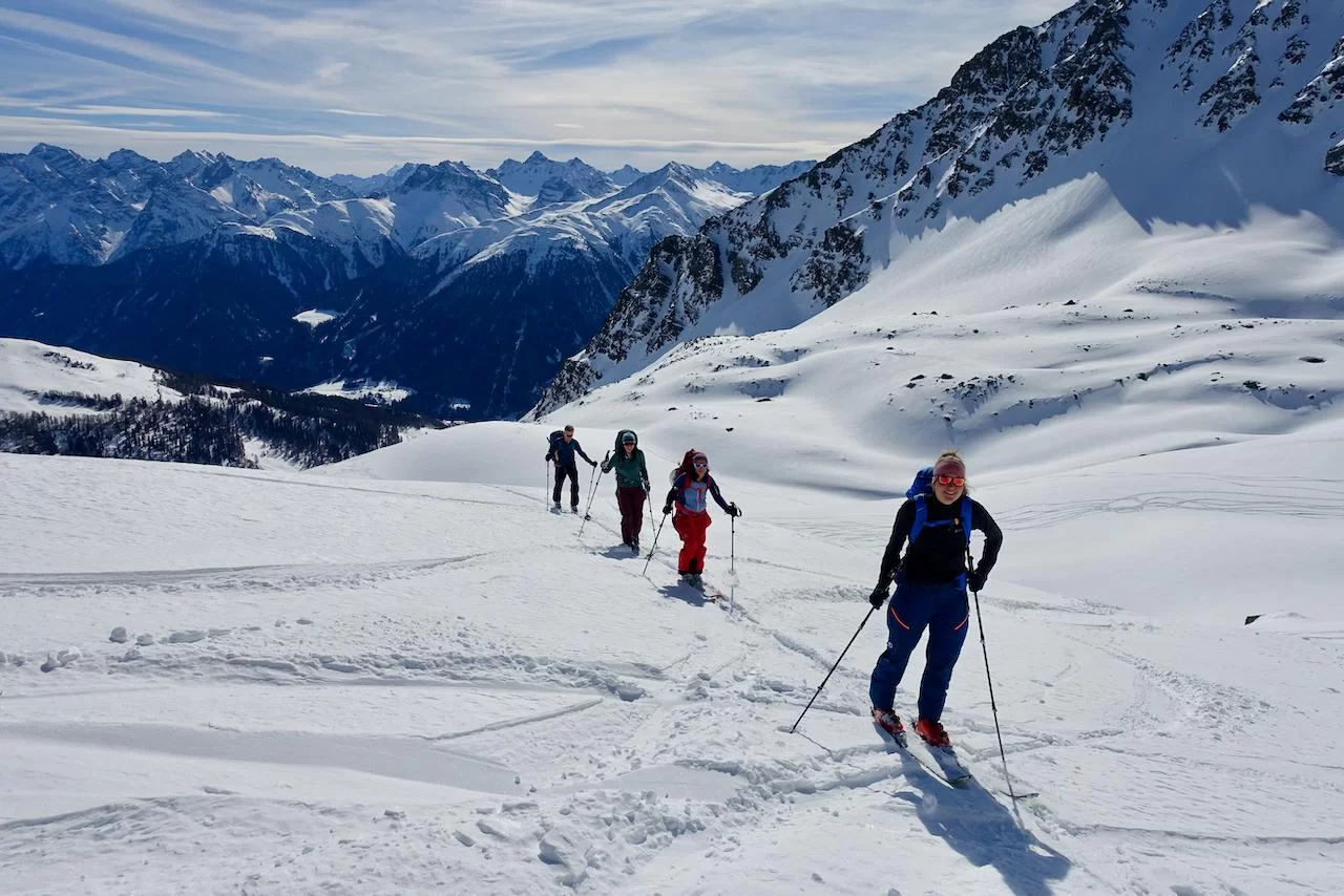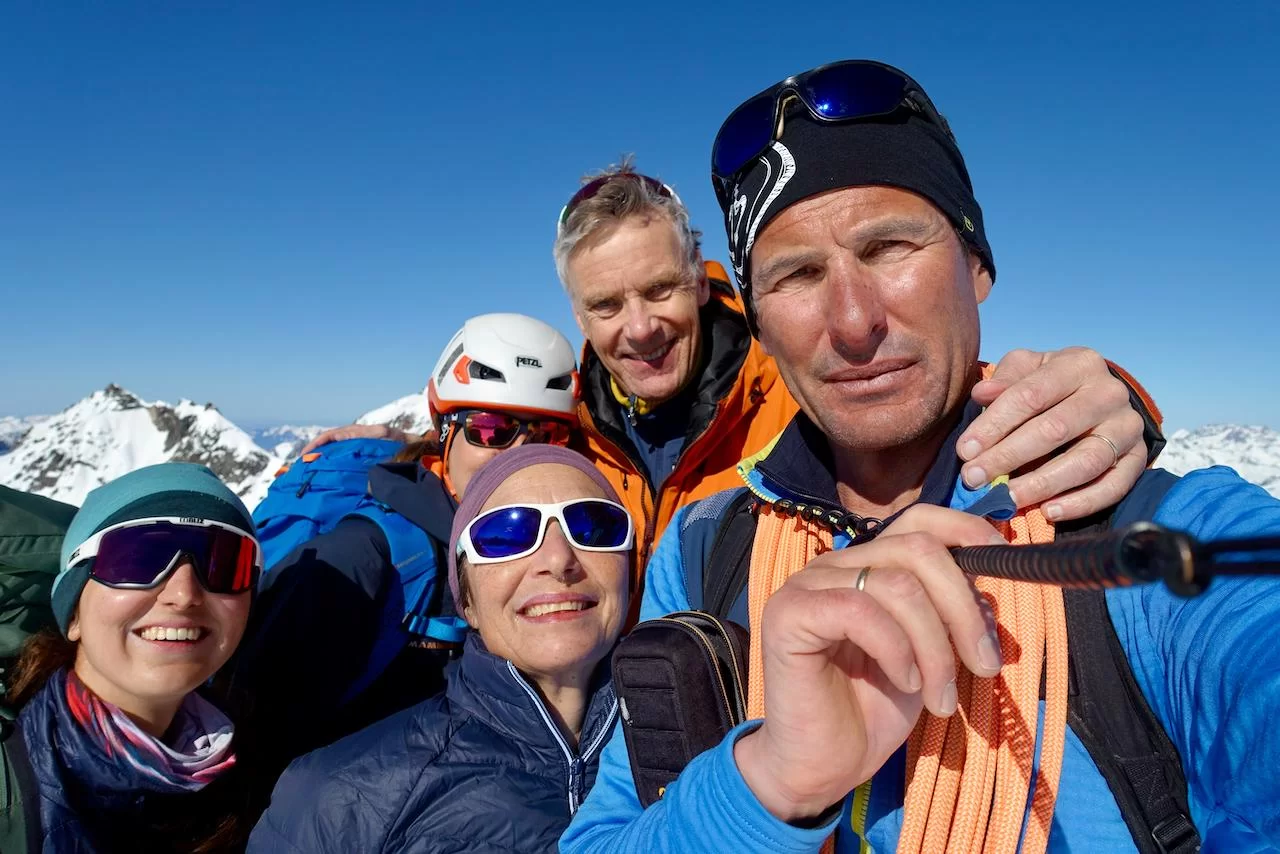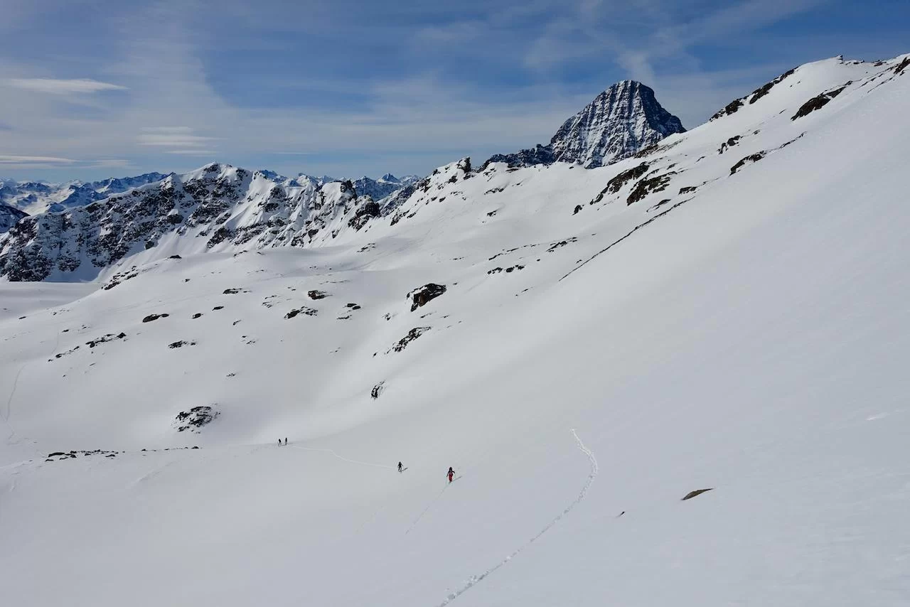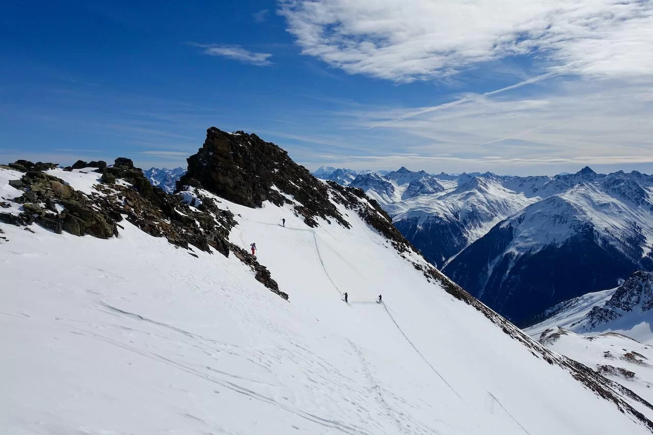 Wetter und Verhältnisse ideal, was will man mehr. Windstill und warm im Aufstieg zum Piz Champatsch am Mittwoch. Gemütlich nahmen wir den Weg zum Gipfel in Angriff und übten uns im steilen Gipfelhang in Spitzkehren. Auf der Nordseite war der Schnee in Gipfelnähe eher Mangelware, so stiegen wir die ersten 60m zu Fuss ab. Danach wurden wir dann umso mehr mit Pulver belohnt. Auch im Couloir runter ins Val Tuoi reichlich und guter Schnee. Abendessen in der Tuoi Hütte wie immer perfekt. Am Donnerstag dann via Plan Rai ins Silvrettagebiet. Signalhorn und Egghorn haben wir ganz alleine gemacht, so schön wenn keine weiteren Tourengänger unterwegs sind. Abfahrt ins Val Lavinuoz und Dank Schlittelbahn bis direkt nach Lavin. Zwei Tourentage in absoluter Einsamkeit. Besten Dank für feine Kameradschaft an Albert, Jacqueline, Julia und Sabine- TL Bert
