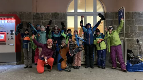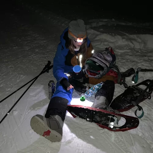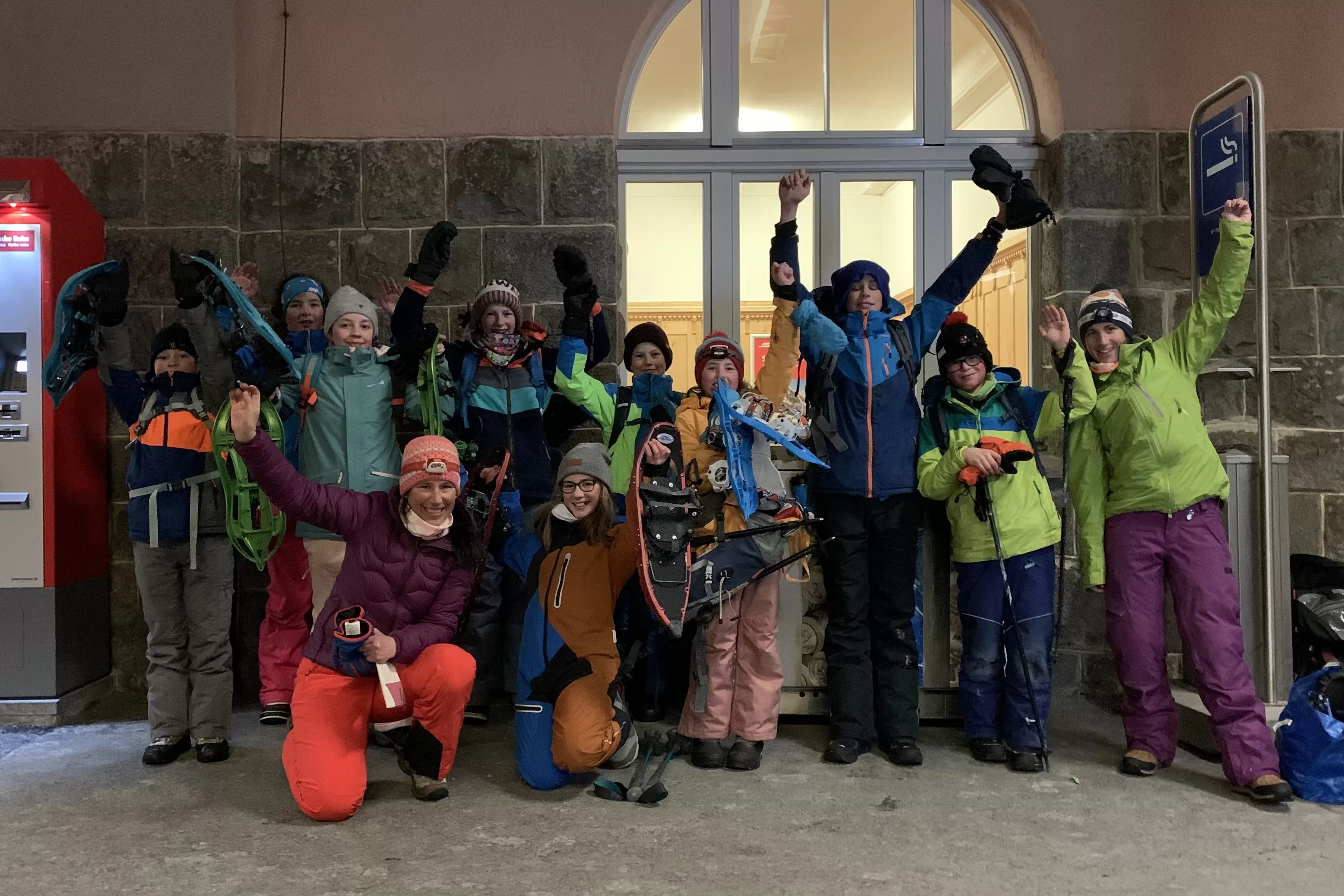 Zu neunt, mit zwei Leiterinnen, sind wir von Pontresina steil mit unseren Schneeschuhen den Wald hoch nach Alp Staz. Es war so steil, dass wir sogar die Steighilfen der Schneeschuhe aufklappen mussten! Die, die schneller waren versteckten sich im Dunkeln hinter den Bäumen und erschreckten die anderen. Als wir oben ankamen waren wir alle froh... Wir packten unsere Marenda aus und bewunderten die mondbeschienene Ebene. Einige erkannten sogar Sternzeichen am Sternenhimmel. Danach sausten wir auf unseren Schaufeln den Wald wieder hinunter nach Pontresina. Was für ein Spass!