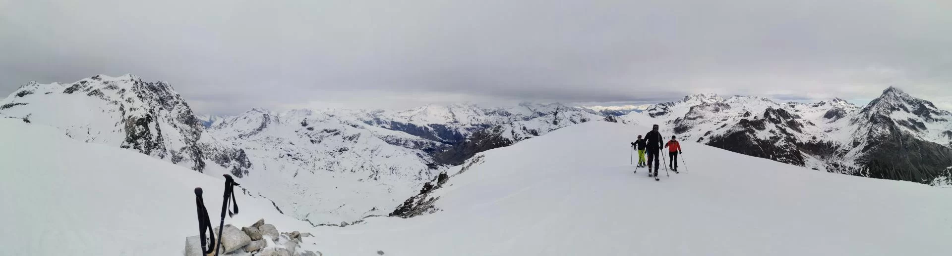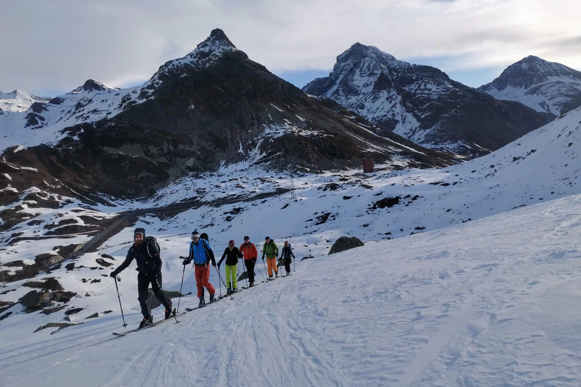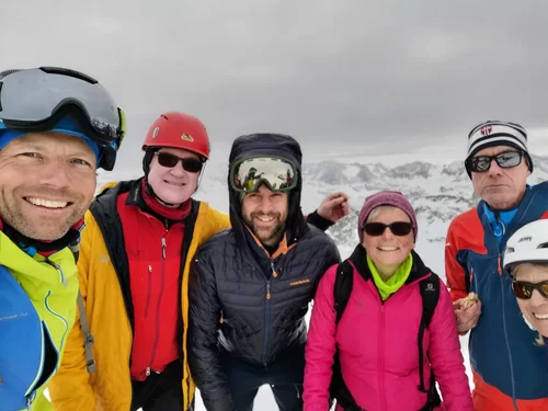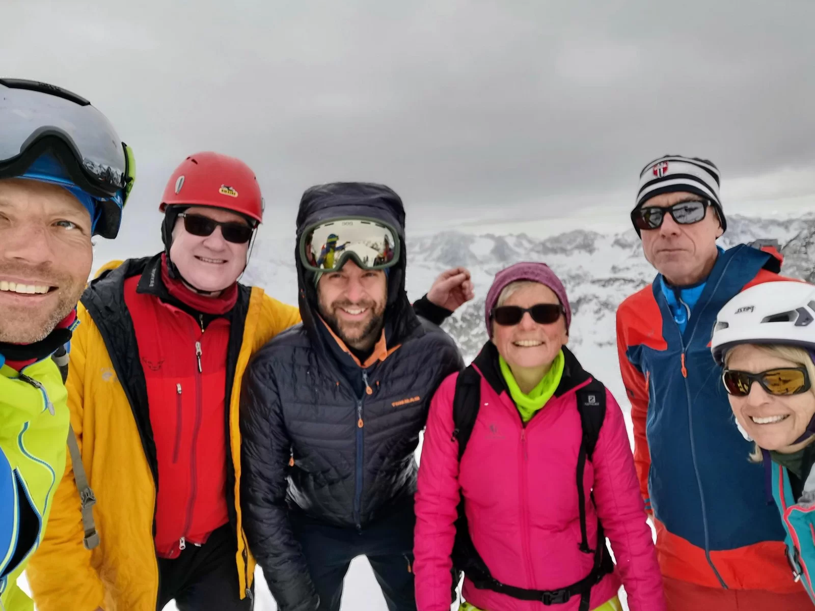 Ohne ein einziges Mal die Ski abziehen zu müssen - in dieser Saison beinahe eine Besonderheit - erreichten wir nach knapp zwei Stunden den Gipfel. Auf dem Weg dorthin übten wir ausgiebig das Harscheisengehen, während uns sogar einige verirrte Sonnenstrahlen verwöhnten. Von oben genossen wir die Fernsicht unterhalb der Wolkendecke über uns und beobachteten die heutigen Besucher des Piz Lagrev sowie die Spätstarter in Richtung Fuorcla Grevasalvas.
