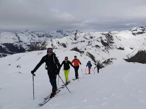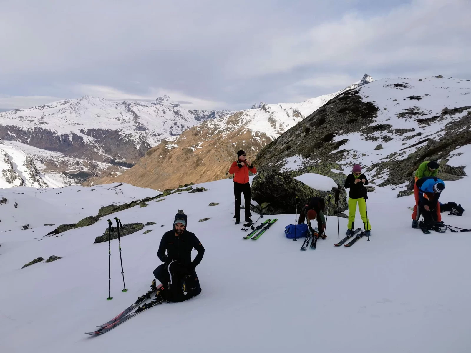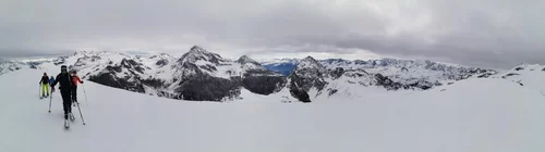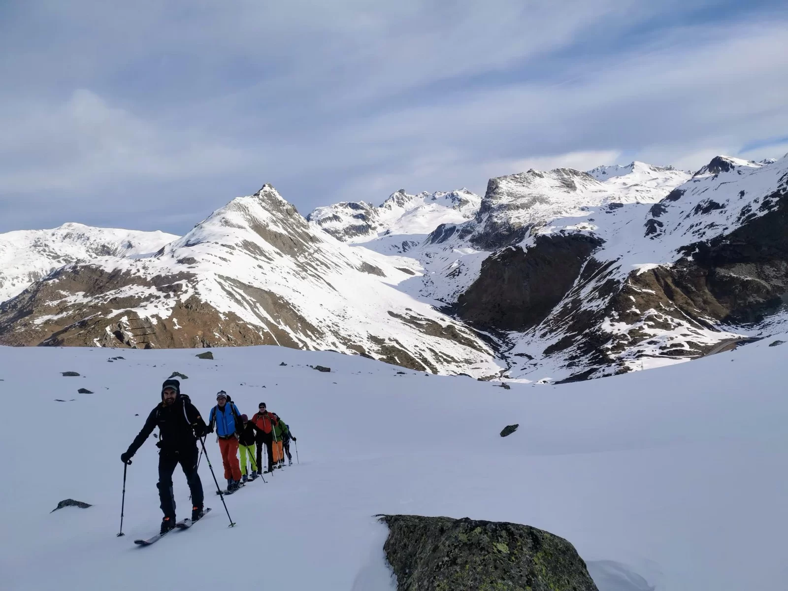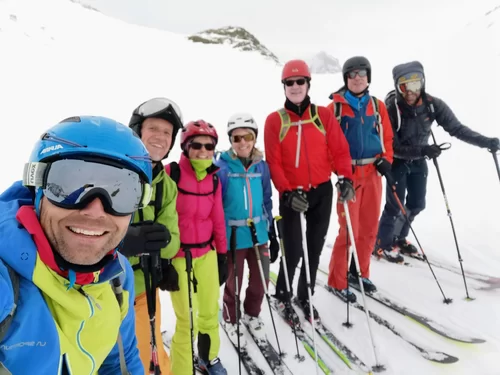 Ohne ein einziges Mal die Ski abziehen zu müssen - in dieser Saison beinahe eine Besonderheit - erreichten wir nach knapp zwei Stunden den Gipfel. Auf dem Weg dorthin übten wir ausgiebig das Harscheisengehen, während uns sogar einige verirrte Sonnenstrahlen verwöhnten. Von oben genossen wir die Fernsicht unterhalb der Wolkendecke über uns und beobachteten die heutigen Besucher des Piz Lagrev sowie die Spätstarter in Richtung Fuorcla Grevasalvas.