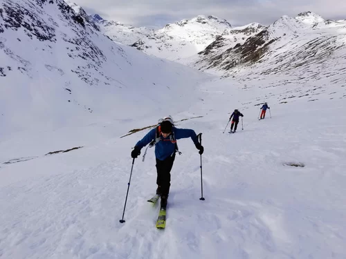 Bei frühlingshaften Temperaturen starteten wir unsere Reise ins Val da Fain in Richtung Italien. Aufgrund des chronischen Neuschneemangels kamen wir auf pistenähnlichen Verhältnissen zügig bis zur Alp la Stretta voran, wo wir eine ausgiebige Rast einlegten.