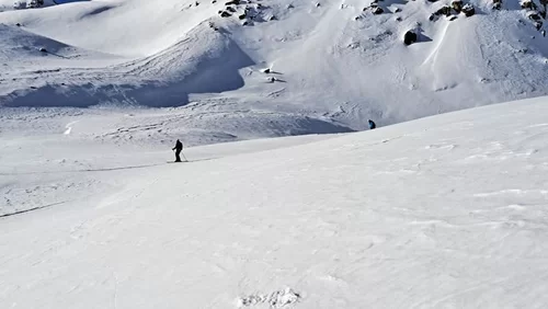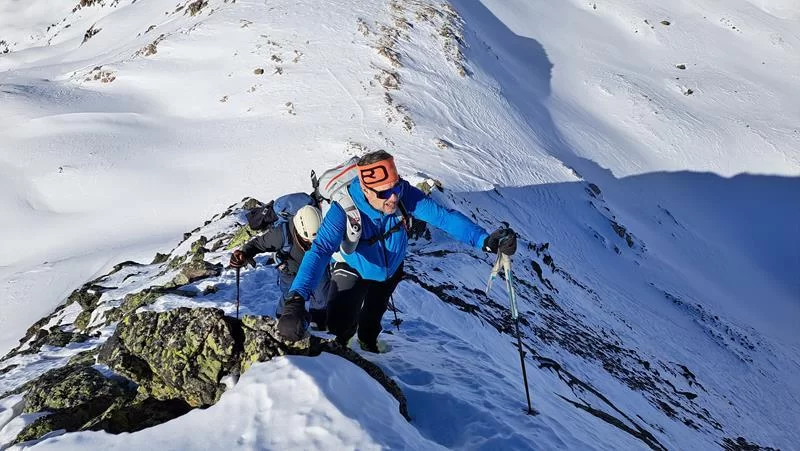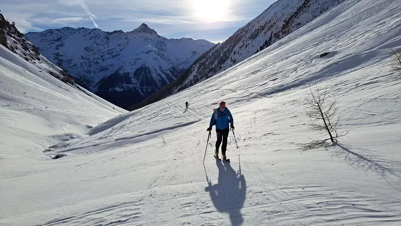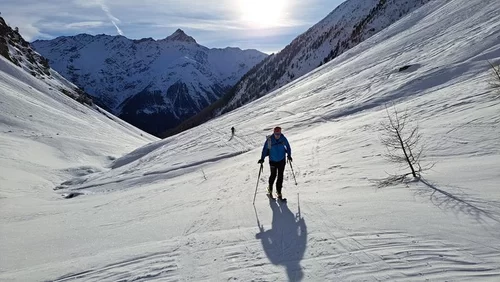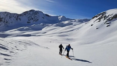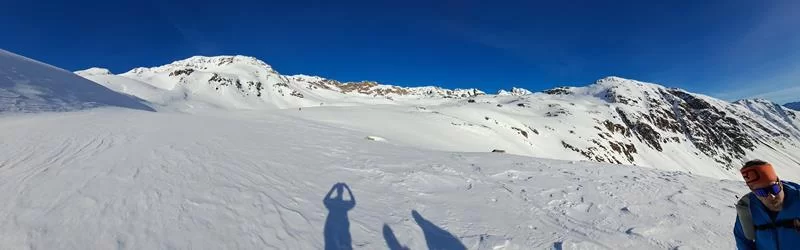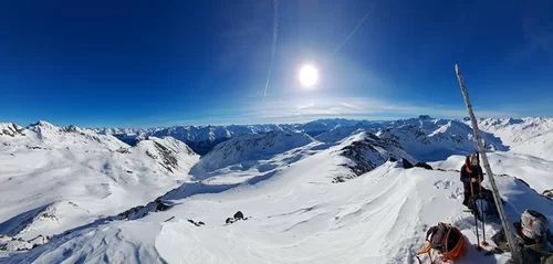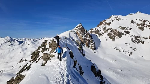 Heute waren wir nur eine kleine Gruppe. Um halb 9 sind wir in Cinuos-chel in Richtung Val Punt Ota gestartet. Zunächst dem Alpweg entlang hinauf, dann über die sonnigen Hänge weiter zum Skidepot. Dank der windbearbeiteten Oberfläche kamen wir zügig voran bis zum Skidepot. Von hier in einem kurzen Aufstieg zum Gipfel, den wir zur Mittagszeit erreichten. Die Abfahrt bot ein pistenähnliches Fahrgefühl...