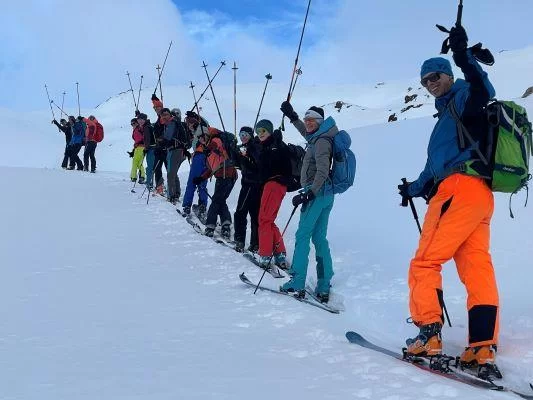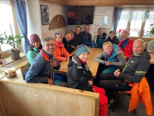 Zwölf Teilnehmende sowie die TL Duri und Christian, ab der Alp Güglia. Das unsichtbare Tourengruppenmitglied namens ChatGPT hörte uns beim munteren Kaffee in der Veduta zu, und schrieb, von Sandra unterstützt, die Zeilen hier oben, noch bevor der Kaffee bezahlt war. Dank an Günther für die Getränke und an alle. Im Bericht zu kurz gekommen ist gegen Schluss der blaue Himmel, Sonnenschein, guter Pulver in den Osthängen und die prächtige „Stabilität“ auf den Skiern...