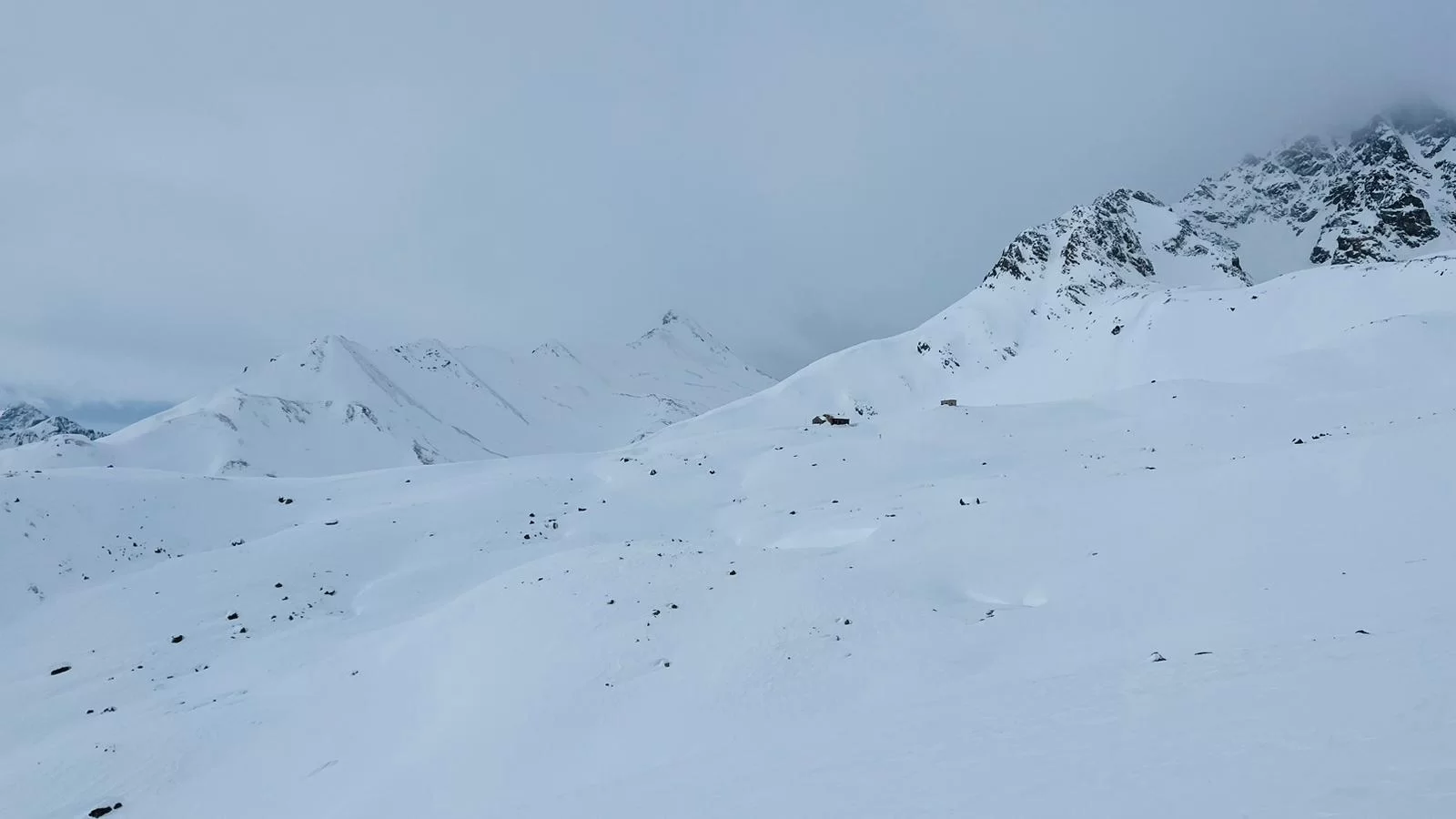 Kontrastprogramm zu den vergangenen Tagen: Stürmisch, verhangener Himmel, keine Sicht und Krustenschnee