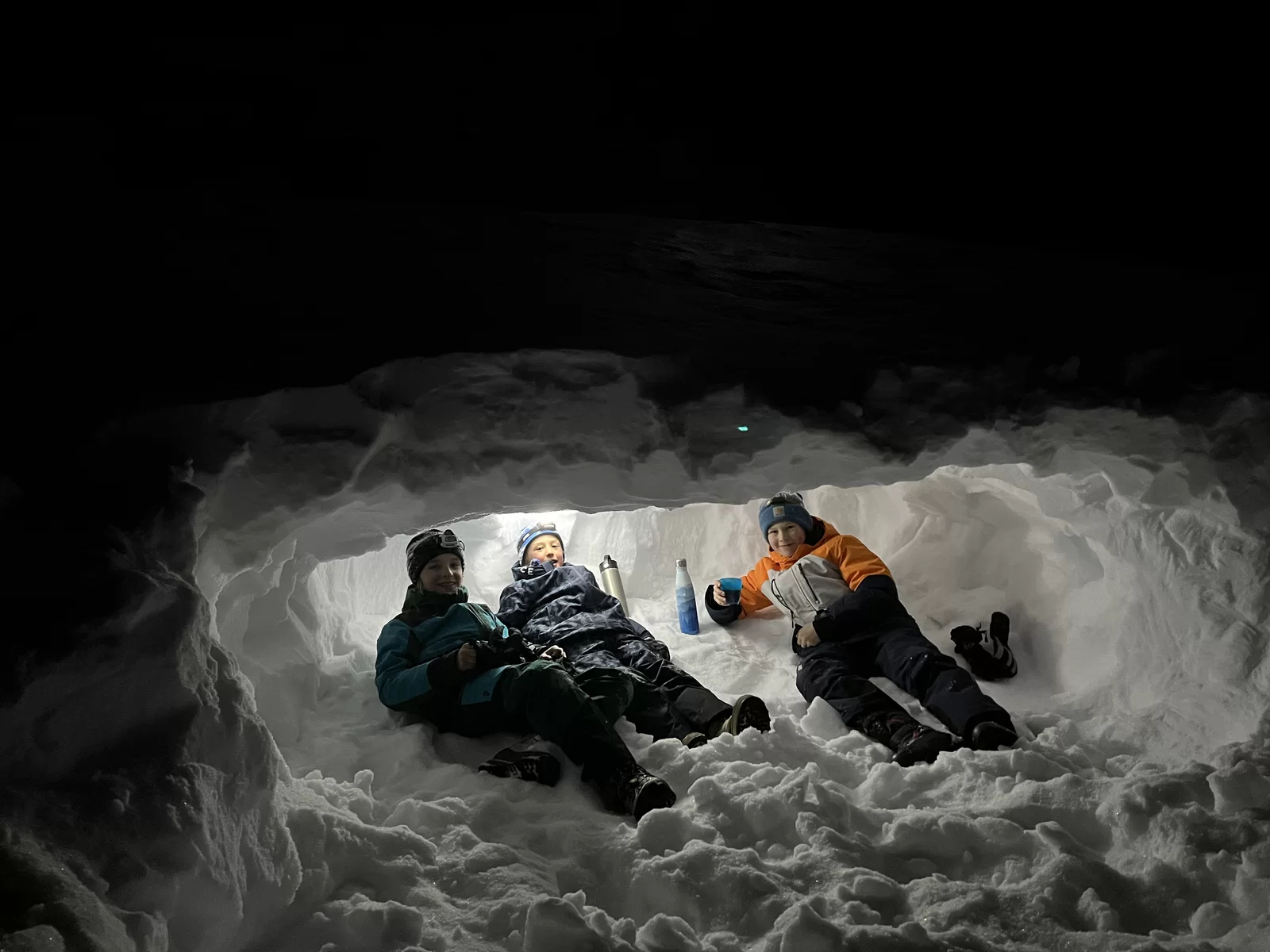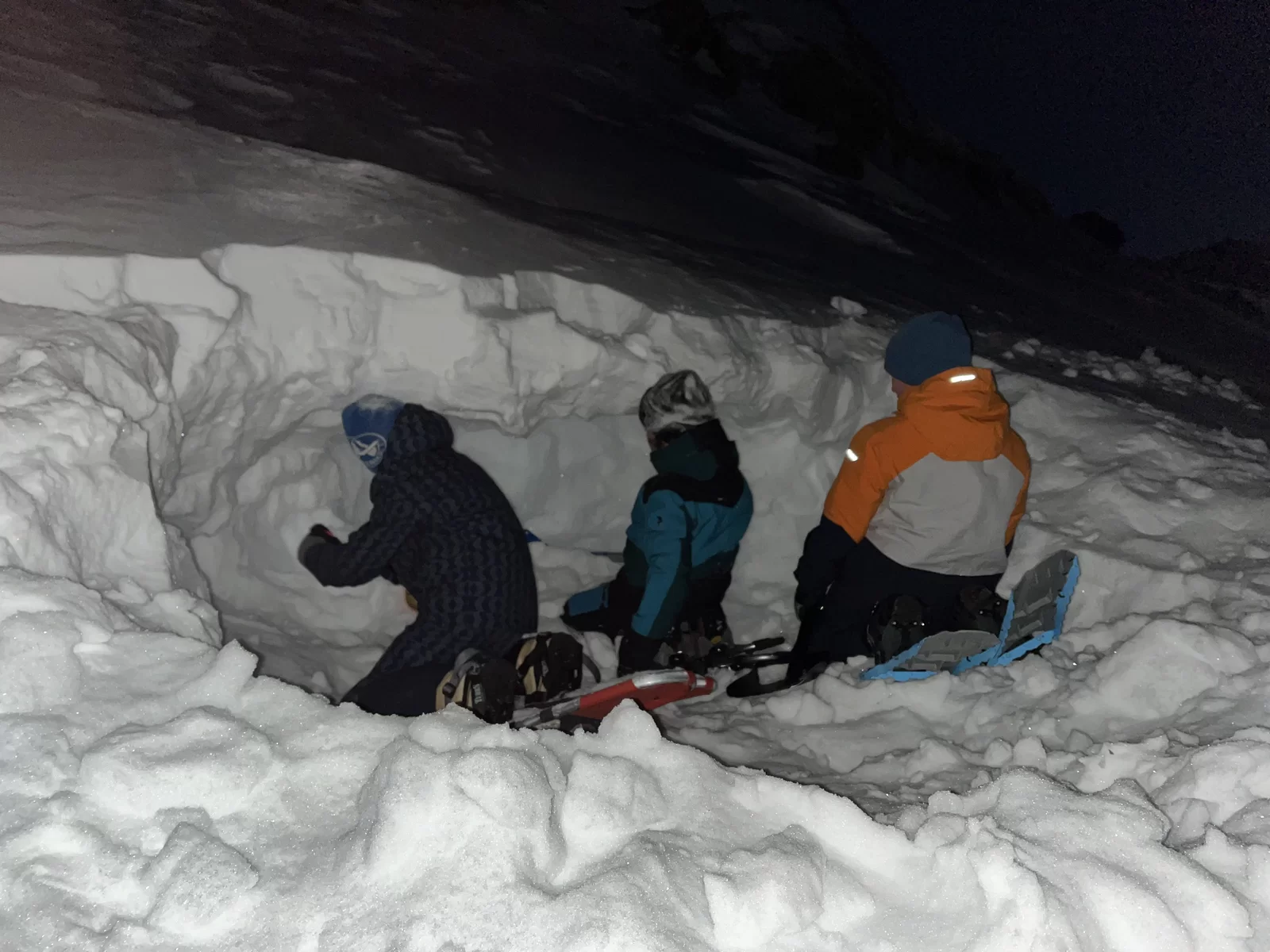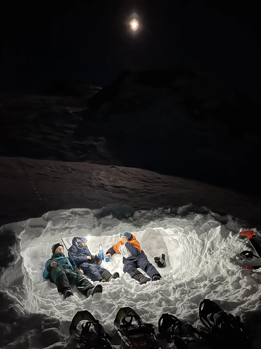 Am Samstagabend fuhren wir auf Muottas Muragl. Wir wanderten mit unseren Schneeschuhen in Richtung Lej Muragl. Der Vollmond beschien unseren Weg, sodass wir nicht einmal die Stirnlampen brauchten. Nach einer Weile hielten wir an und bauten eine Schneehöhle. In der Schneehöhle waren wir gut vom Wind geschützt. Danach rutschten wir auf Schneeblöcken den Hang hinunter. Was für ein Spass!