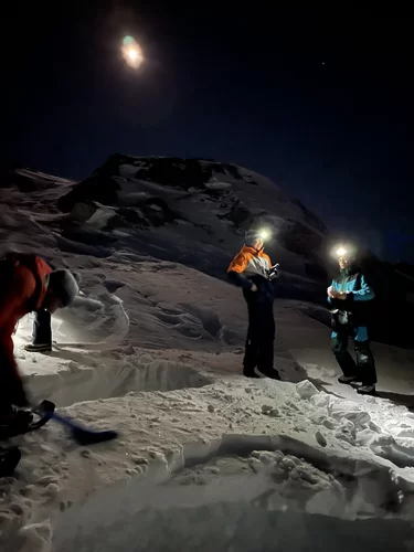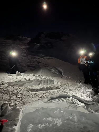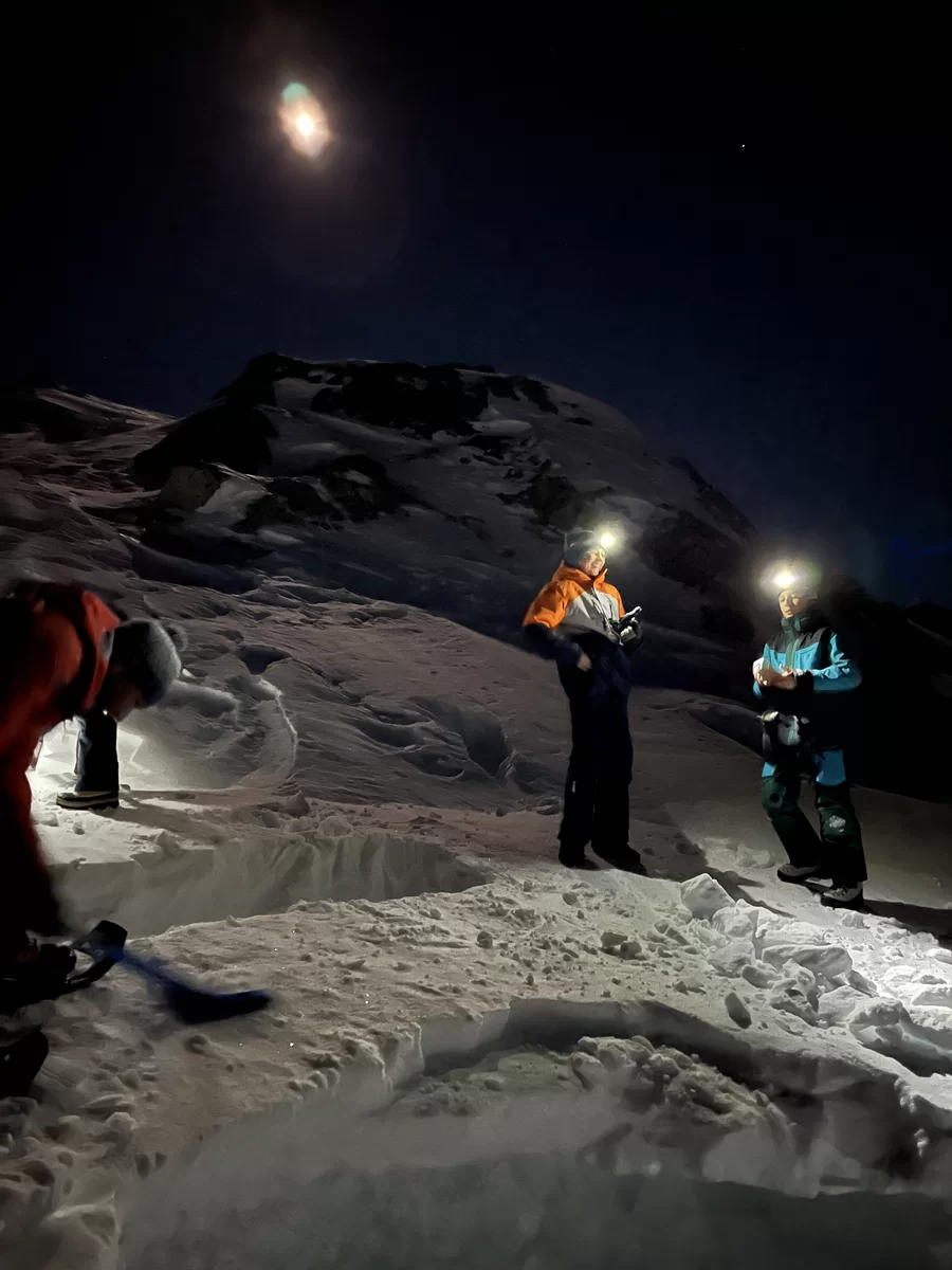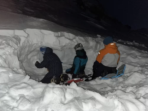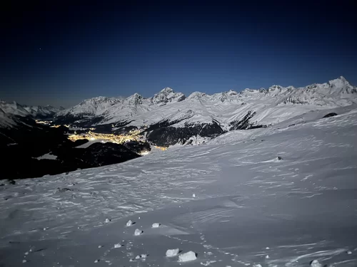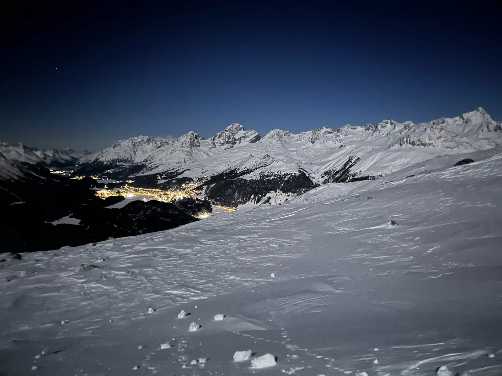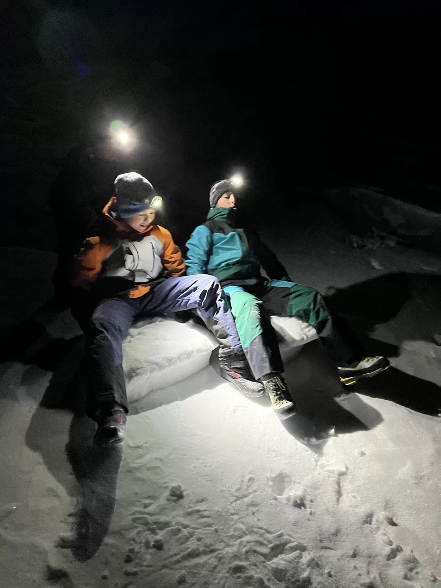 Am Samstagabend fuhren wir auf Muottas Muragl. Wir wanderten mit unseren Schneeschuhen in Richtung Lej Muragl. Der Vollmond beschien unseren Weg, sodass wir nicht einmal die Stirnlampen brauchten. Nach einer Weile hielten wir an und bauten eine Schneehöhle. In der Schneehöhle waren wir gut vom Wind geschützt. Danach rutschten wir auf Schneeblöcken den Hang hinunter. Was für ein Spass!