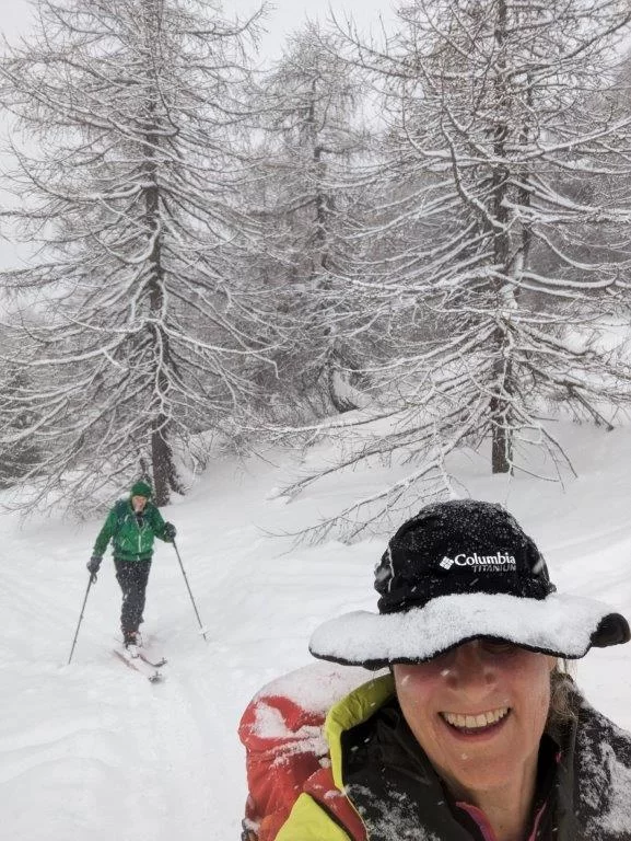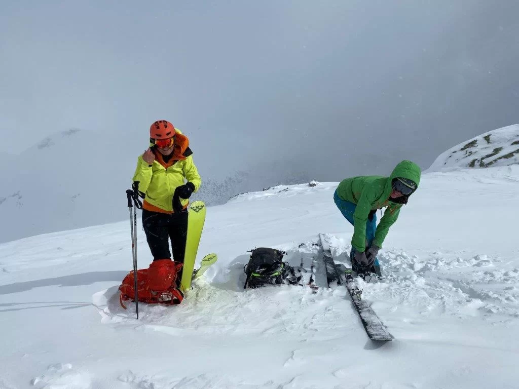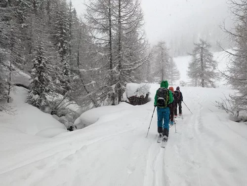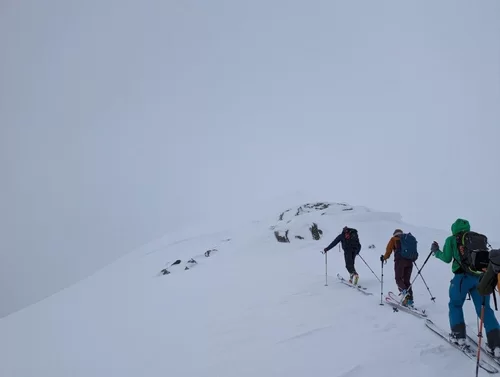 Trotz Schneefall starteten wir zu siebt in La Punt beim neuen Werkhof. Im Wald war es richtig winterlich, schön still und ruhig. Als wir in die Nähe der Hochspannungsleitung kamen, hörten wir, wie der Strom durch die Leitung rauschte..... Da die Sicht nicht so schlecht war, entschieden wir bei der Trinkpause weiter aufzusteigen. Auf dem Grat angekommen, ca. 200 Hm vor Gipfel blies der Wind richtig stürmisch, sodass wir entschieden, abzufellen und abzufahren. Weg vom Grat, schon liess der Wind nach und wir fuhren bei den zwischenzeitlichen Aufhellungen ab.
