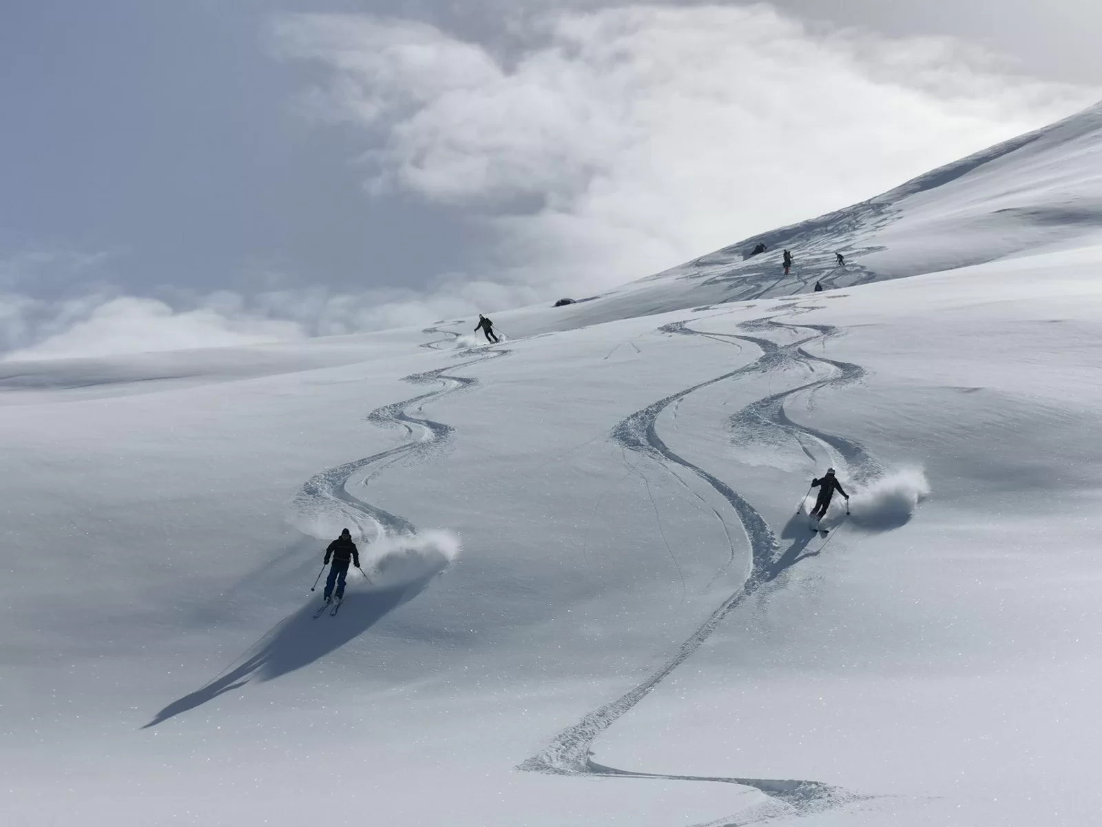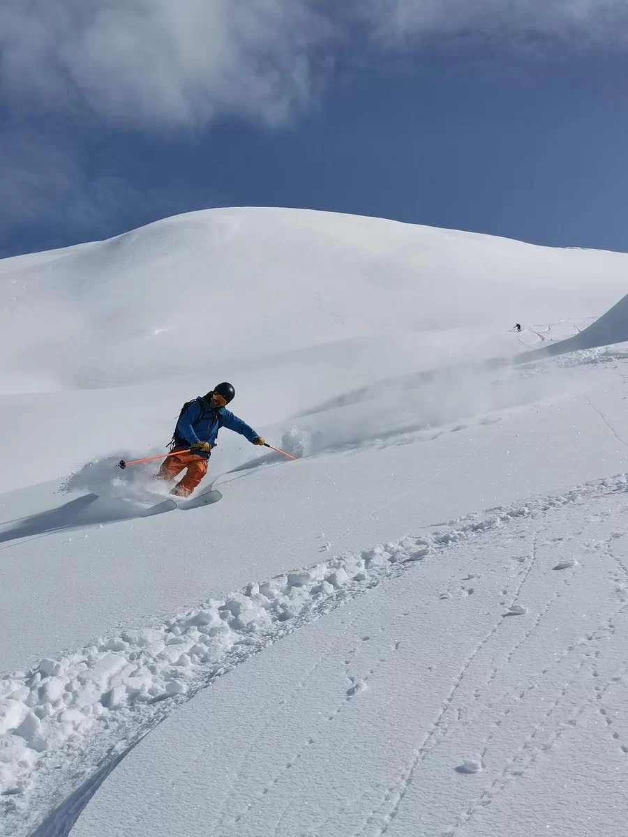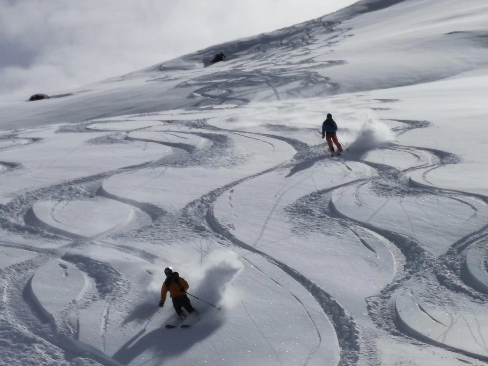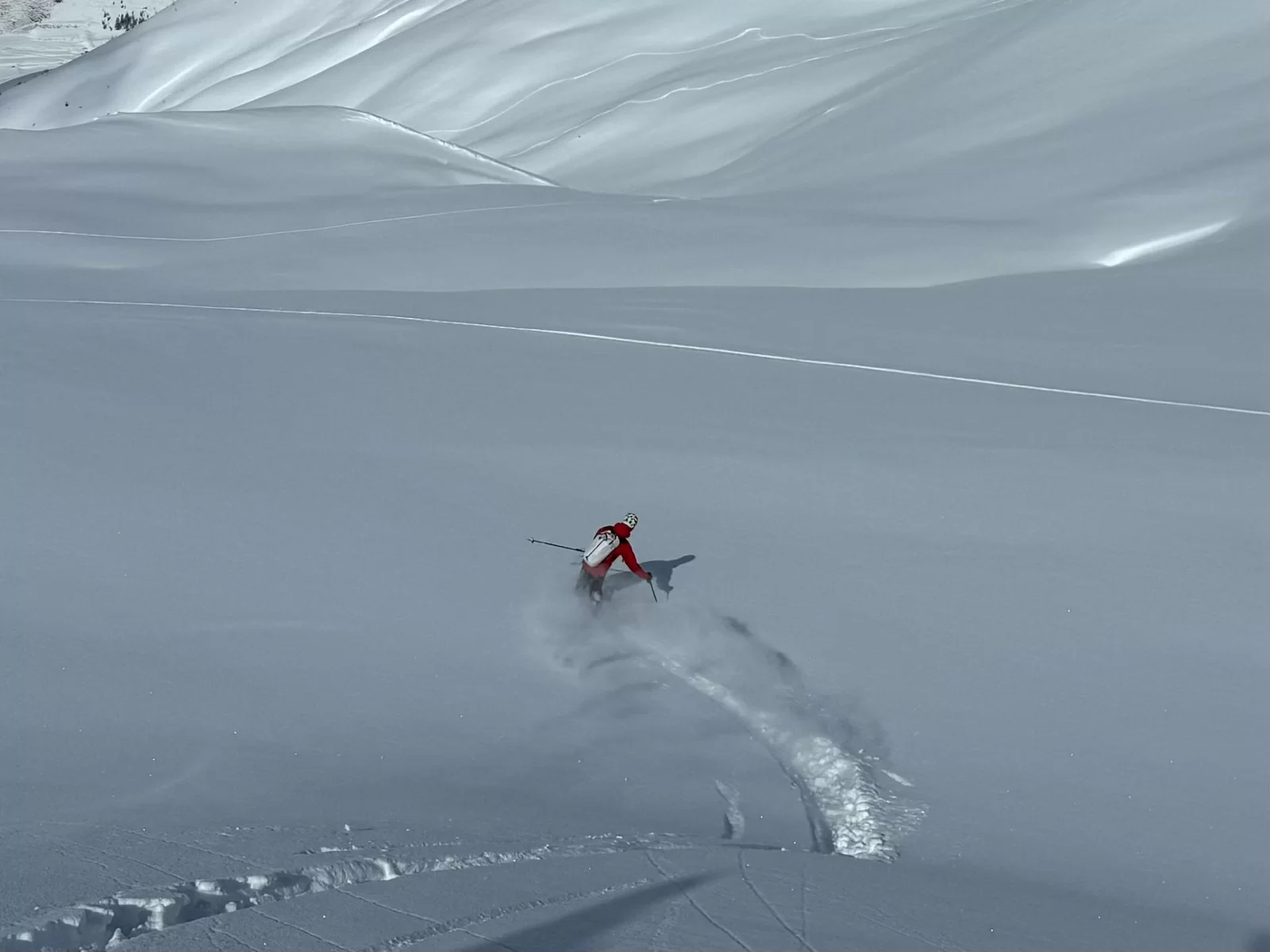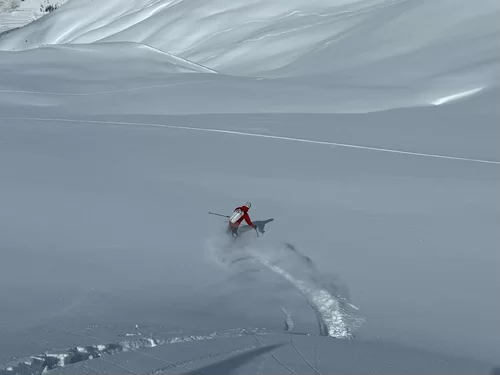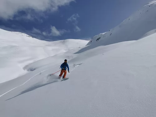 Die Abfahrt bietet dann nordseitig im oberen Teil vollig unerwartet Champagner-Powder, bevor der Schnee dann unterhalb 2300m gedeckelt ist. Nach einem kleinen Gegenanstieg geht es im Sulz hinunter zur Alp Arpiglia und auf der Fahrstrasse runter nach Resgia.