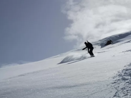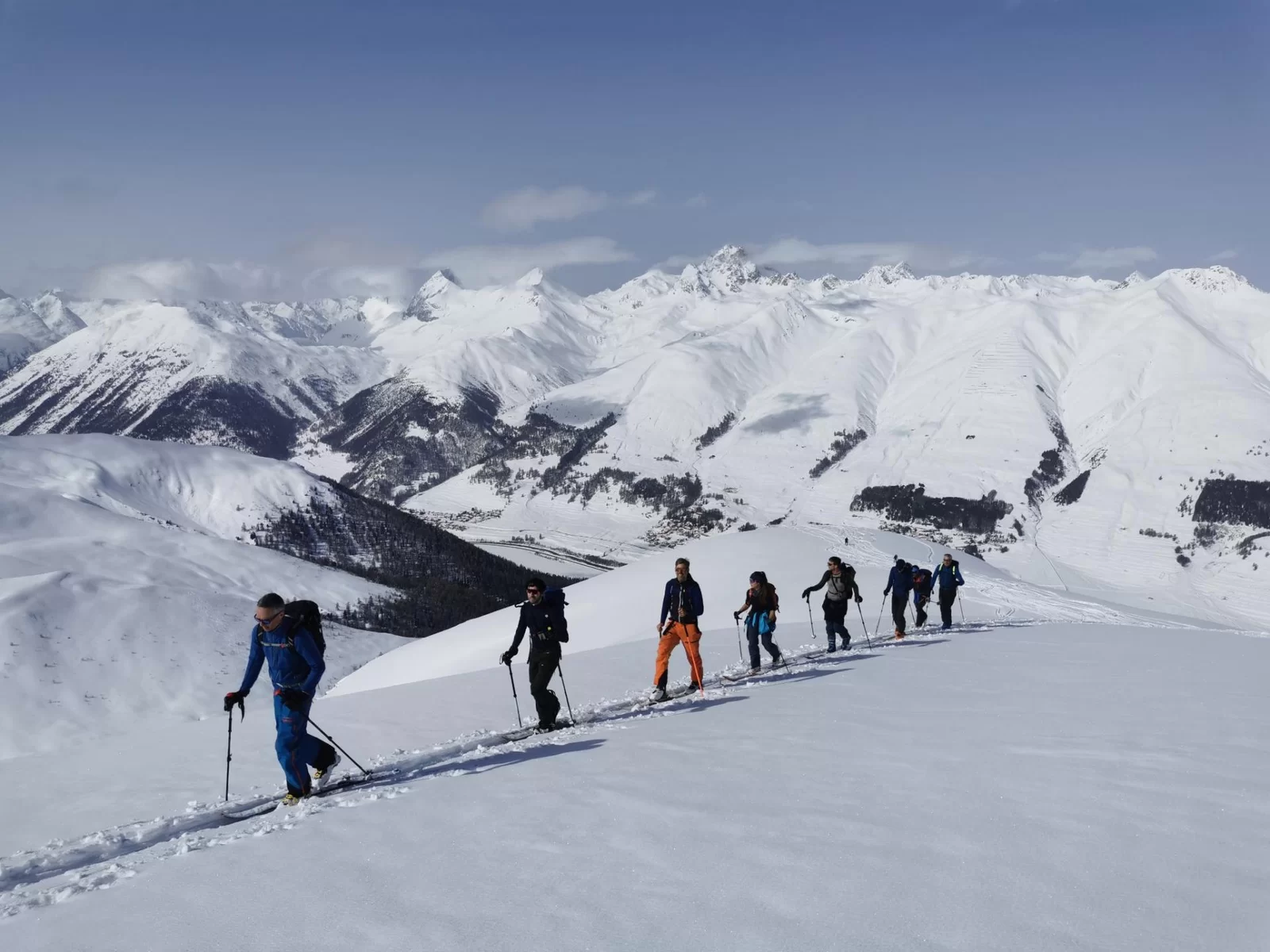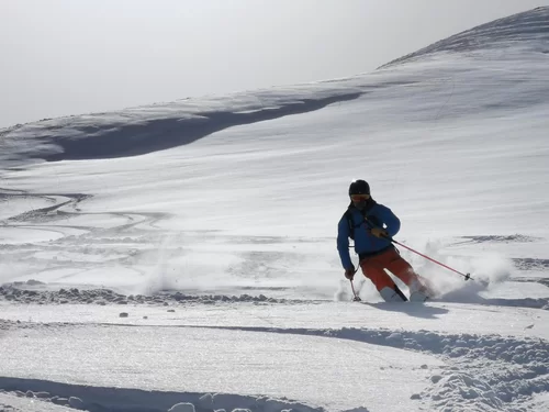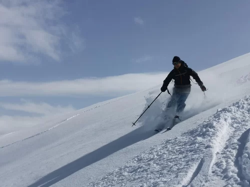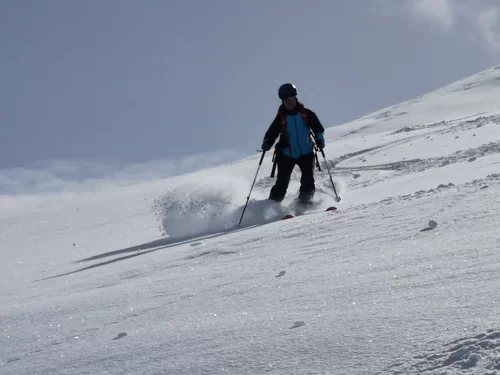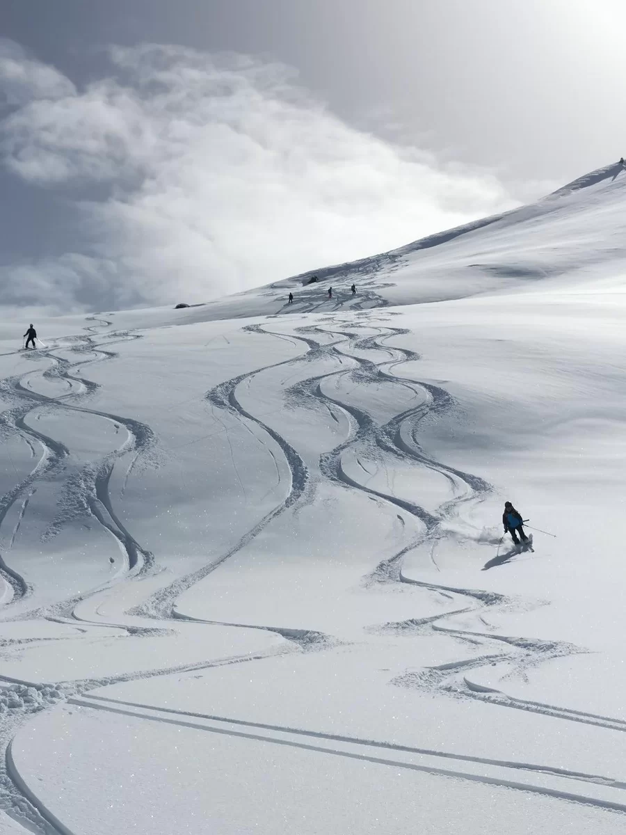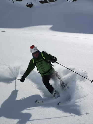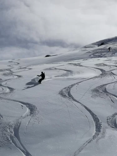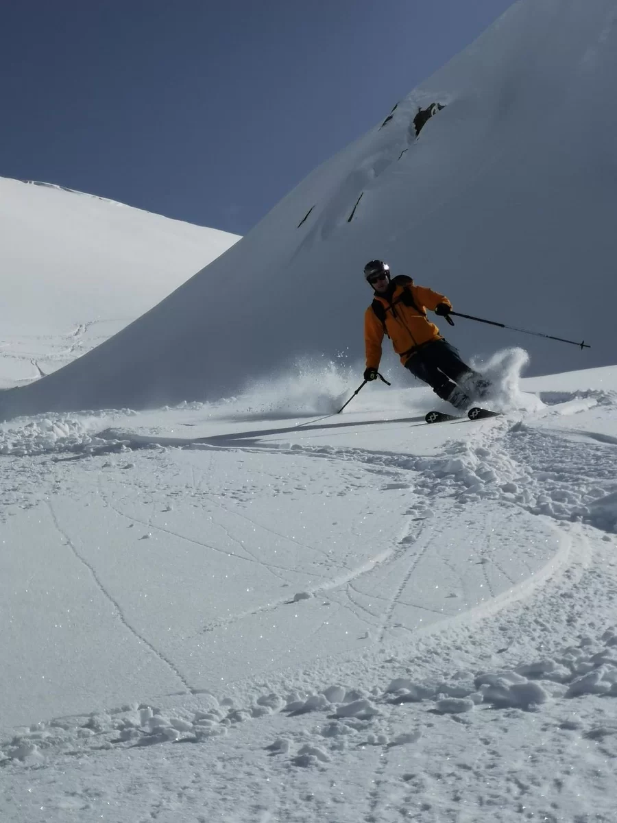 Die Abfahrt bietet dann nordseitig im oberen Teil vollig unerwartet Champagner-Powder, bevor der Schnee dann unterhalb 2300m gedeckelt ist. Nach einem kleinen Gegenanstieg geht es im Sulz hinunter zur Alp Arpiglia und auf der Fahrstrasse runter nach Resgia.