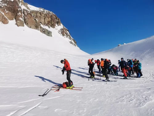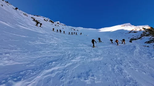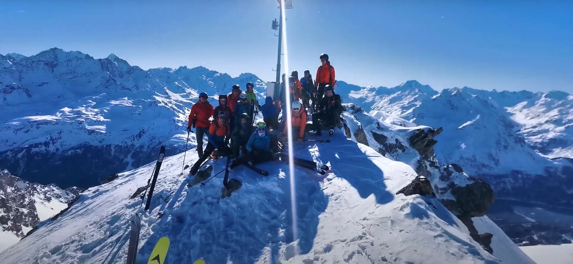 Dank unseres zeitigen Aufbruchs und der kontinuierlich aktiven Luftzirkulation blieben unsere 20 Motoren stets ausreichend gekühlt. Aufstiegs- und Abfahrtsverhältnisse wechselten zwischen pickelhart und pickelhärter, was nach den Powderweeks der bisherigen Saison eine zwar berfürchtete, doch gleichwohl aufrüttelnde Erfahrung darstellte. Das gesamte Team erreichte sowohl den Gipfel als auch das Tal in einem Stück und inklusive sämtlicher Plomben zwischen den Kiefern, so dass einem launigen Einkehrschwung an der sonnigen Polowiese nichts im Wege stand.