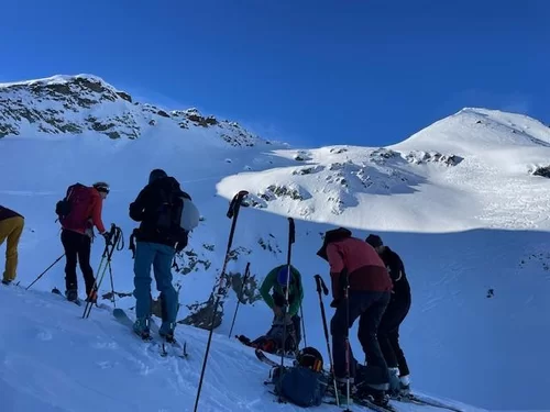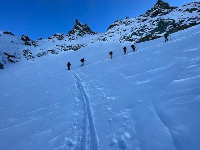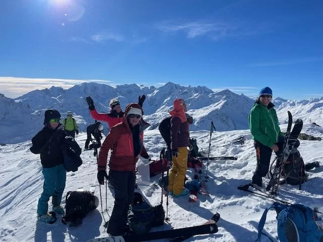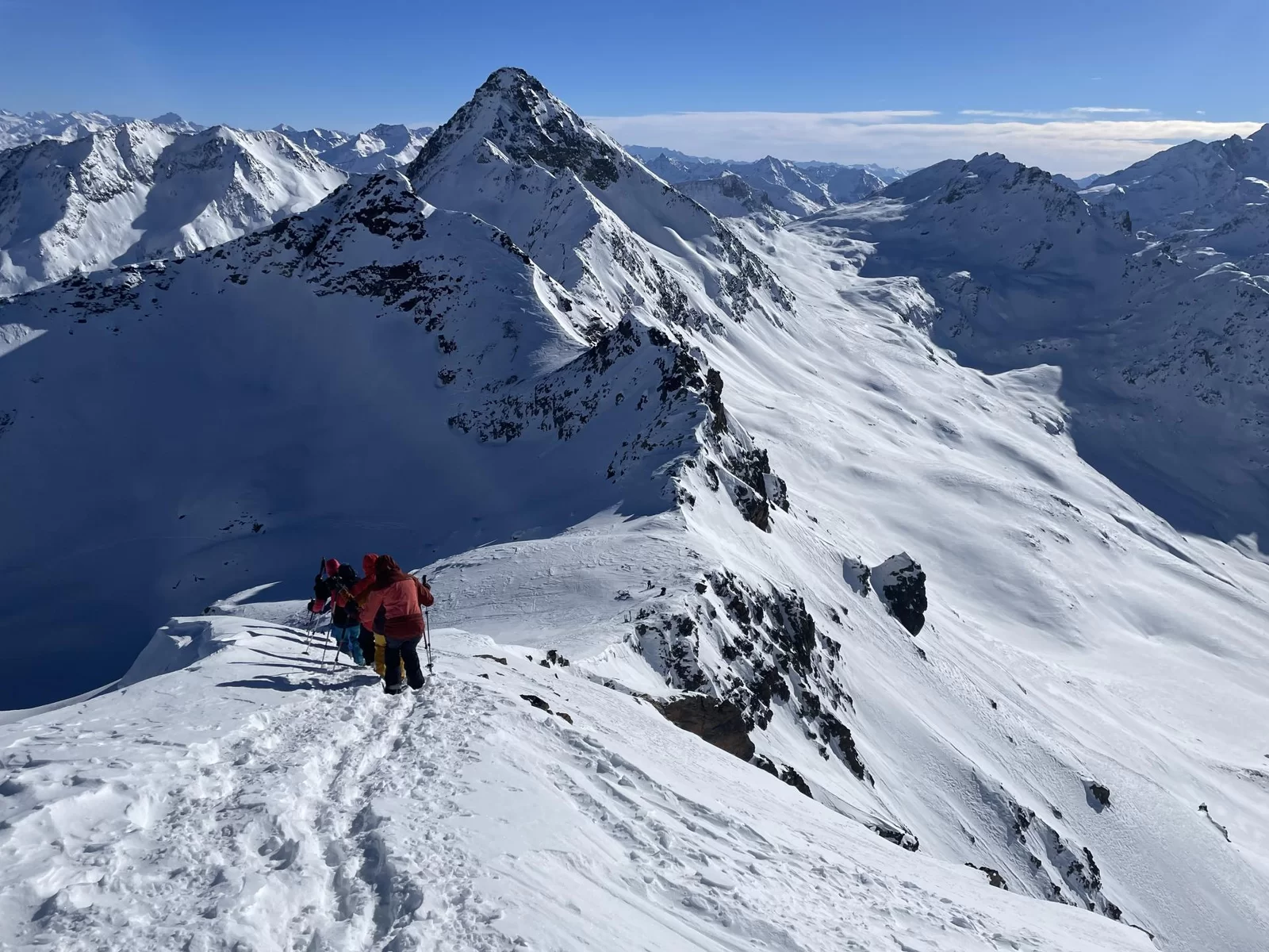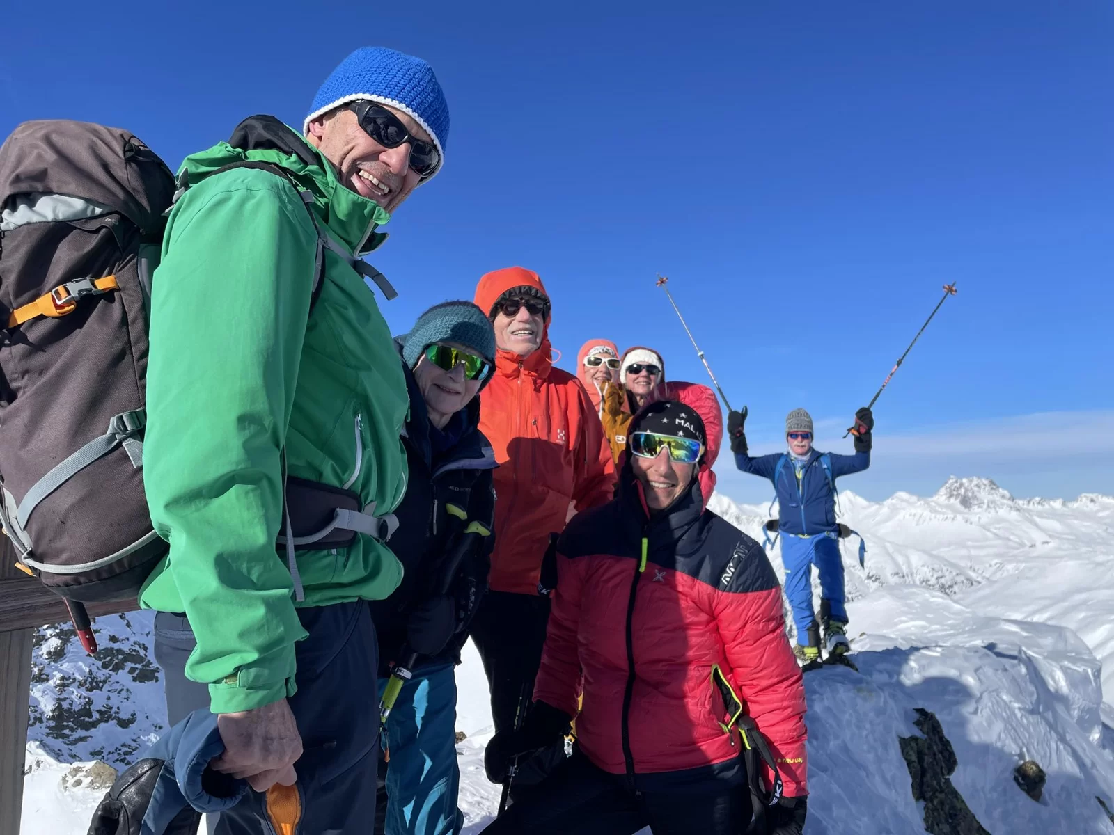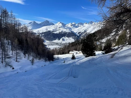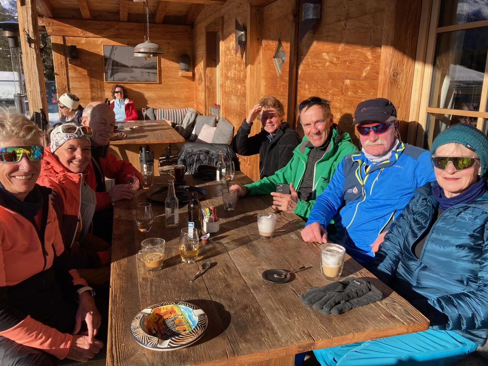 Aber auch die Abfahrt in die Val Muragl im anfangs etwas schweren Schnee, wechselnd vom schwer pulvrig zum leicht pulvrigen Schnee, macht sehr viel Spass. Duri hat eine gute Schneenase und findet ein unberührtes Tälchen, das viele glückliche Schwünge im flockigen Schnee sowie lachende und zufriedene Gesichter hinterlässt. Die letzte Zick-Zack-Abfahrt durch den Wald erfordert schlussendlich etwas Konzentration und Achtsamkeit, was die Gruppe gut meistert. Beim gemütlichen Beisammensein im Terra tauschen wir uns nochmals über diese abwechslungsreiche Genusstour aus und sind uns einig: es war einfach toll. Danke Duri