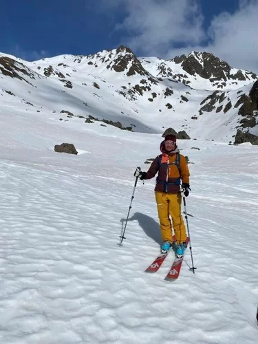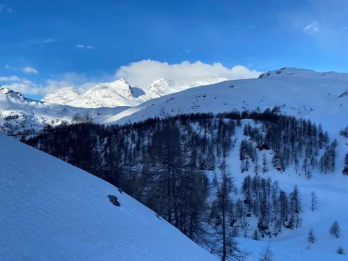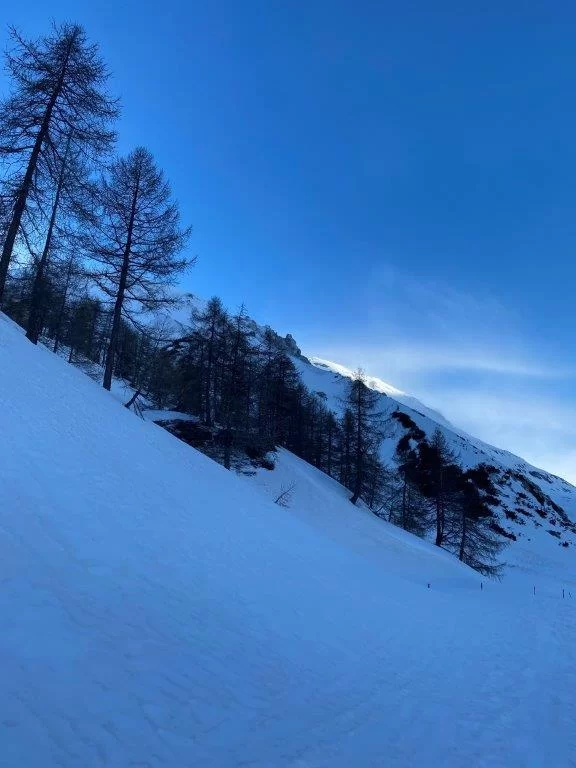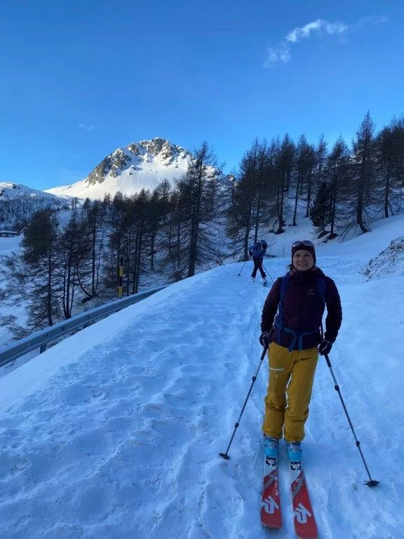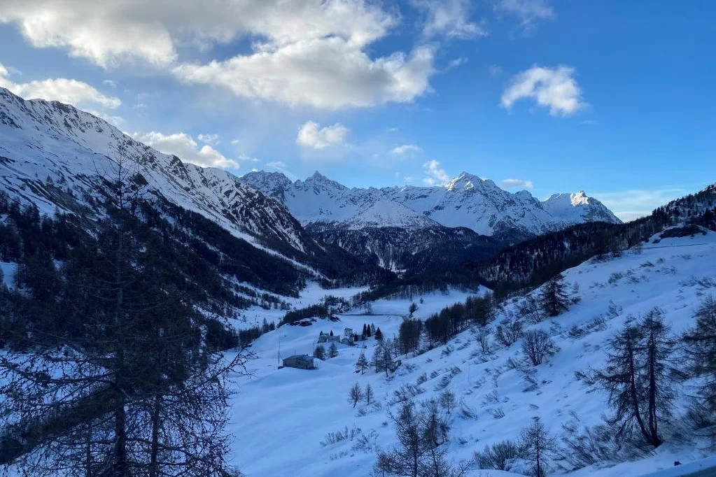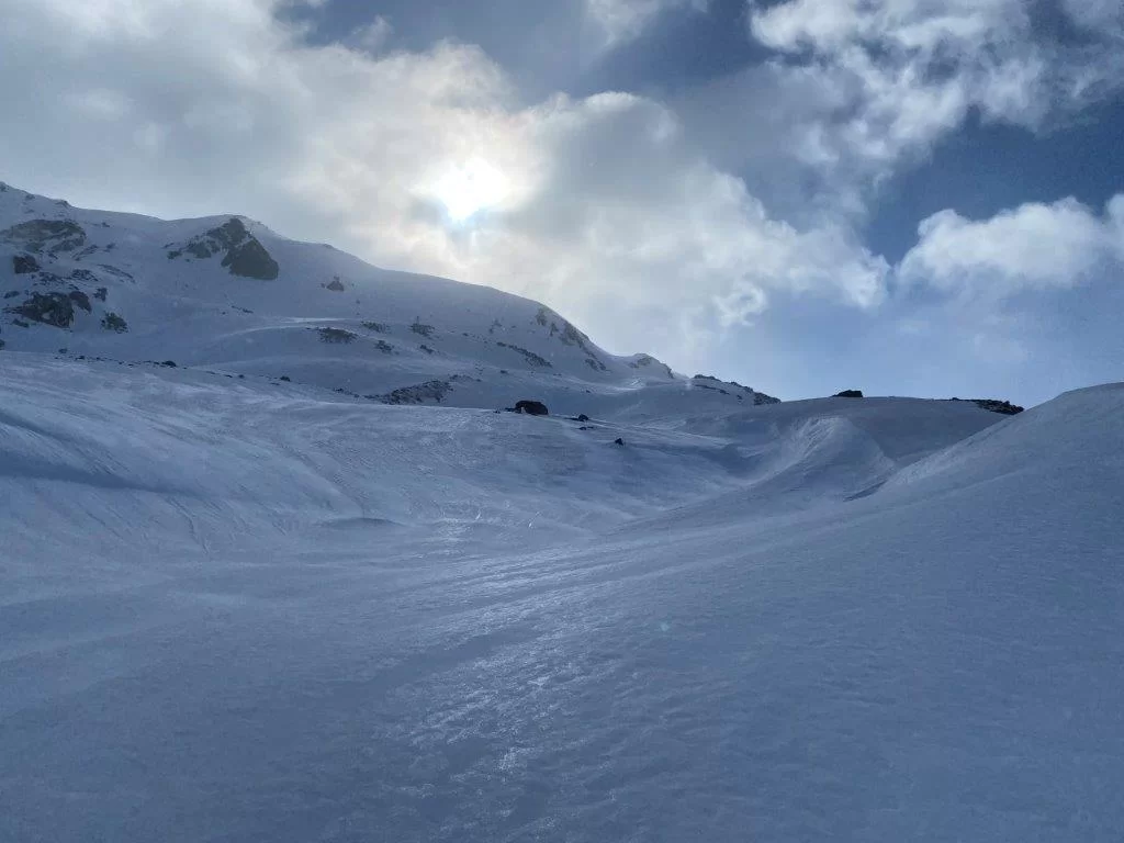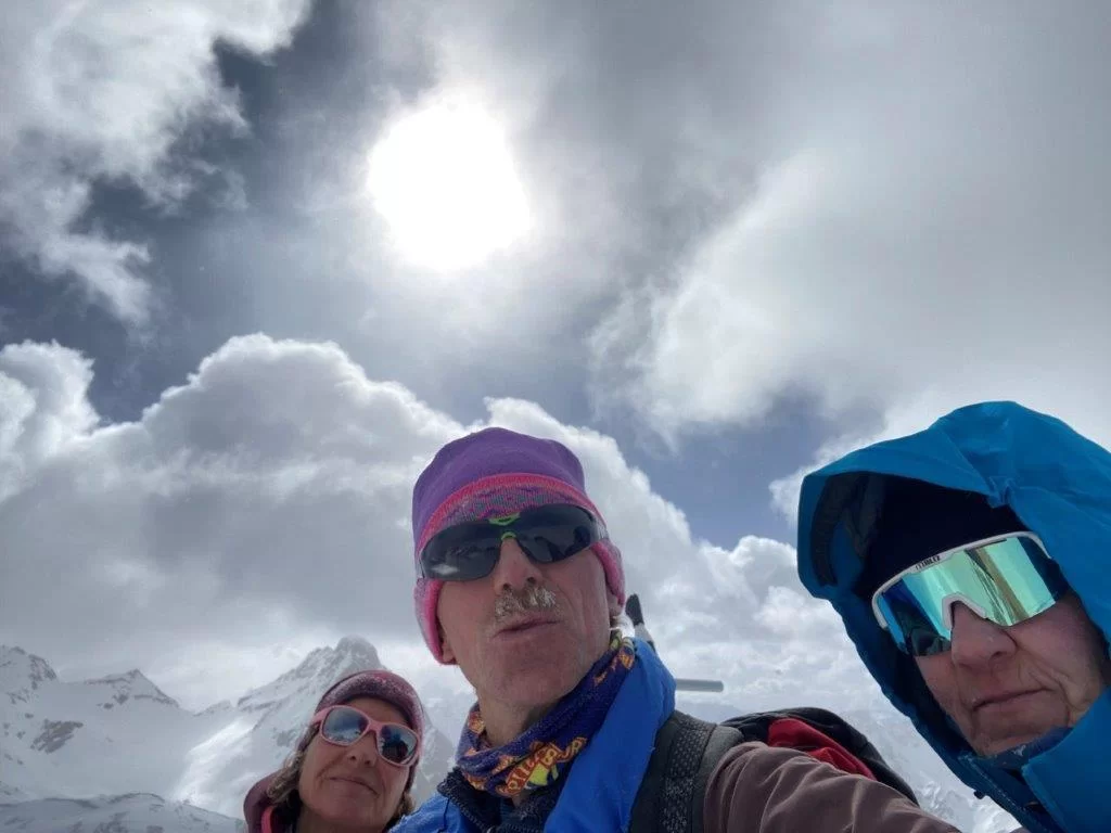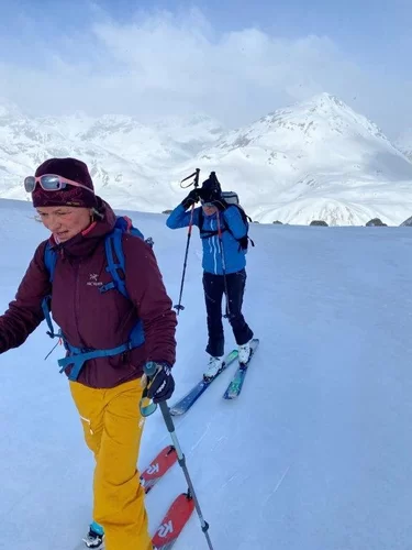 Die Tour zum Blaisun änderte ich nach 2 Abmeldungen am Morgen kurzfristig, als wir sahen, dass das Wetter im Süden besser zu werden schien, so gingen wir zum Piz Orsera. Es war ziemlich frisch und luftig. So starteten wir in La Motta und stiegen direkt nach der Brücke über die steilen Firnhänge auf. Leider hat es allen Neuschnee irgenwohin weggeblasen und so hatten wir eine etwas rauhe, holperige und kratzige Abfahrt. Erst oberhalb Saoseo weichte der Schnee etwas auf. Susanne, Carmen und TL Norbert
