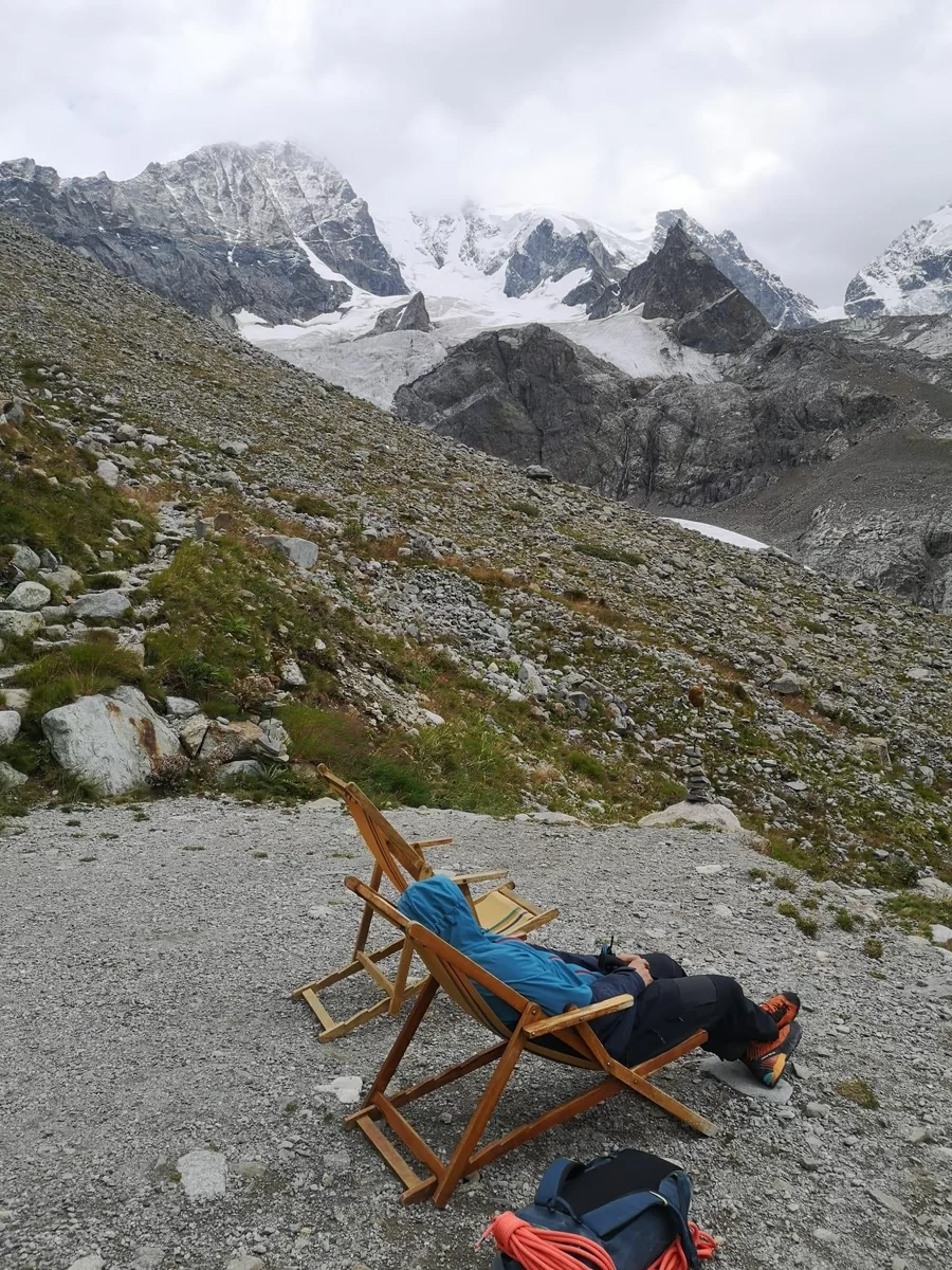 Dank Sonnenschein, Windstille und prall gefüllter Proviantsäcke fiel die Gipfelrast rekordverdächtig aus. Schliesslich lockten die Kaltgetränke und Kuchen auf der Chamanna da Tschierva dann doch zu sehr, so dass wir uns, um einige Fundstücke wie Crémes, Riegel und Powerbanks reicher, an den Weiterweg machten.