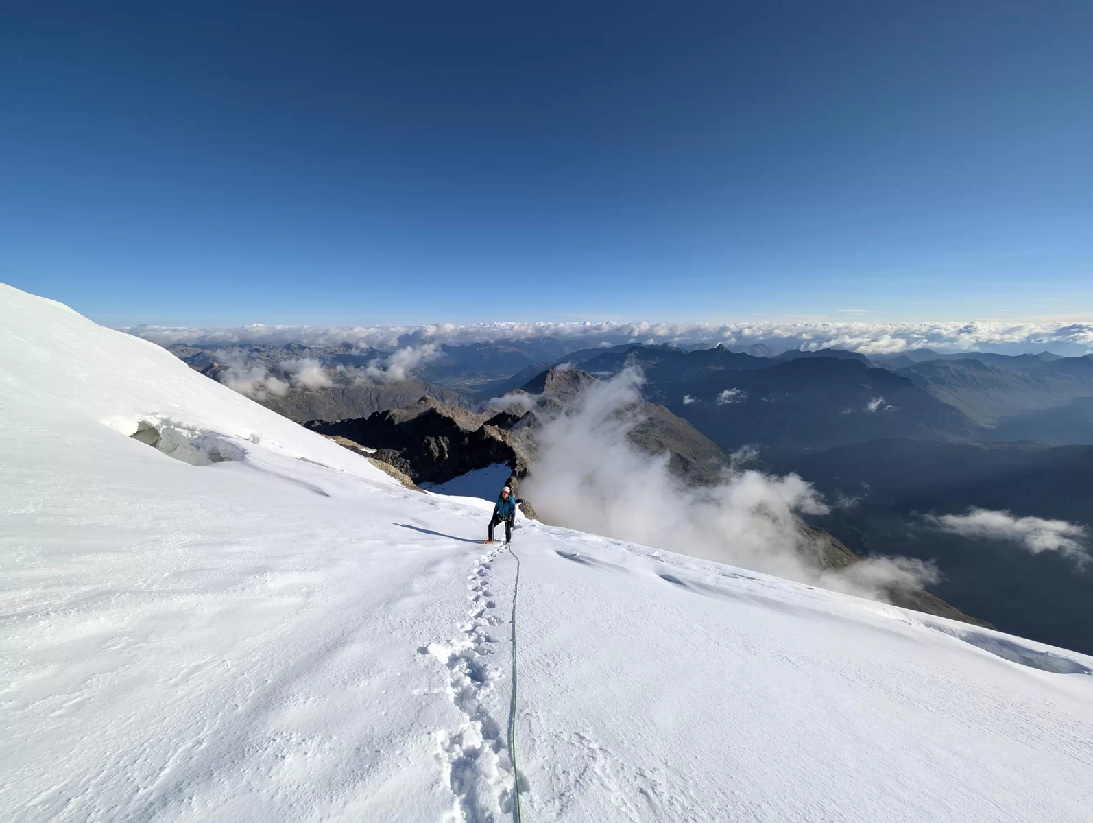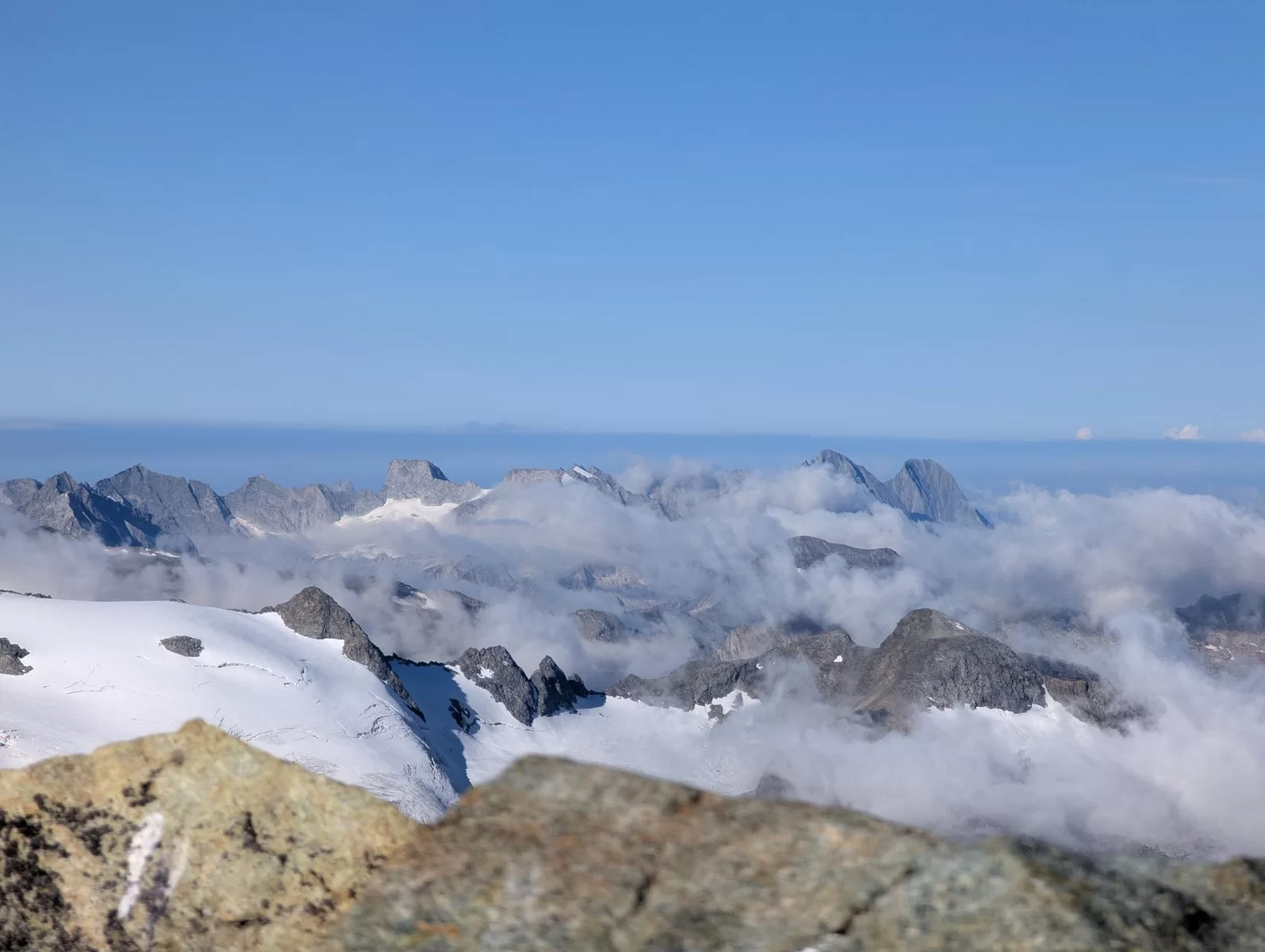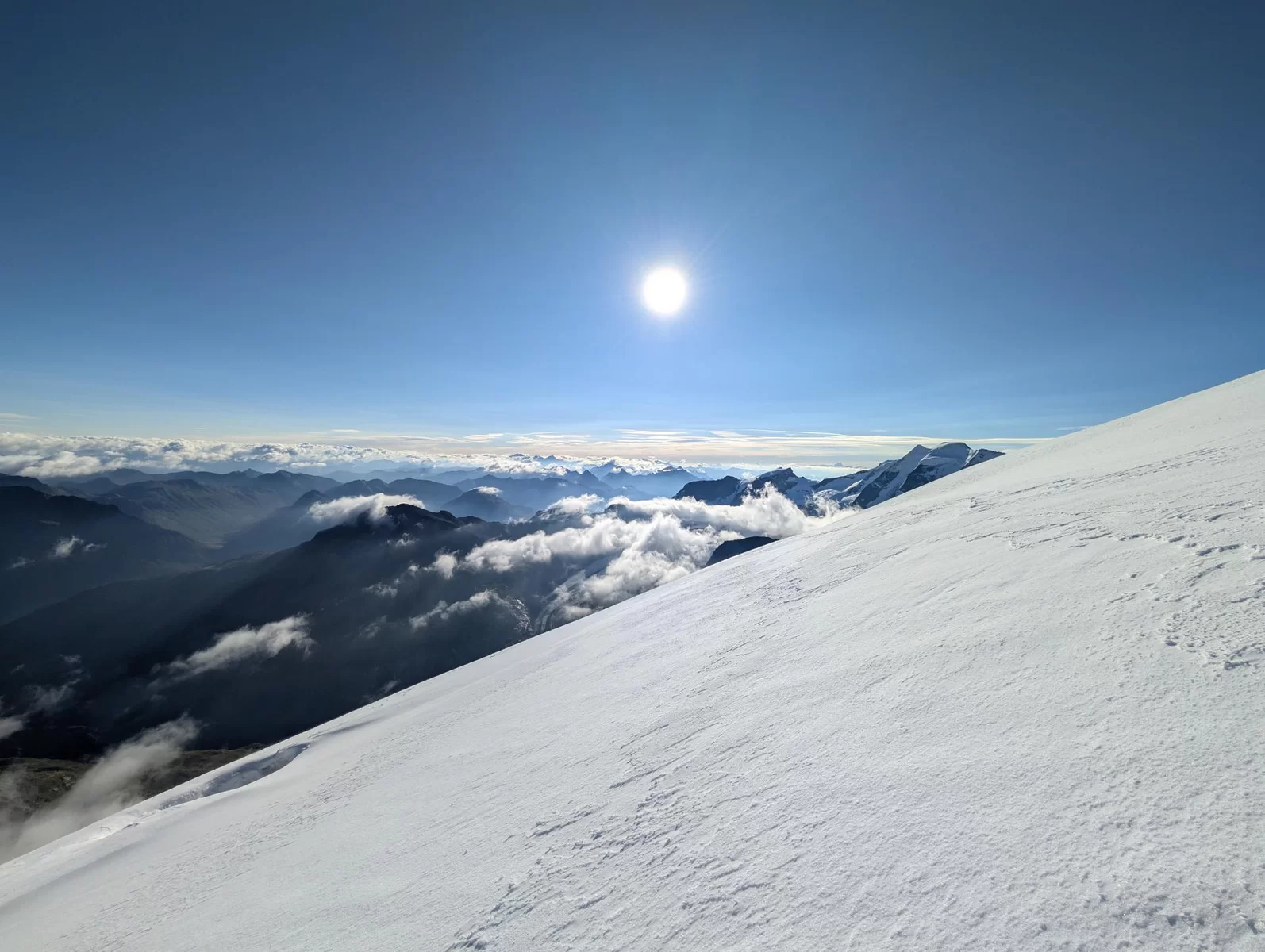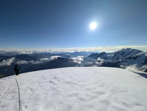 Dieses Mal zeitsparend, da ohne Seilverhänger, erreichten wir den schattigen Gletscher, wo wir Steigeisen montierten und der guten Aufstiegsspur am kurzen Seil über den Nordgrat bis in die Nordostflanke folgten. Von nun an ging es im Sonnenschein weiter bis zum Gipfel, wo wir das stets aufs Neue beeindruckende Panorama im kühlen Nordwind genossen.