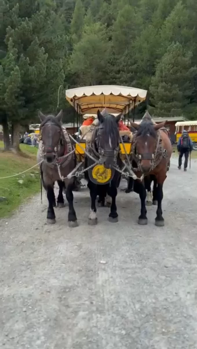 Nach einer weiteren Stärkung mit den lukullischen Genüssen von Carolines Team entschieden wir uns, den Hatscher durch das mitunter endlos wirkende Val Roseg zu verkürzen. Ein kurzer Anruf und die Plätze im Pferdeomnibus waren reserviert, den wir nach zügigem Abstieg pünktlich nach einer knappen Stunde erreichten.