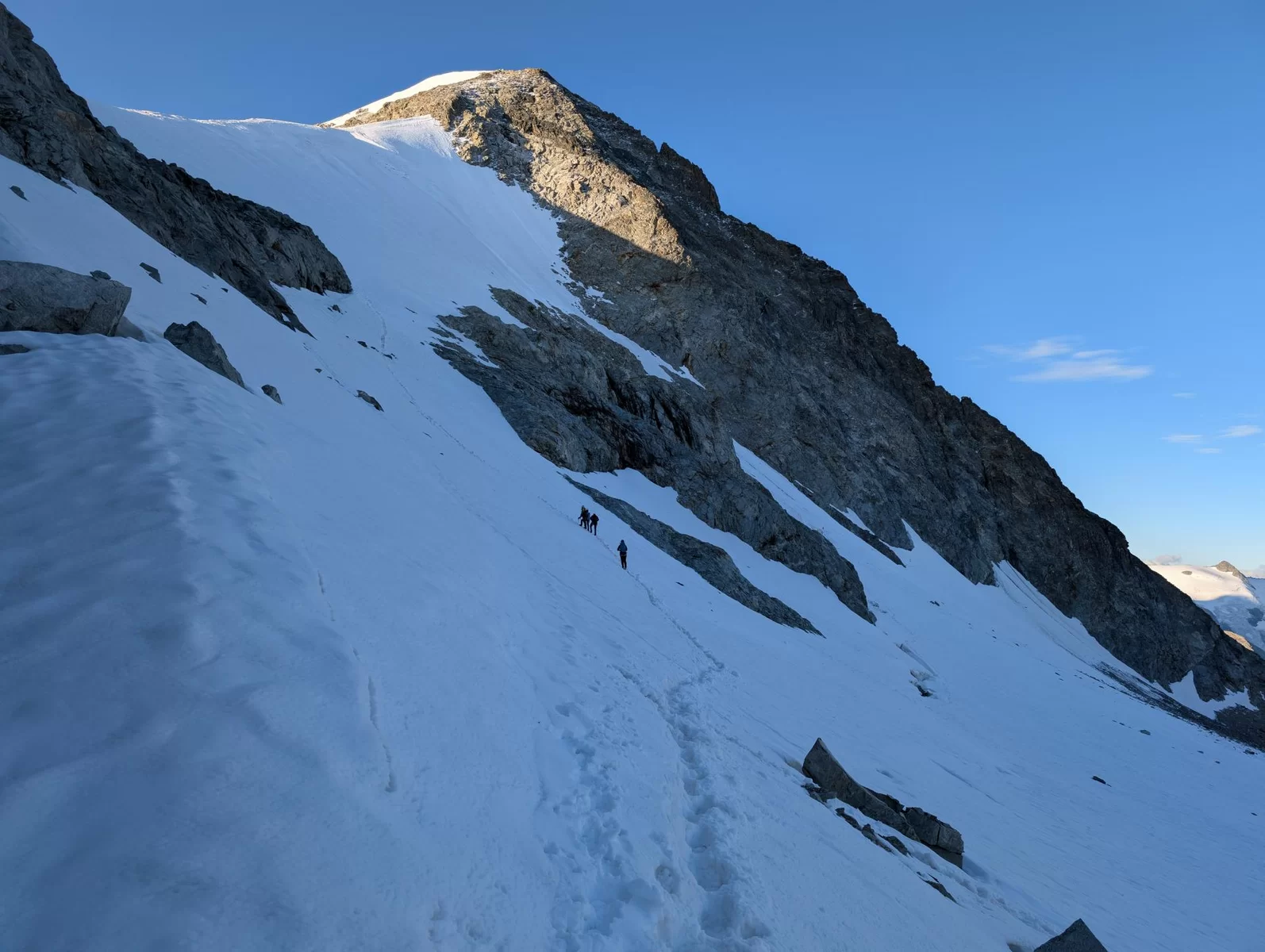 Dem einzigen Bergführer mit seinen zwei Gästen liessen wir gerne den Vortritt, schliesslich versprachen besagte Niederschläge einiges an Spurarbeit. Eine Vorahnung, die sich später bewahrheiten sollte. So zogen drei bestens gelaunte Zweierseilschaften zuerst im Schein ihrer Stirnlampen und wenig später im schönsten Morgenlicht der Fuorcla entgegen.