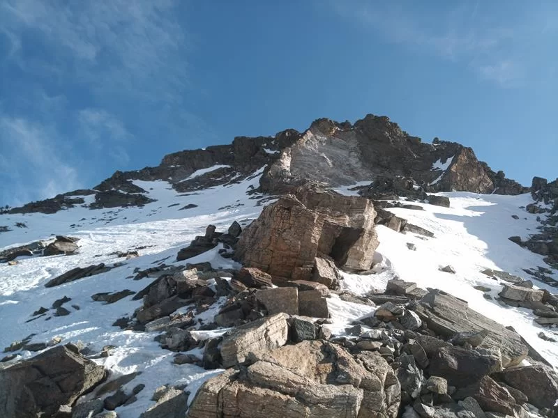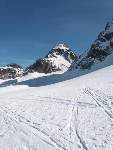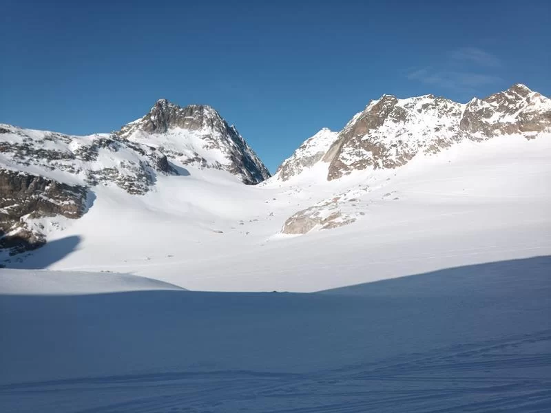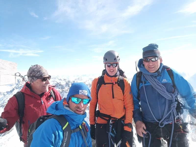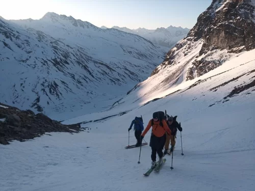 Nach einer kalten Nacht stiegen wir zur Fuorcla dal Cunfin auf, dann folgte eine kurze Abfahrt hinunter auf den Ochsentaler Gletscher. Erstaunt waren wir, wie wenig Schnee im Silvrettagebiet momentan liegt. Nach einer Pause ging es bis zur Fuorcla Buin noch auf Ski und von dort zu Fuss auf den Gipfel.