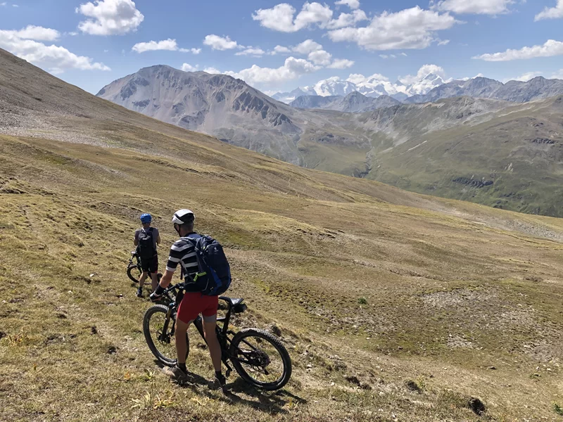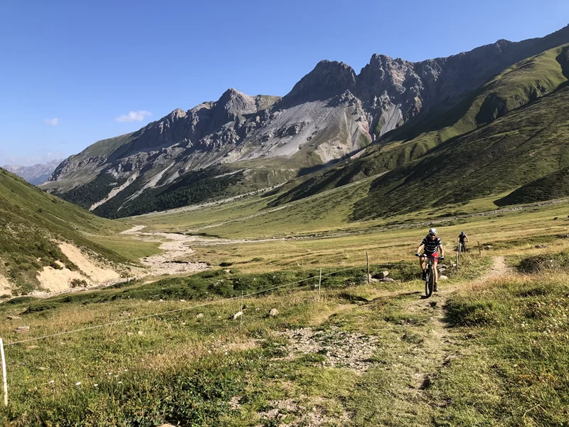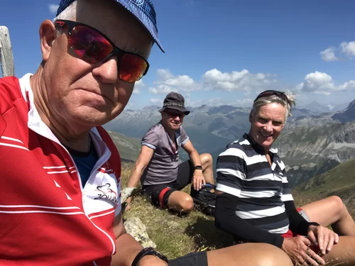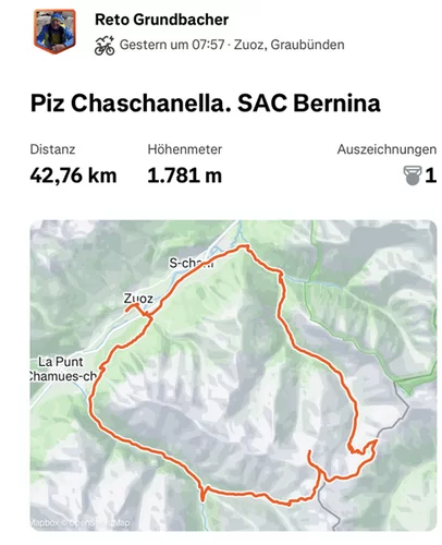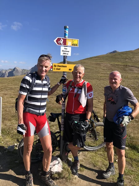 Um acht Uhr starteten wir in Zuoz zu unserer Rundtour. Wir fuhren durchs Val Chaschauna, dann über die wunderschöne Bikestrecke zum Chaschaunapass, welchen wir bereits um 10:00 Uhr erreichten. Weiter über den Pt. 2791, 2752, 2827, 2780 über den Grat einer ganz tollen Landschaft bis zum Pt. 2917. Von hier stiegen wir zur Fuorcla Chaschauna hinunter, wo wir das Bikedepot erstellten. Ab hier stiegen wir zu Fuss zu unserem heutigen, sehr selten besuchten Gipfel des Piz Chaschanella 2929m hinauf. Nach dem Geniessen der tollen Rundsicht bei schön warmen Wetter marschierten wir wieder zu unseren elektrischen «Carbonesel» hinunter, querten zur Fuorcla Lavirun und bewegten uns in steilem Gelände zur Alp Timun hinunter. Bei Freunden, Bier und gar etwas Musik konnten wir uns von den Strapazen der Abfahrt erholen, um erfrischt den Alpweg an Serlas vorbei durchs Val Chamuera bis hinunter zum Pt. 1756 zu fahren. Über den «Mastenweg» im God Pschaidas fuhren wir weiter bis zur Golf-Büvette um dort rechts hinauf als Dessert den herrlichen Trail Richtung Resgia zu geniessen. Danke Albert und Ruedi für die Teilnahme dieser tollen Tour.