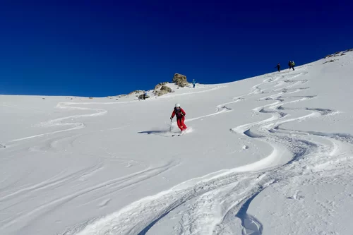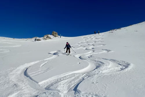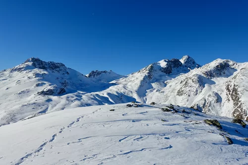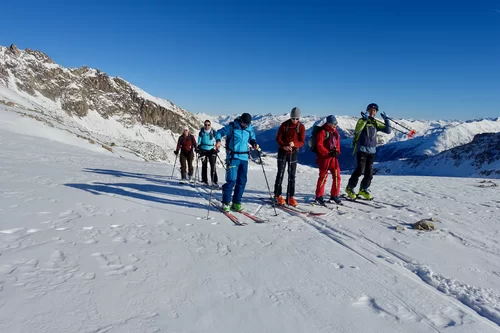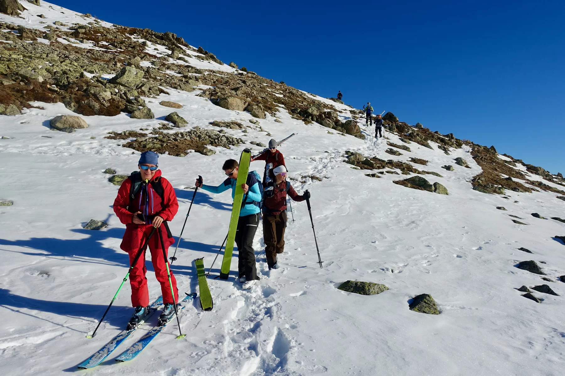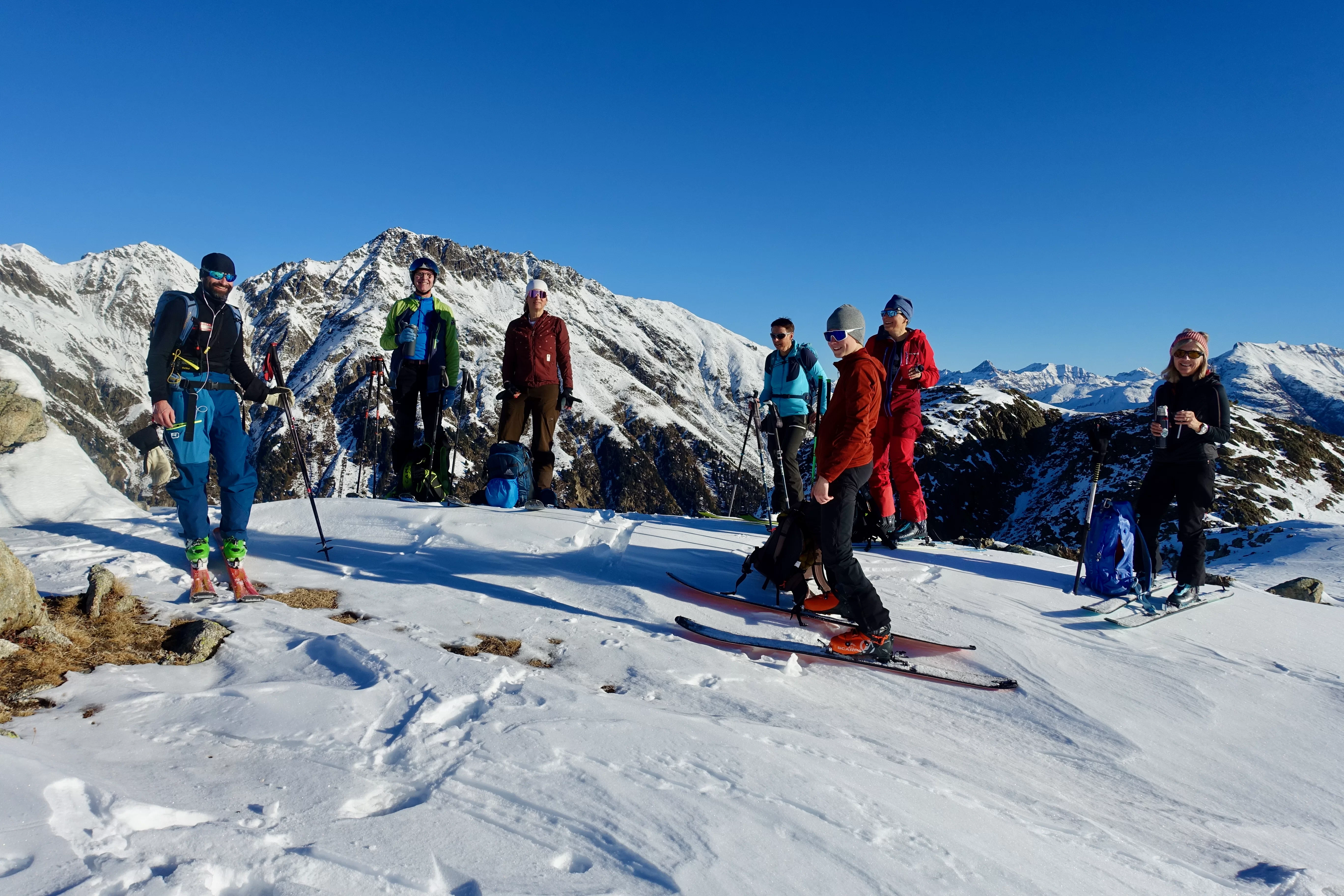 Gemütlich ging es von Samedan zur Alp Muntatsch und weiter zum Vorgipfel von Cho d'Valetta. Kleine Abfahrt auf Fellen und weiter ins Valletta und zur Fuorcla Valletta. Die Abfahrt zur Skipiste ging gut und der Steinkontakt blieb übersichtlich. Besten Dank für die fröhliche Tour an Dorette, Gil, Margrith, Miro, Monika, Silke und Tobias - Bert