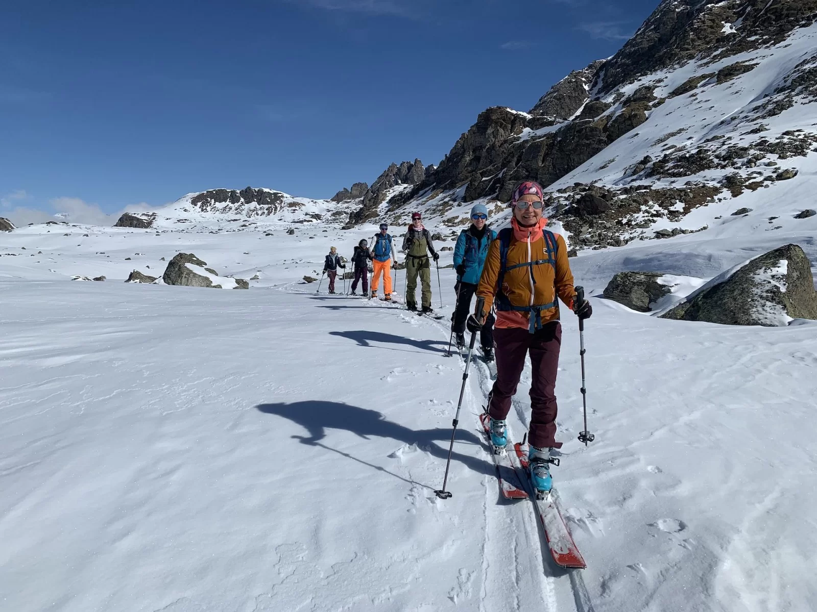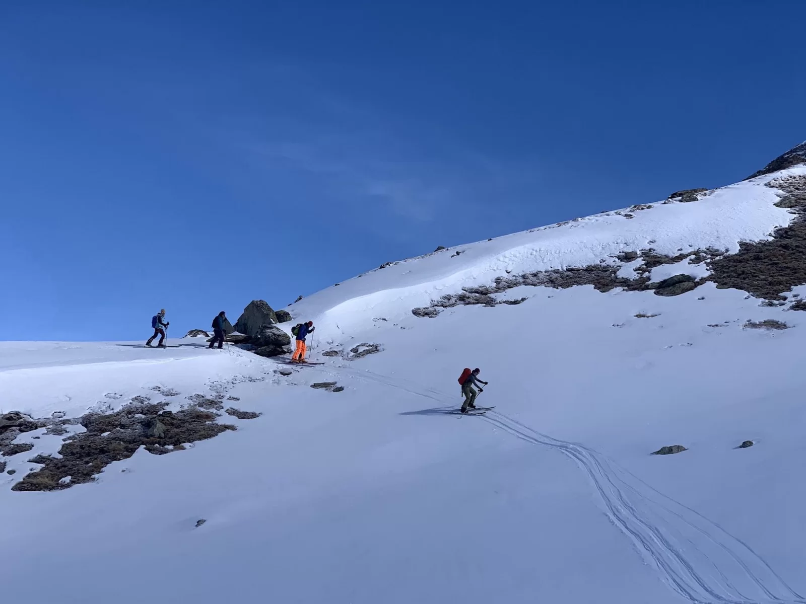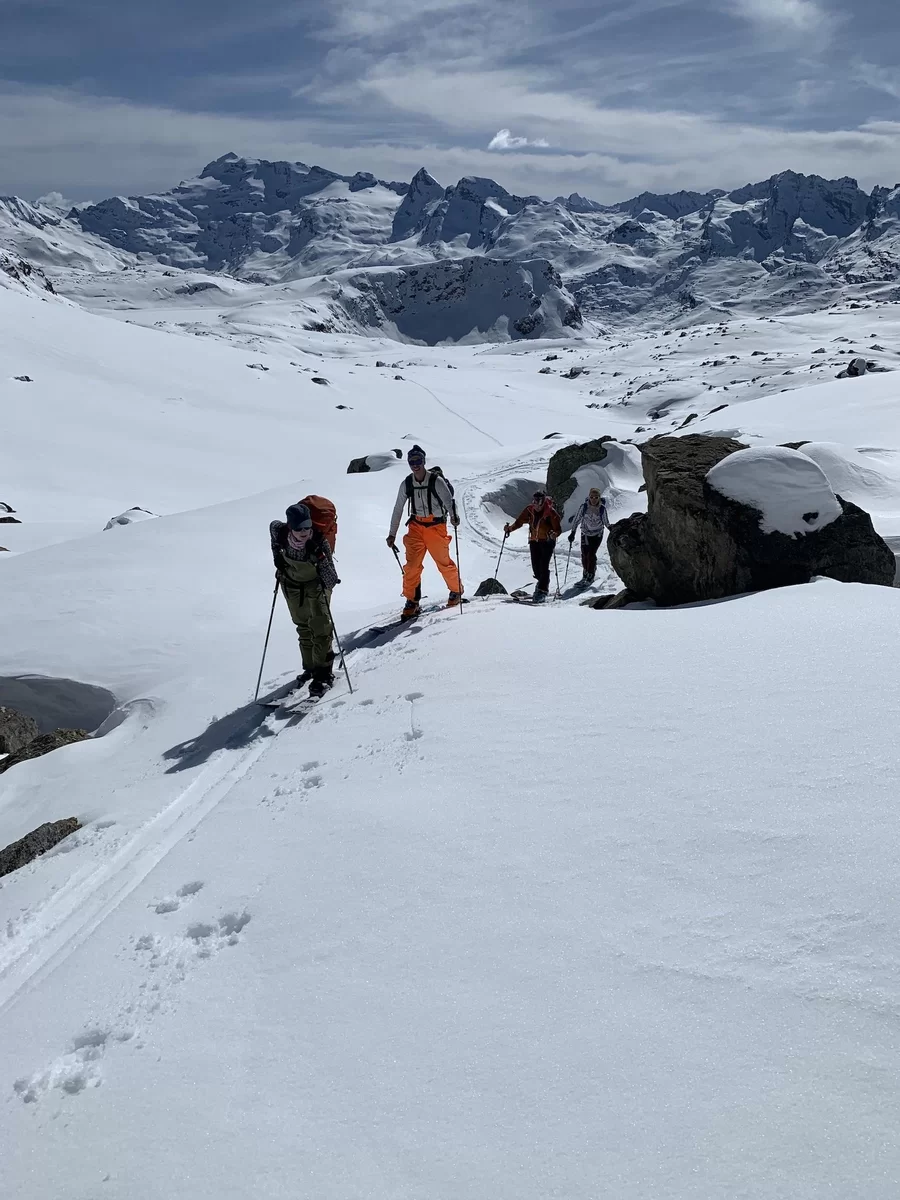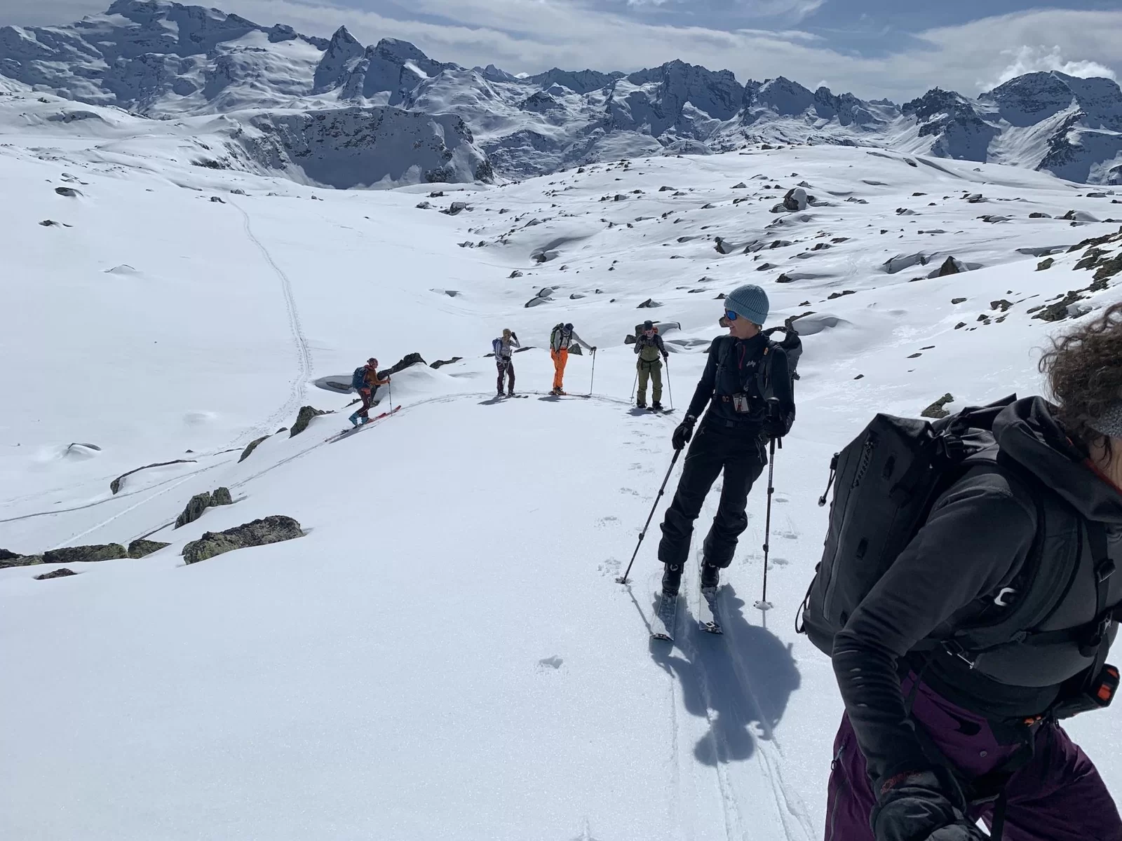 Ein Klassiker, il Piz Chapütschin – Wahrhaftig, die richtige Wahl. Trotz Bruchharsch im Aufstieg und dadurch verunsicherte Teilnehmer*innen war die Stimmung stets ausgezeichnet. Ab Furtschellas Bergstation gings runter zum Lej Sgrischus und weiter in wunderschöner Landschaft auf der normalroute bis zum Skidepot am Chapütschin.