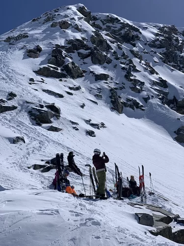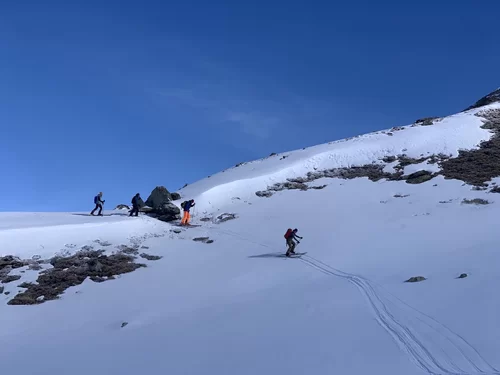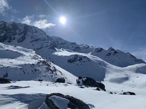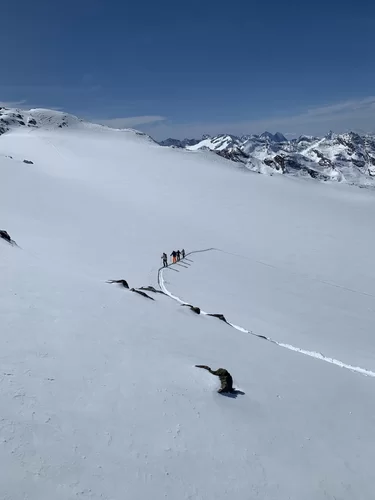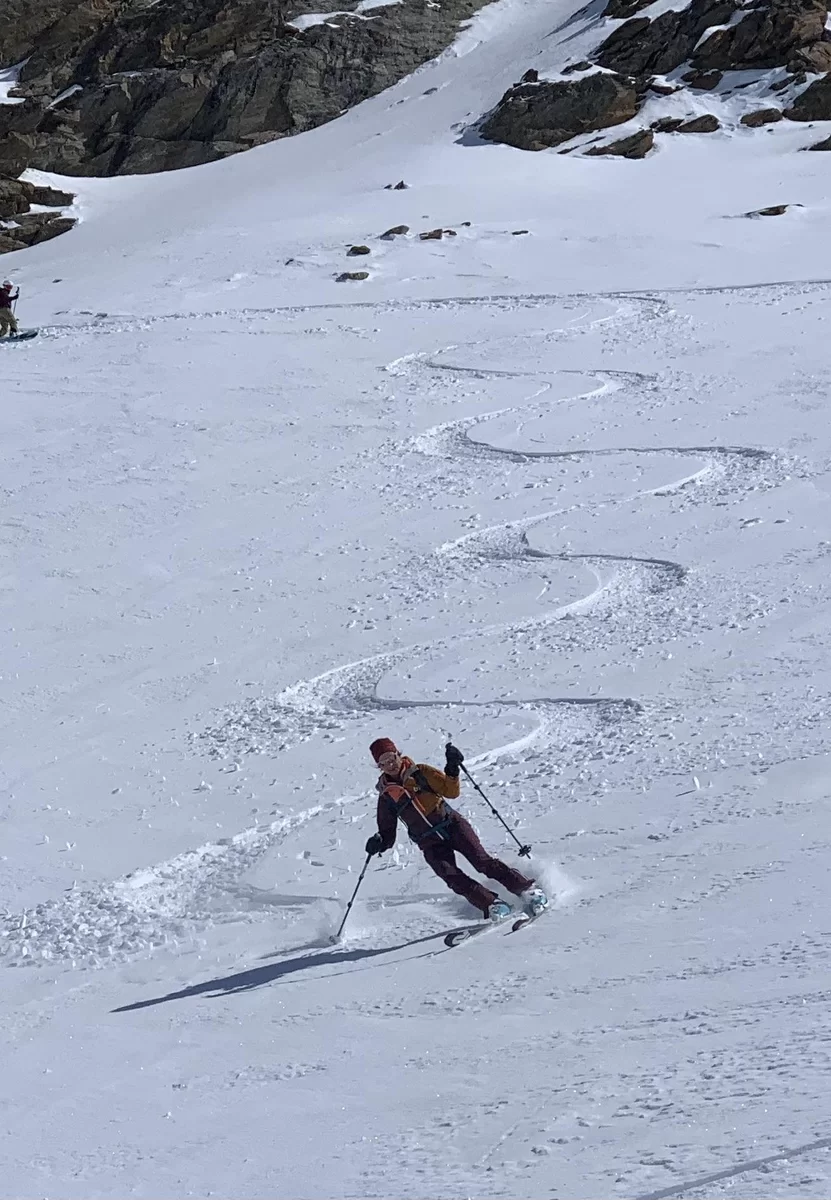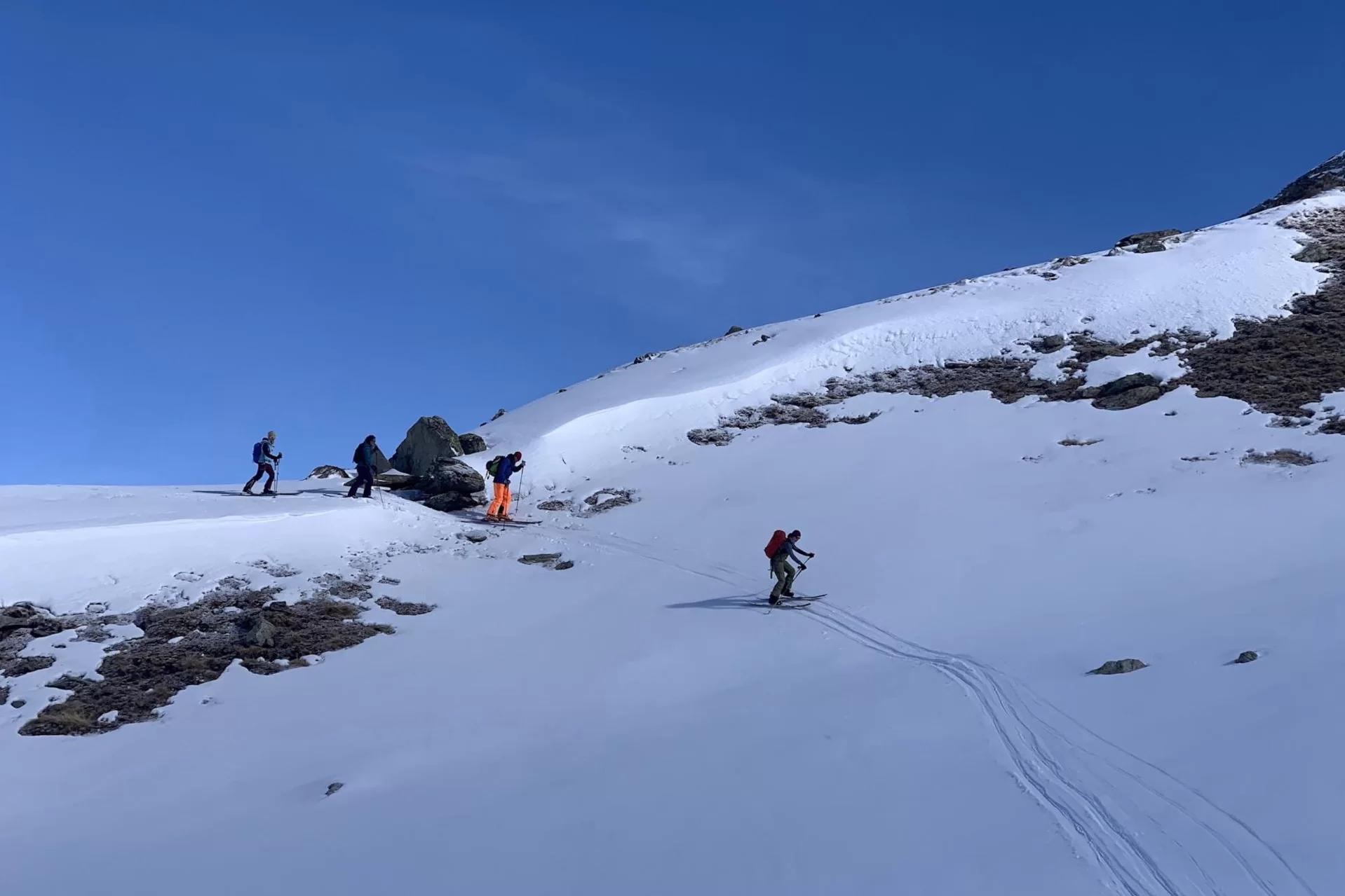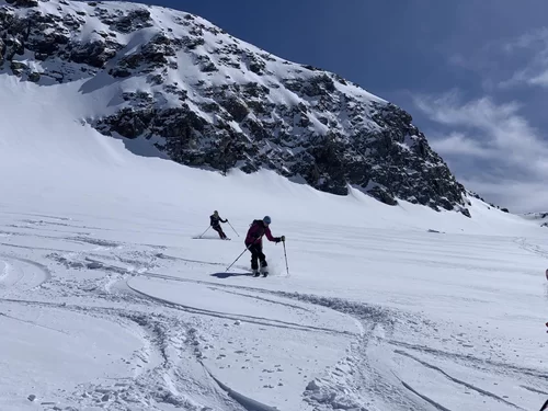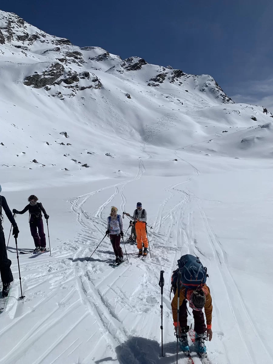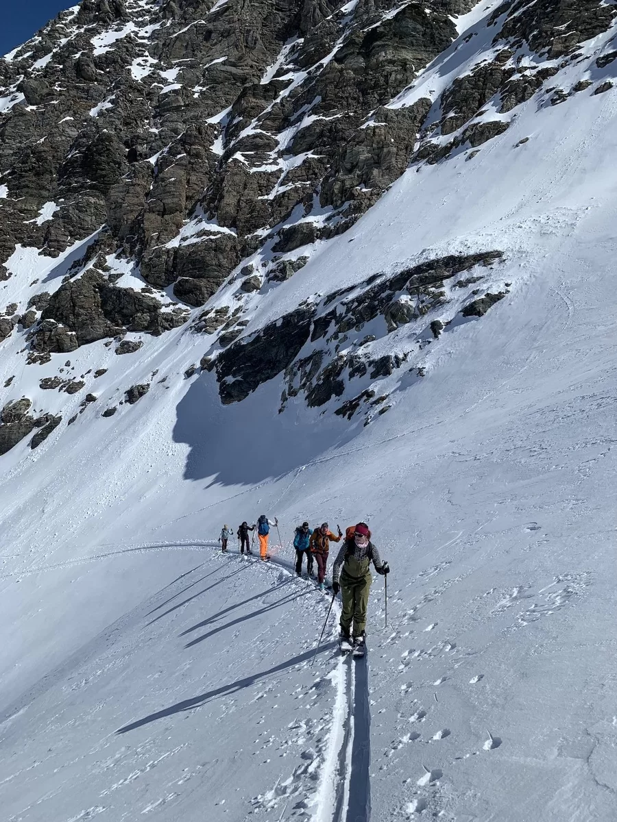 Ein Klassiker, il Piz Chapütschin – Wahrhaftig, die richtige Wahl. Trotz Bruchharsch im Aufstieg und dadurch verunsicherte Teilnehmer*innen war die Stimmung stets ausgezeichnet. Ab Furtschellas Bergstation gings runter zum Lej Sgrischus und weiter in wunderschöner Landschaft auf der normalroute bis zum Skidepot am Chapütschin.
