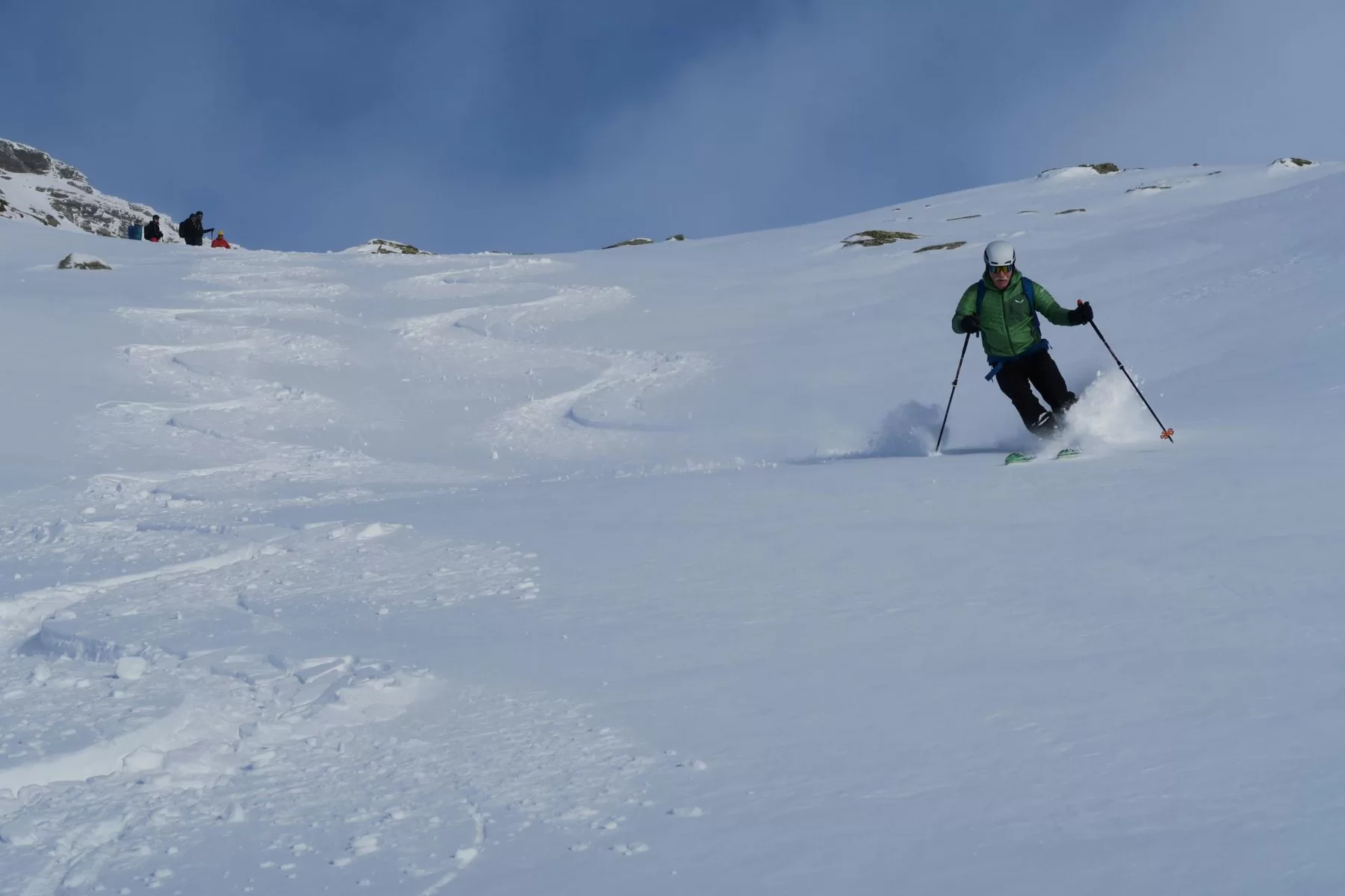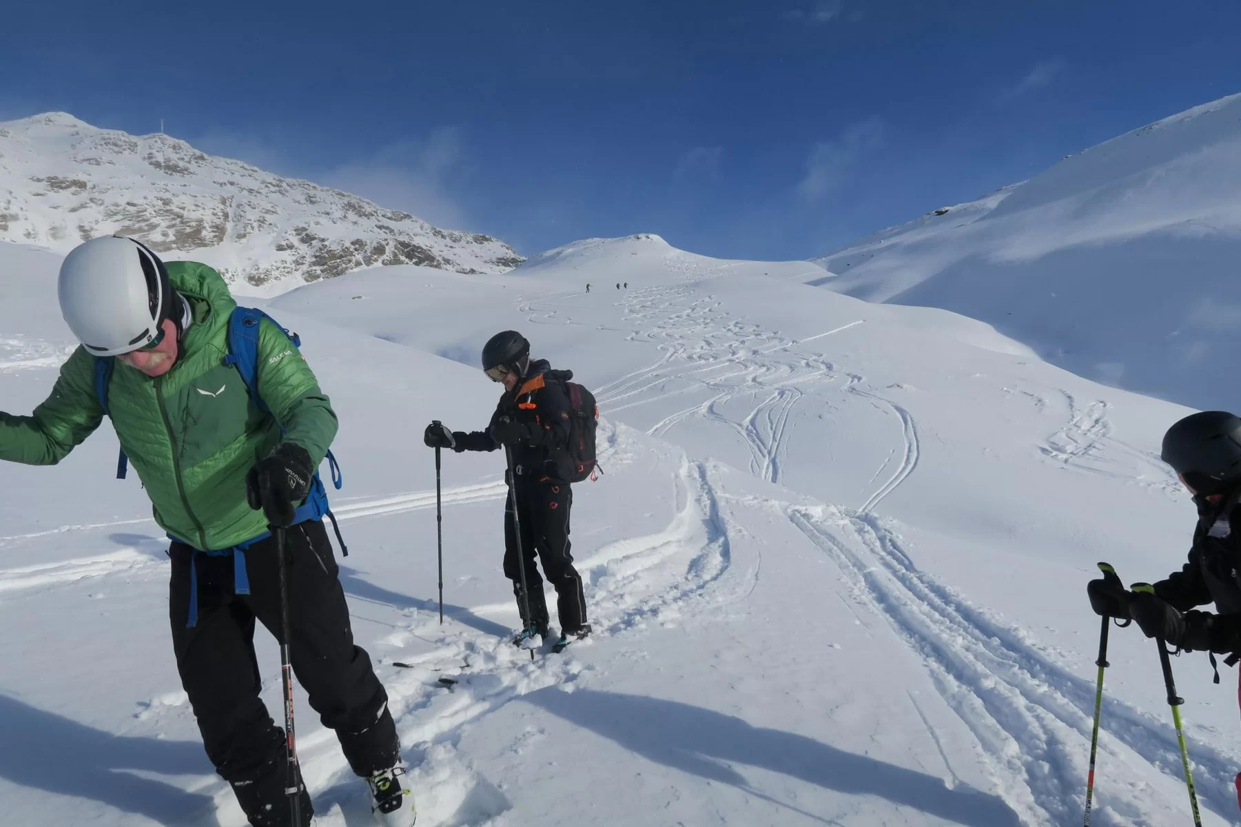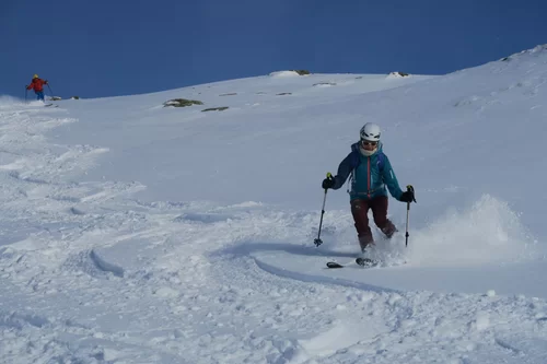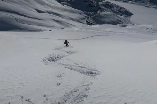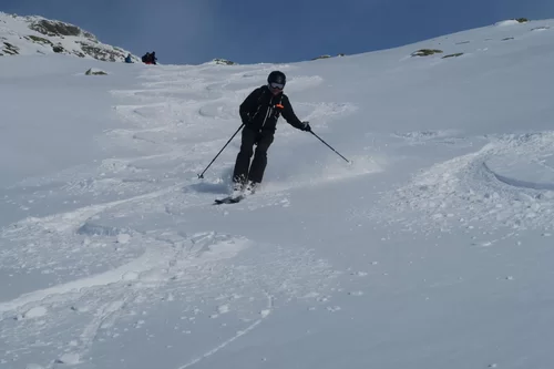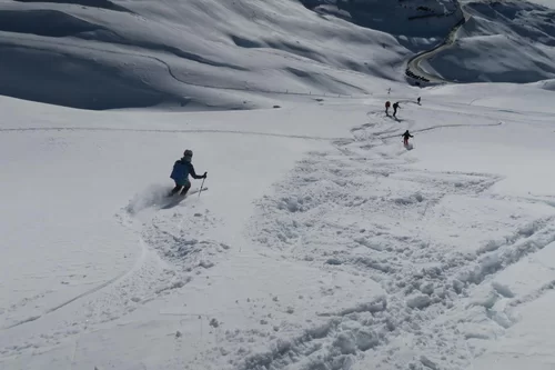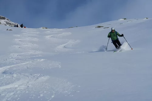 Frühaufsteher werden in der Regel belohnt. Heute haben wir die noch unverspurten Hänge der Motta Bianca als Erste genossen. Vor Ort haben wir wunderschöne Verhältnisse angetroffen. Einige Steinkontakte gab es trotzdem, da sich der Schnee noch nicht gesetzt hat. Im Gebiet liegen ca. 50 cm Schnee. Schade, dass der Wind bereits einige Schäden angerichtet hat. Nach einer ersten Abfahrt haben wir nochmals die Felle montiert und sind wieder an einem anderen Ort aufgestiegen. Es hat sich gelohnt. Es war eine gelungene Tour. Bis morgen. TL Ezio