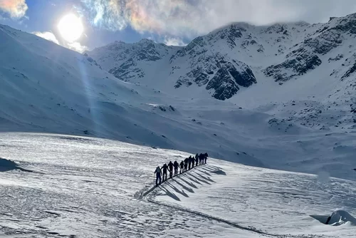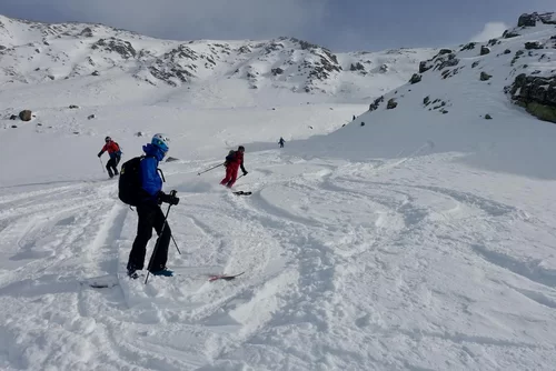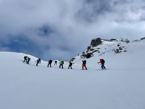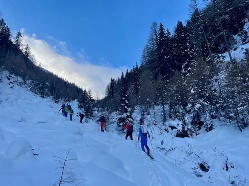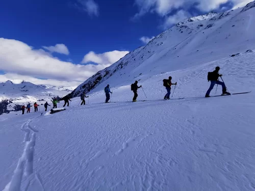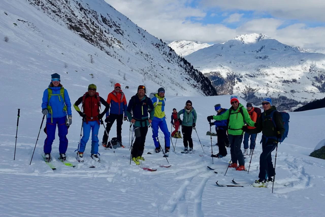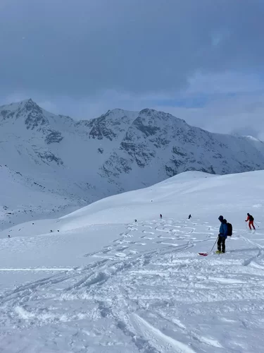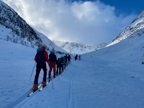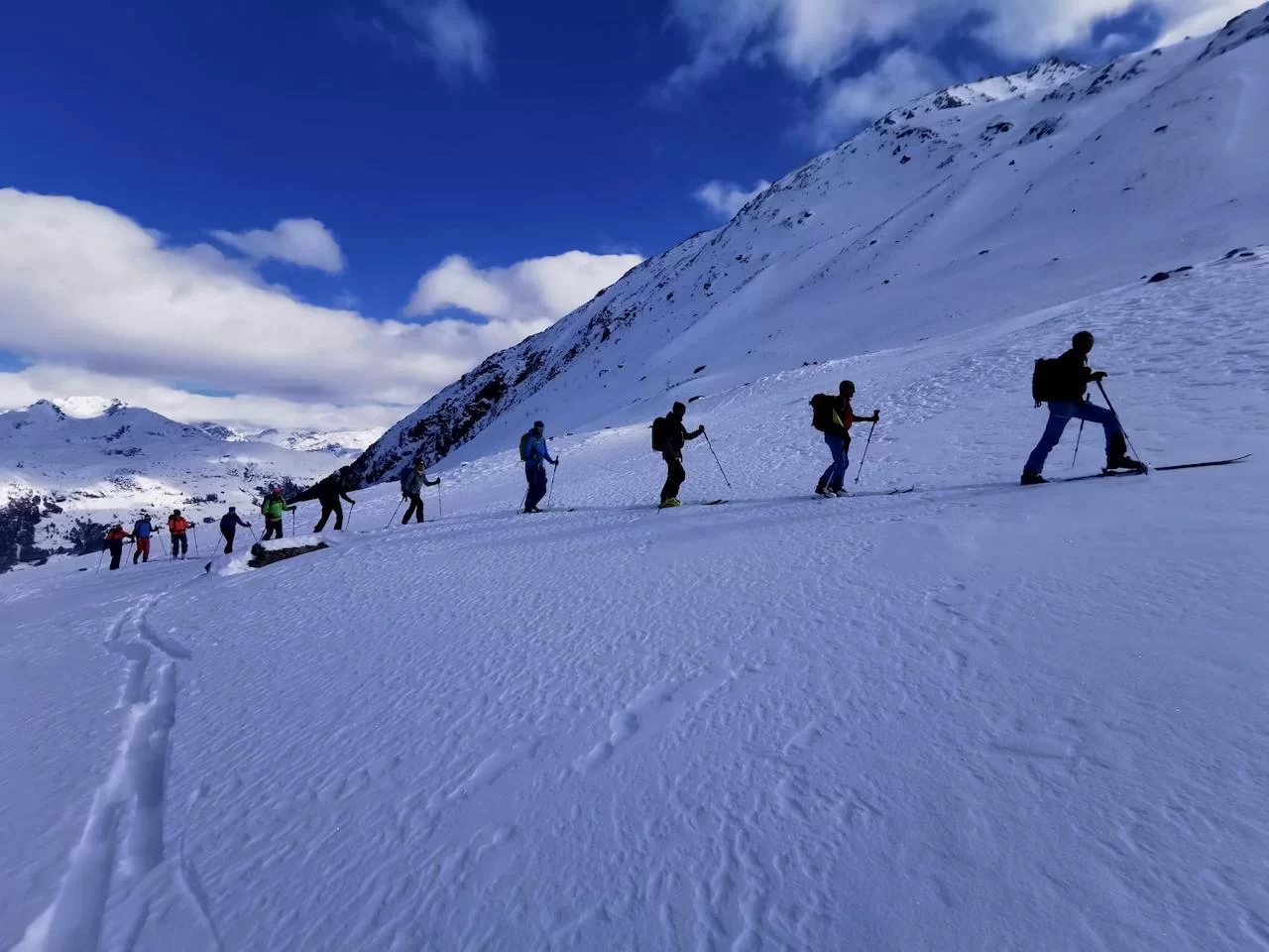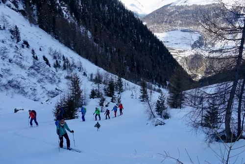 Der Wetterbericht sollte Recht behalten und im Unterengadin gab es mehr Sonnenschein. Also auf nach Sur En und ins Val Nuna. Gemütlich gestartet und der Alpweg Richtung Giarsun war gespurt, aber nur bis zur Brücke. Danach hiess es selber Hand anlegen. Einsam im Val Nuna gingen wir der Sonne entgegen. Windgeschützt genossen wir den Auftieg zum letzen Schlusshang. Dort Ski aufbinden und zu Fuss weiter. Der Wind frischte am Grat etwas auf, so machten wir keine ausgiebig Gipfelpause und fuhren wieder in windgeschütze Gefilde ab. Herzlichen Dank an alle Teilnehmer für die gelungen ruhige und einsame Tour .