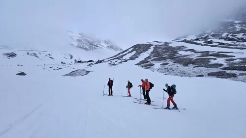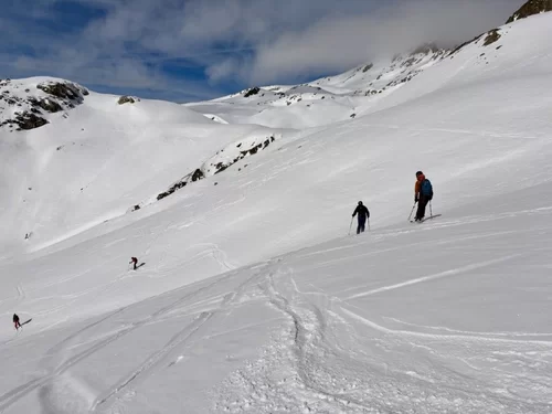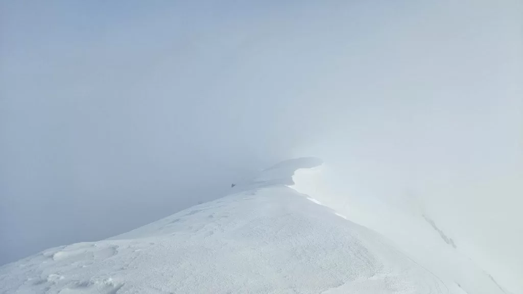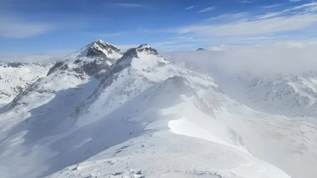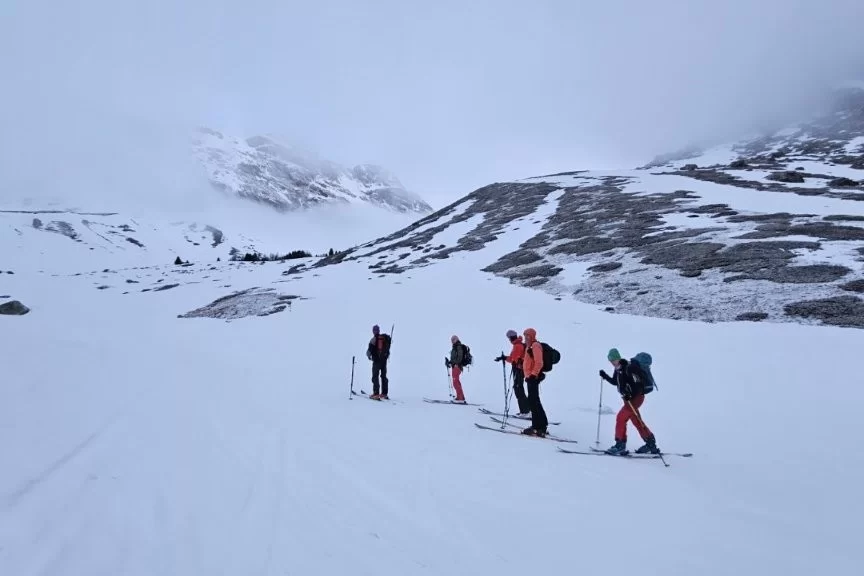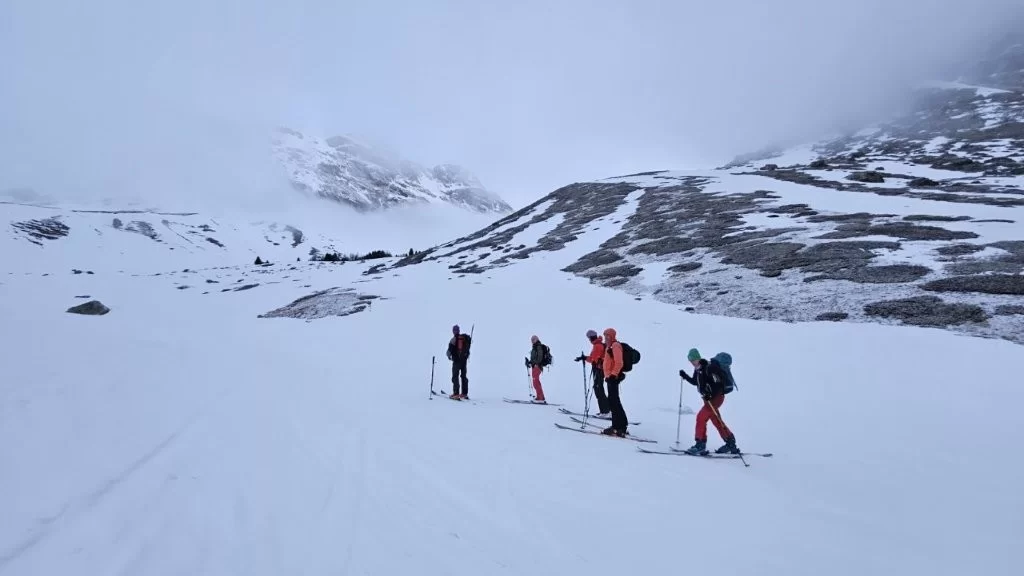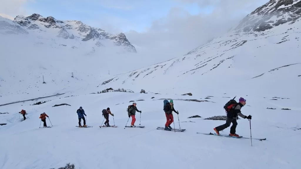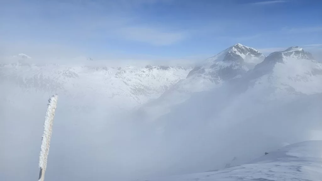 Nach einer bedeckten Nacht und einer Temperatur knapp unter dem Gefrierpunkt, trafen wir uns um 6.00 bei der Bad Post. Wir fuhren zu unserem Ausgangspunkt Alp Güglia. Erstaunlicherweise hielt die Schneedecke und es hatte sogar ein paar Zentimeter Neuschnee darauf. Bei leichtem Nebeltreiben starteten wir gemächlich in die Valleta dal Güglia. Bei der ersten kurzen Pause, konnten wir ein Skistopperproblem beheben. Nach der Pause stiegen wir weiter in zur Fuorcla Chamuotsch hoch. Hier montierten wir die Harscheisen und stiegen noch ein paar Meter hoch. Jedoch versperrten ein paar Felsen den Aufstieg mit den Skis, also zogen wir sie aus und trugen sie bis nach den Felsen und machten da das Skidepot. Zu Fuss gingen wir dann dem Grat entlang zum Gipfel. Ein paar grosse Wächten, die abzubrechen drohten, haben eindrückliche Spalten geöffnet.