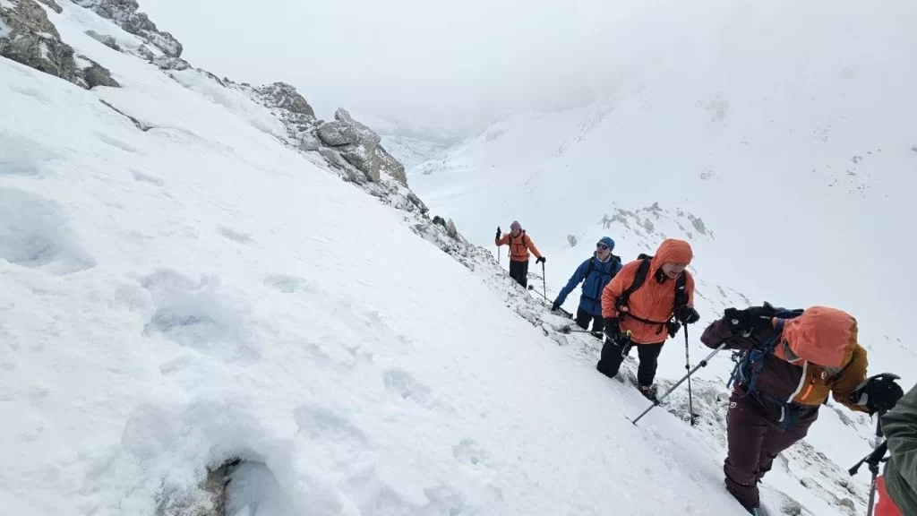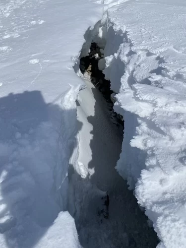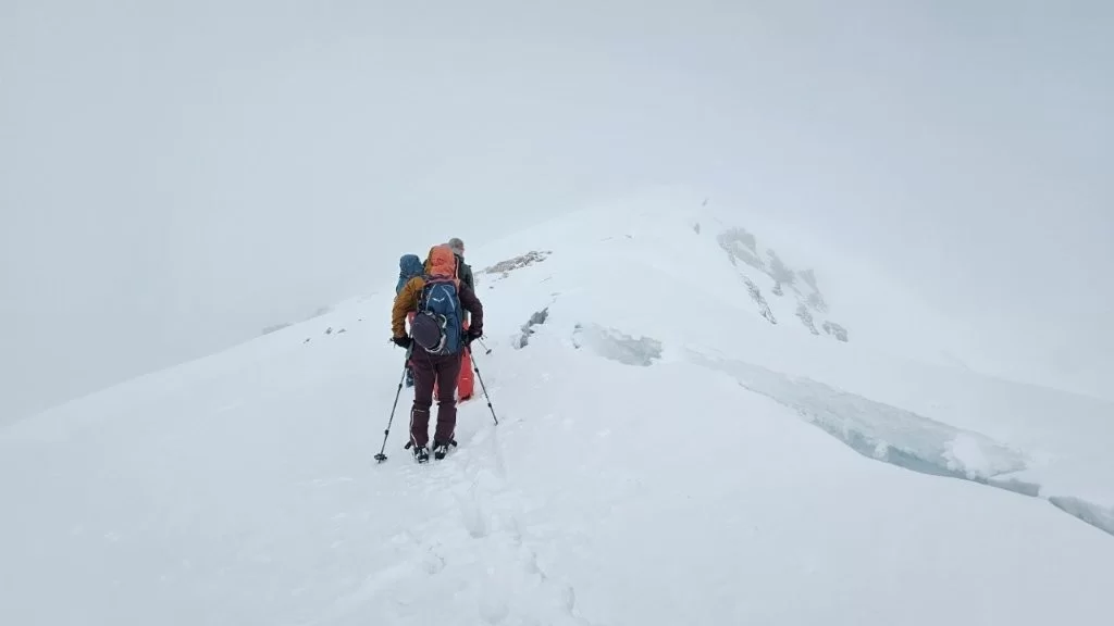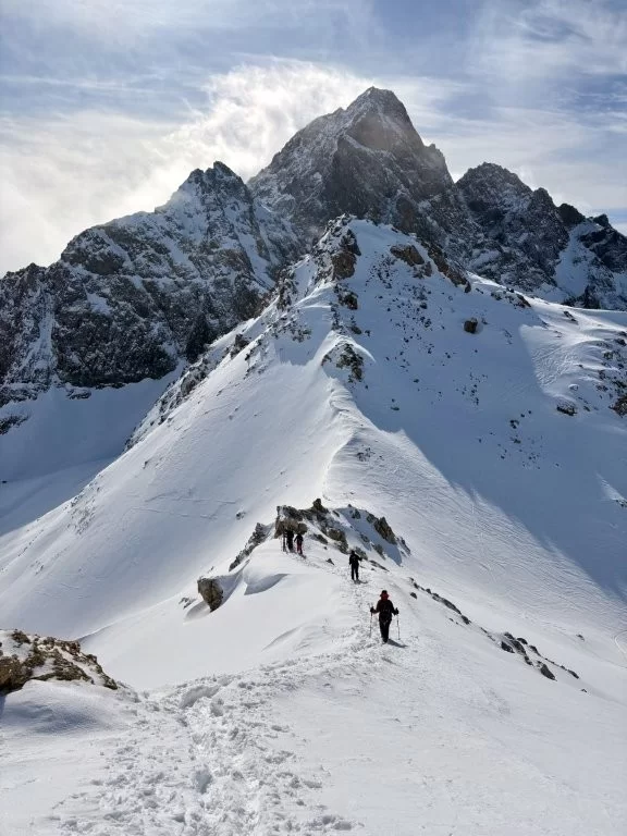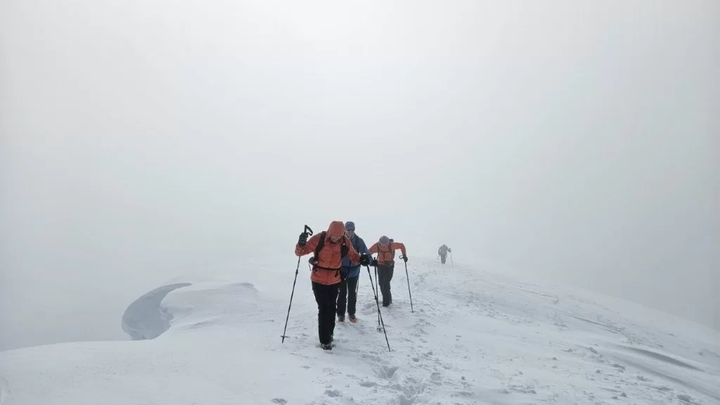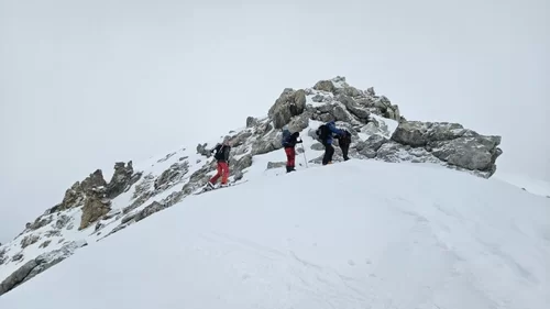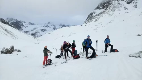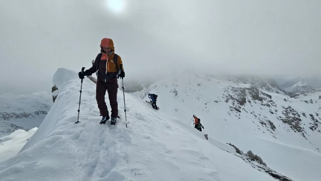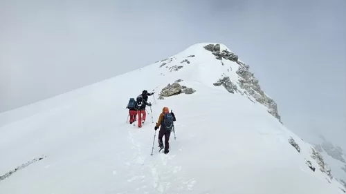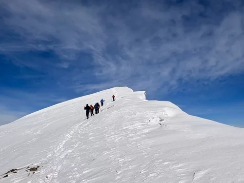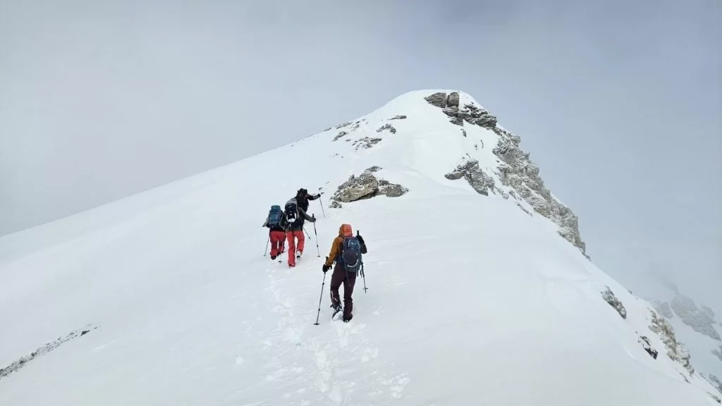 Nach einer bedeckten Nacht und einer Temperatur knapp unter dem Gefrierpunkt, trafen wir uns um 6.00 bei der Bad Post. Wir fuhren zu unserem Ausgangspunkt Alp Güglia. Erstaunlicherweise hielt die Schneedecke und es hatte sogar ein paar Zentimeter Neuschnee darauf. Bei leichtem Nebeltreiben starteten wir gemächlich in die Valleta dal Güglia. Bei der ersten kurzen Pause, konnten wir ein Skistopperproblem beheben. Nach der Pause stiegen wir weiter in zur Fuorcla Chamuotsch hoch. Hier montierten wir die Harscheisen und stiegen noch ein paar Meter hoch. Jedoch versperrten ein paar Felsen den Aufstieg mit den Skis, also zogen wir sie aus und trugen sie bis nach den Felsen und machten da das Skidepot. Zu Fuss gingen wir dann dem Grat entlang zum Gipfel. Ein paar grosse Wächten, die abzubrechen drohten, haben eindrückliche Spalten geöffnet.