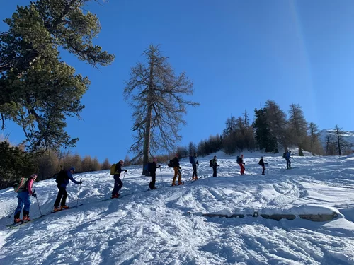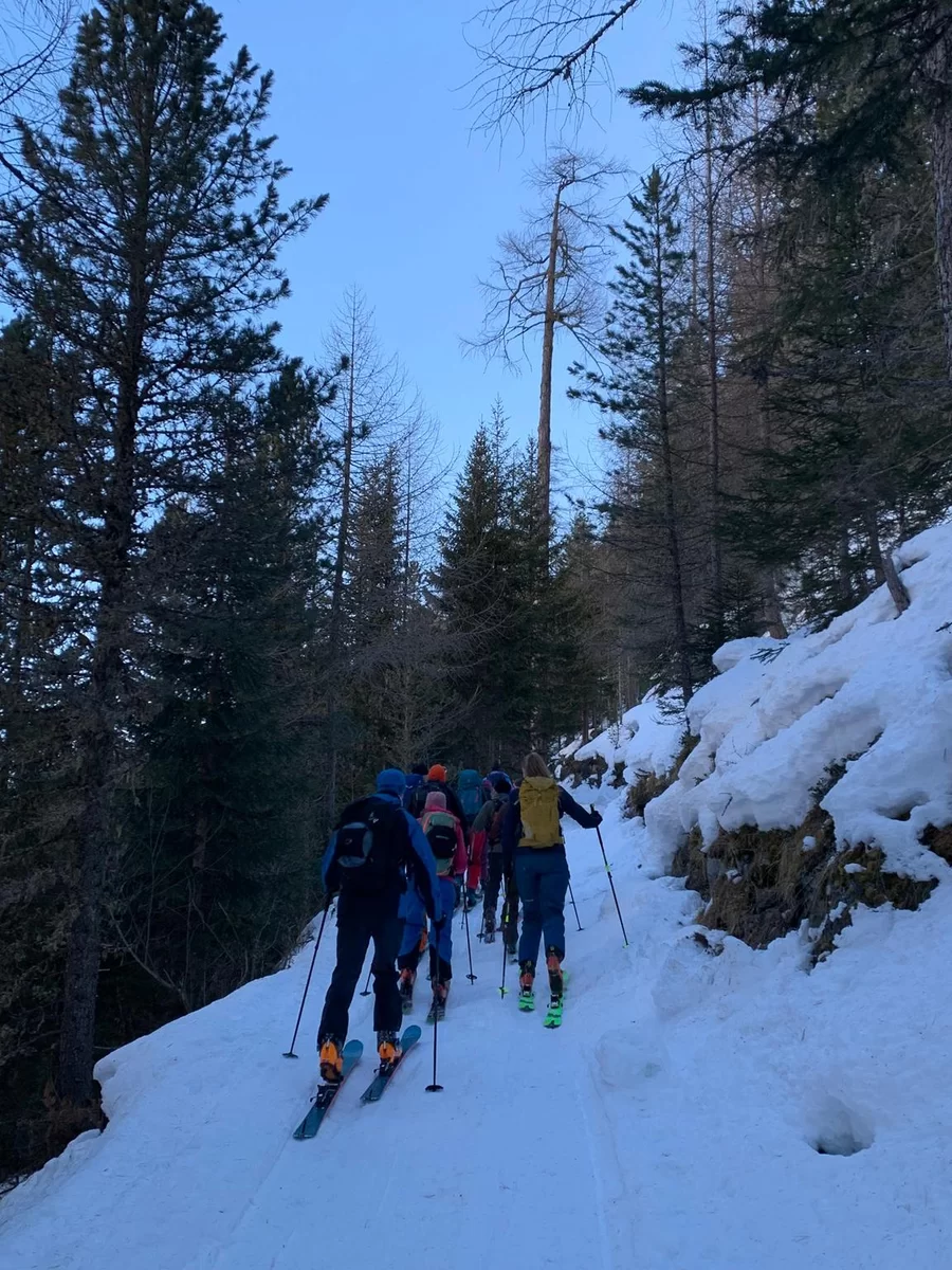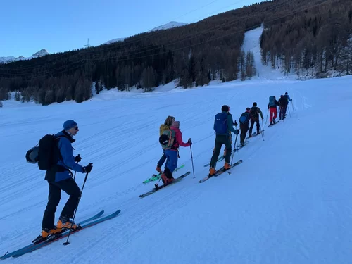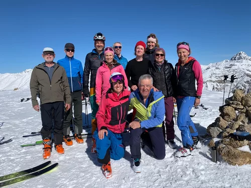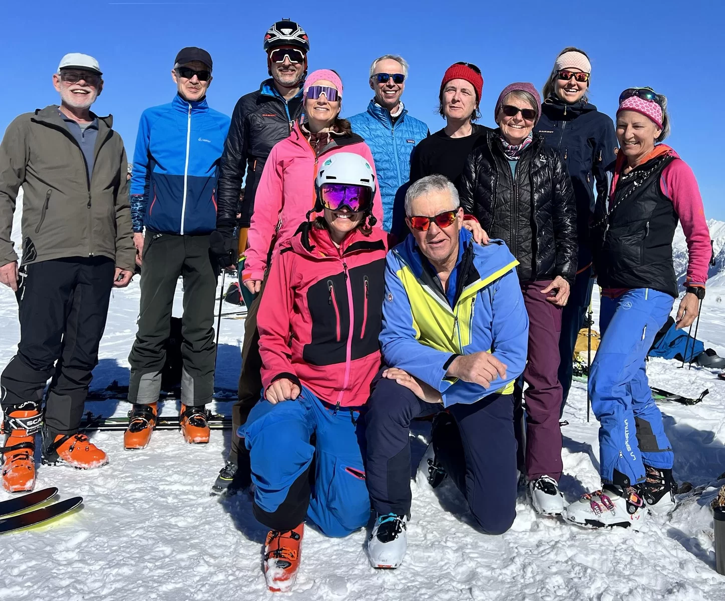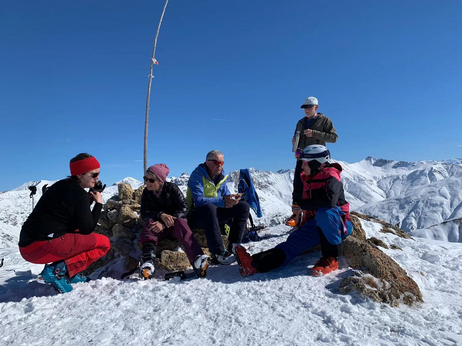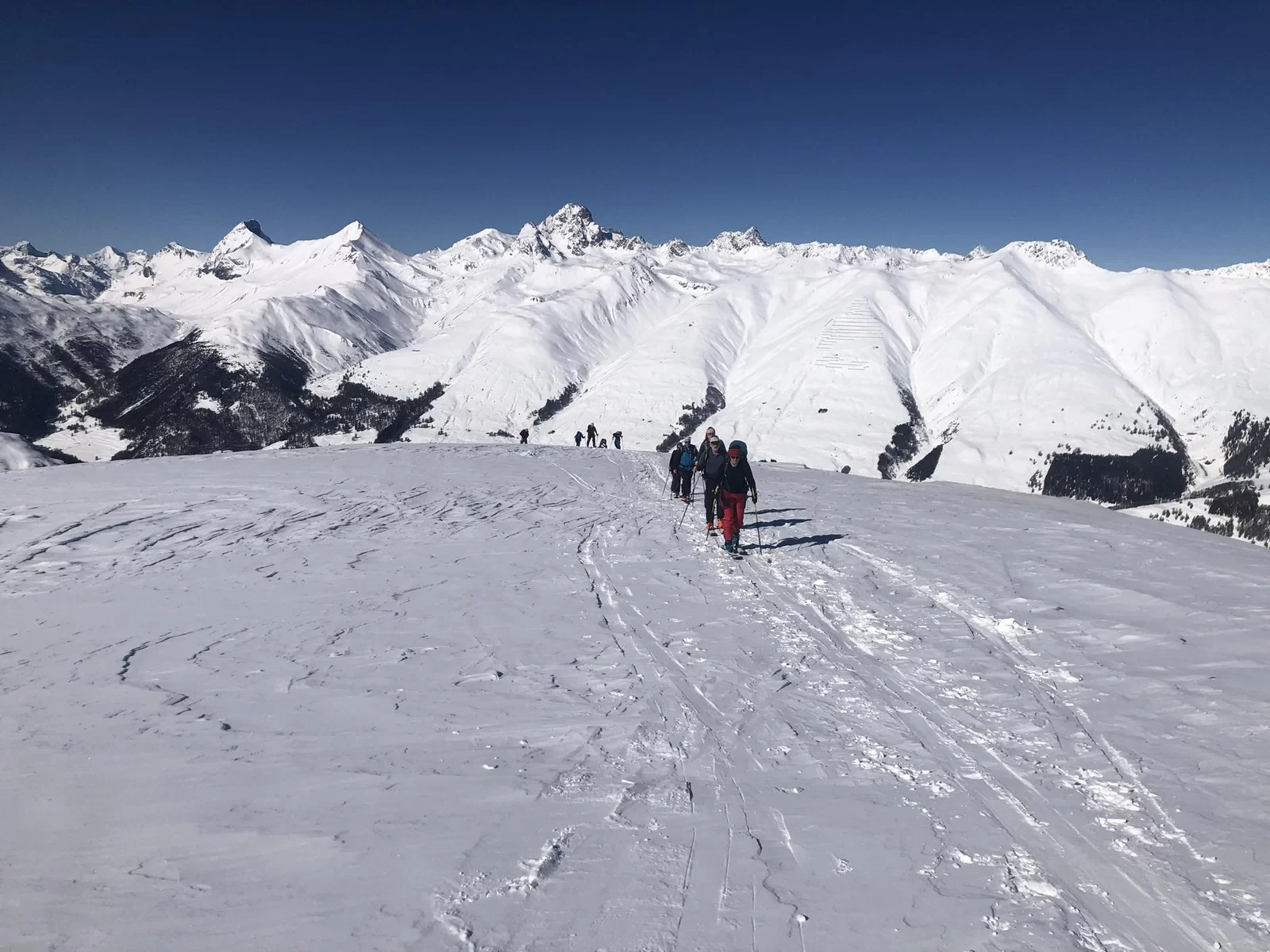 Um 08:00 starteten in Resgia. Wir wählten den ruhigen, gar etwas meditativen Weg, der Waldstrasse entlang und machten nach 560 hm die erste Rast. Danach montierten wir oberhalb Plaun d’Arpschellas die Harscheisen. So erreichten wir bequem den zweiten Rastplatz unter Pt. 2665. Danach über den Rücken, flacher werdend erreichten wir nach 1065 Höhenmeter den Gipfel vom Piz Arpiglia bei angenehmer Wärme. Nach ausgiebiger Gipfelrast mit einer großartigen Sicht und gar einem scönen Gruppenfoto mit allen TN, fuhren wir der Aufstiegsroute entlang wieder talwärts. Es hat allen Spass gemacht, obwohl der Schnee nun nicht so prickelnd gut war. Zum Abschluss fanden wir auf der Sonnenterasse im «Sur En» einen Tisch an welchem Monika, Pirmin, Bruno, Reinhard, Tina, Mirco, Antonia und Nadja Platz gefunden haben. Ich möchte mich herzlich bei Monica als zweite Tourenleiterin für ihre Funktion als Backguide bedanken. Diese Gruppe war ja wieder ein Geschenk! Nur Freude!