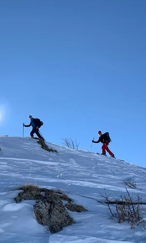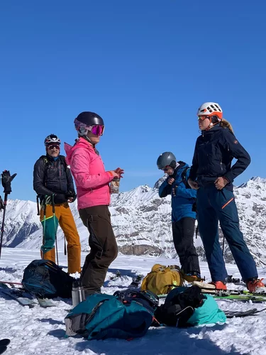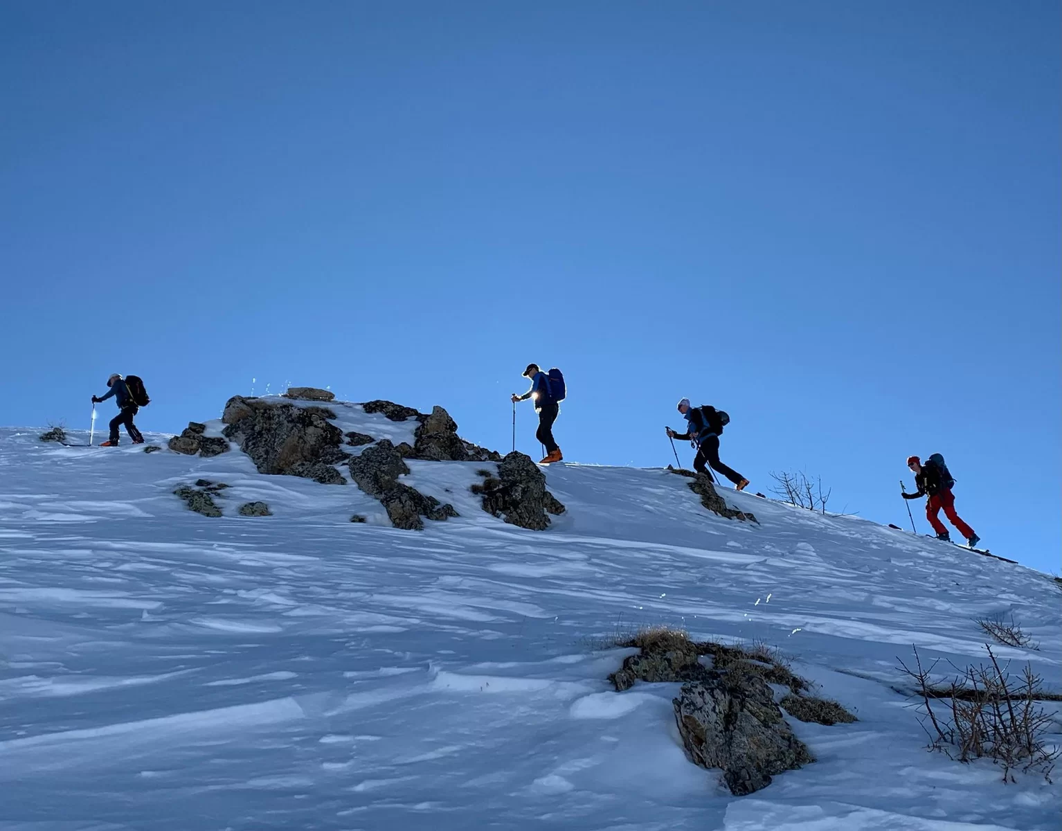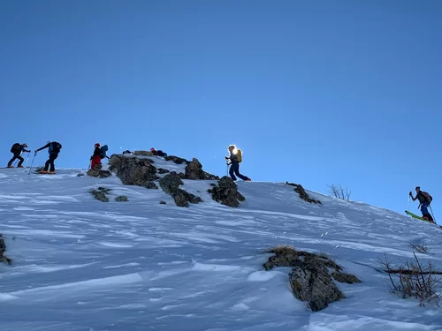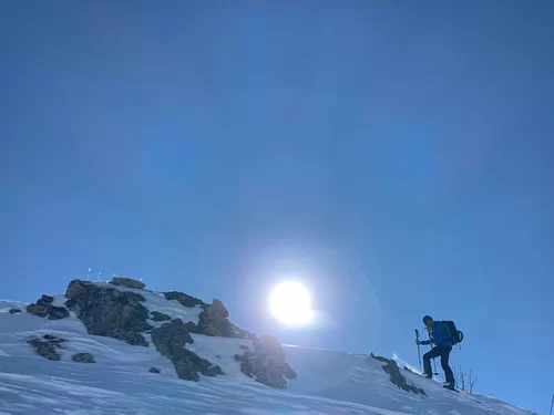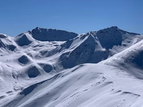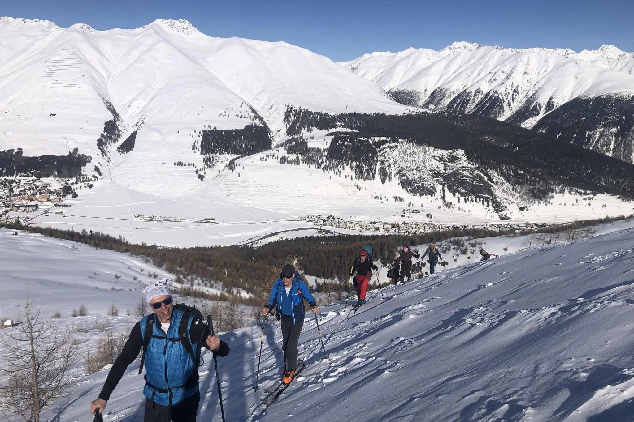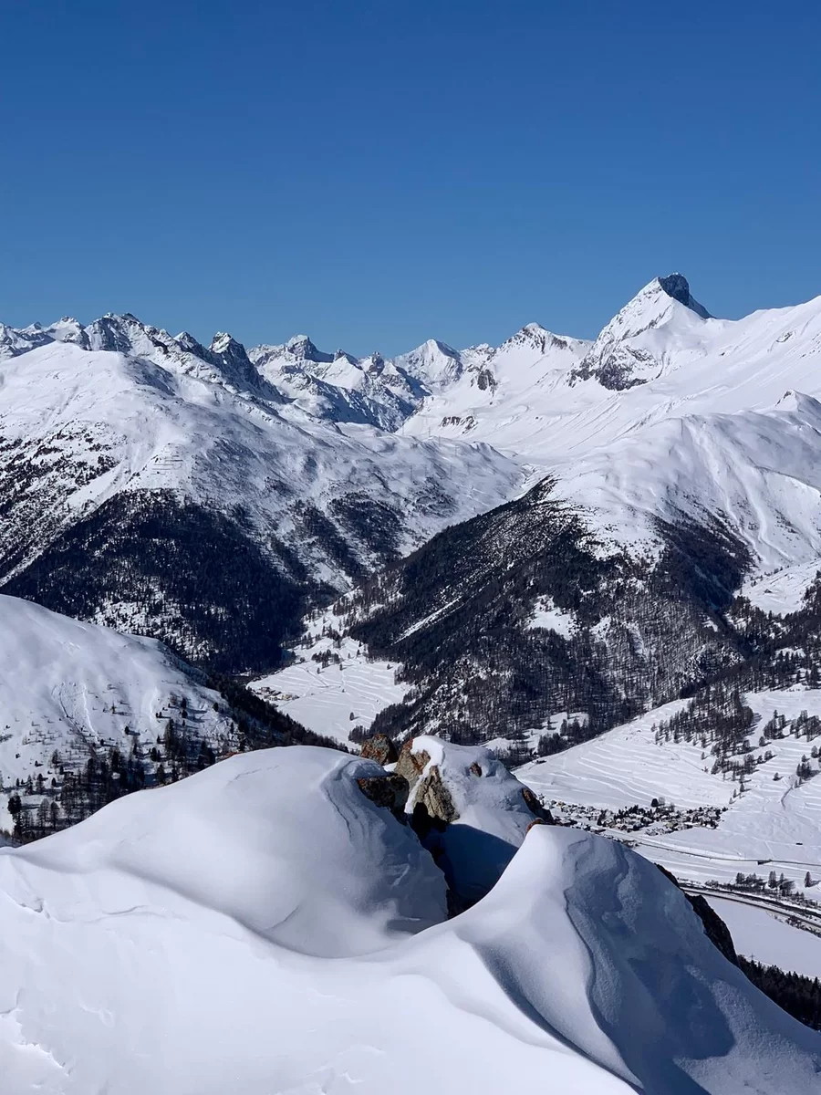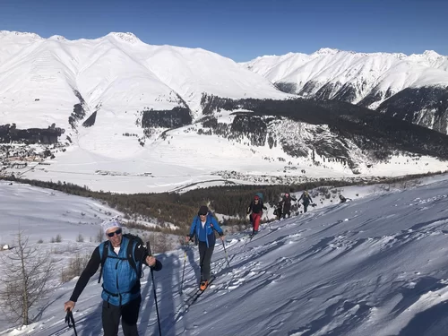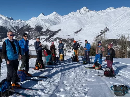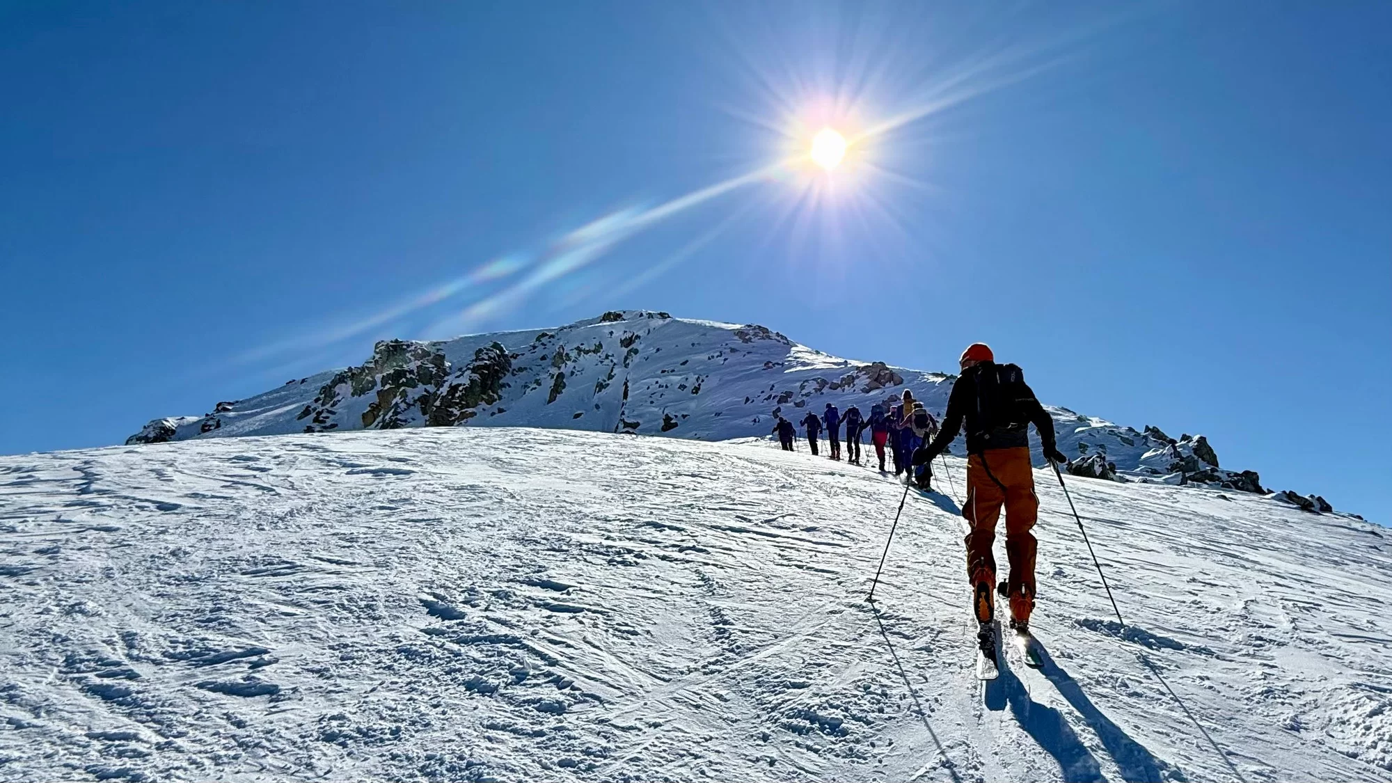 Um 08:00 starteten in Resgia. Wir wählten den ruhigen, gar etwas meditativen Weg, der Waldstrasse entlang und machten nach 560 hm die erste Rast. Danach montierten wir oberhalb Plaun d’Arpschellas die Harscheisen. So erreichten wir bequem den zweiten Rastplatz unter Pt. 2665. Danach über den Rücken, flacher werdend erreichten wir nach 1065 Höhenmeter den Gipfel vom Piz Arpiglia bei angenehmer Wärme. Nach ausgiebiger Gipfelrast mit einer großartigen Sicht und gar einem scönen Gruppenfoto mit allen TN, fuhren wir der Aufstiegsroute entlang wieder talwärts. Es hat allen Spass gemacht, obwohl der Schnee nun nicht so prickelnd gut war. Zum Abschluss fanden wir auf der Sonnenterasse im «Sur En» einen Tisch an welchem Monika, Pirmin, Bruno, Reinhard, Tina, Mirco, Antonia und Nadja Platz gefunden haben. Ich möchte mich herzlich bei Monica als zweite Tourenleiterin für ihre Funktion als Backguide bedanken. Diese Gruppe war ja wieder ein Geschenk! Nur Freude!
