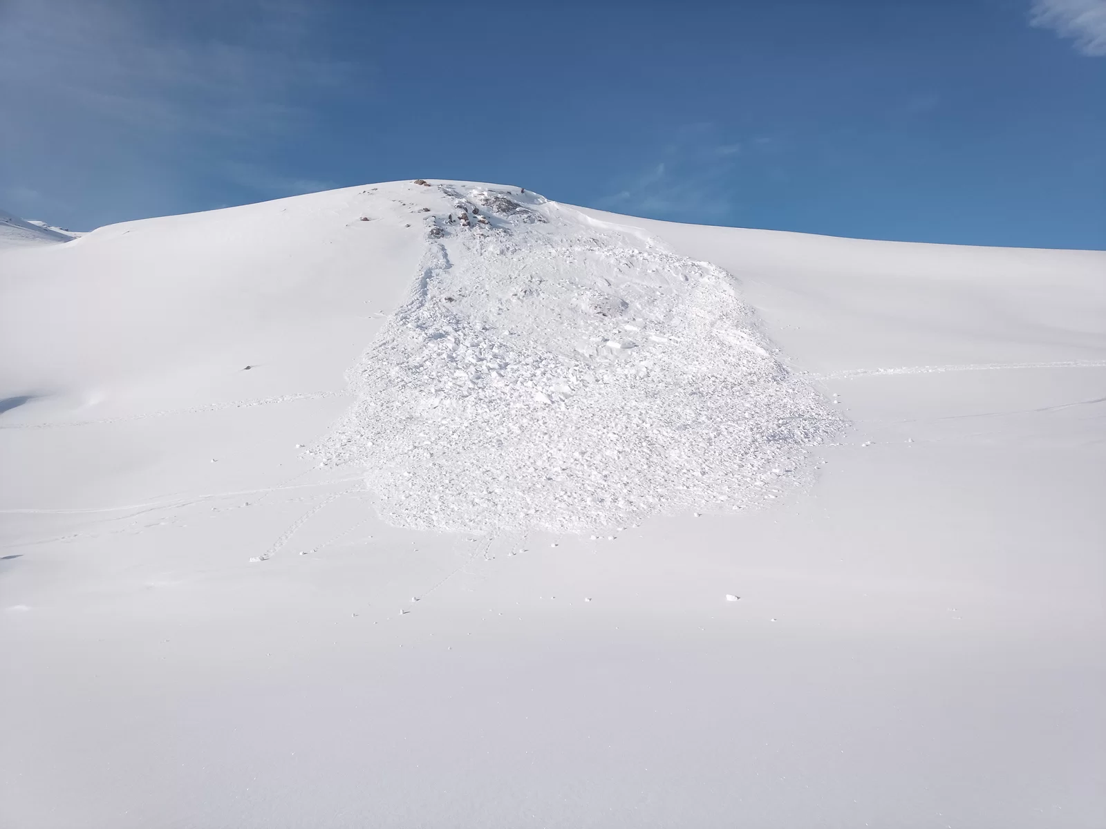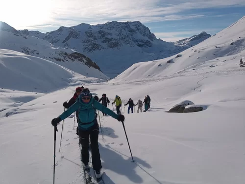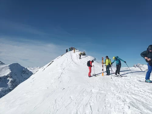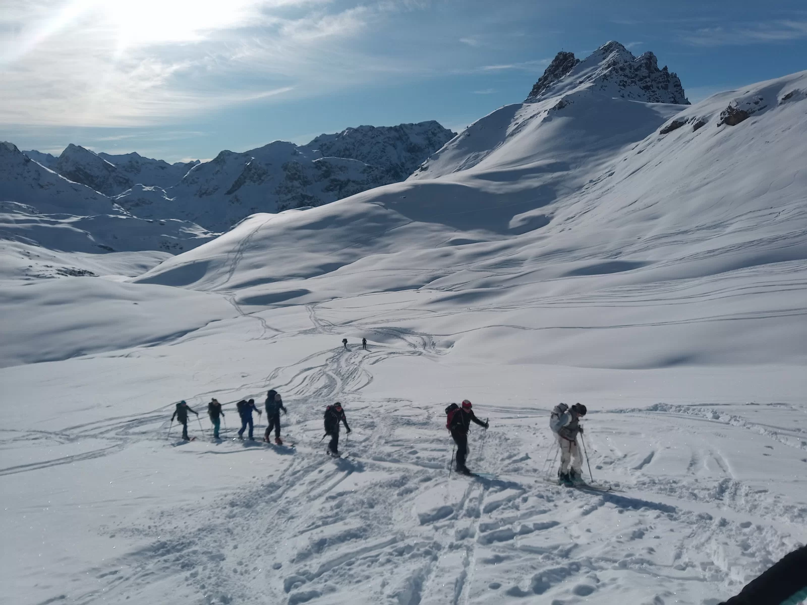 9 Teilnehmer und ich starteten um 8.30 Uhr bei kalten Wind unterhalb La Veduta in Richtung Piz Campagnung. Wir staunten nicht schlecht über die viele Schneebretter an den Osthängen des Val d Agnel, nun verstanden wir wieso das Lawinenbulletin erheblich+ voraussagte. Immer mit grosser Distanz zu diesen Hängen ging es weiter in über nicht mehr als 30 Grad steile Seiten hoch zum Gipfel. Heute waren nicht so viele Leute unterwegs, so hatten wir auf dem Gipfel genug Platz für eine Pause.