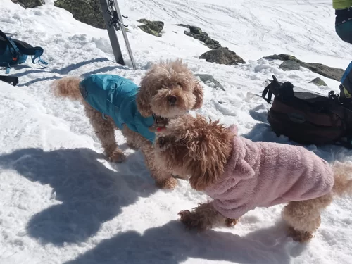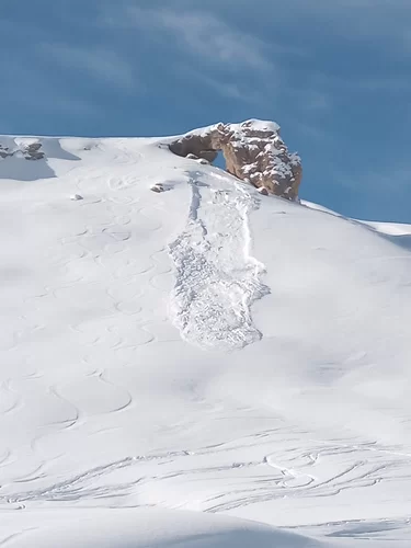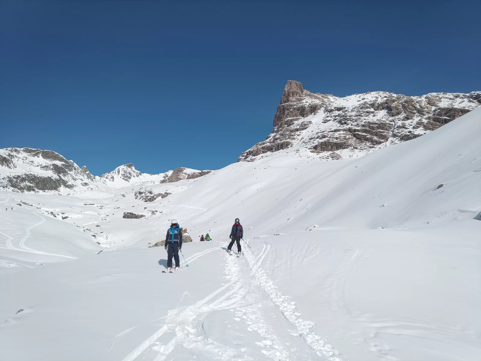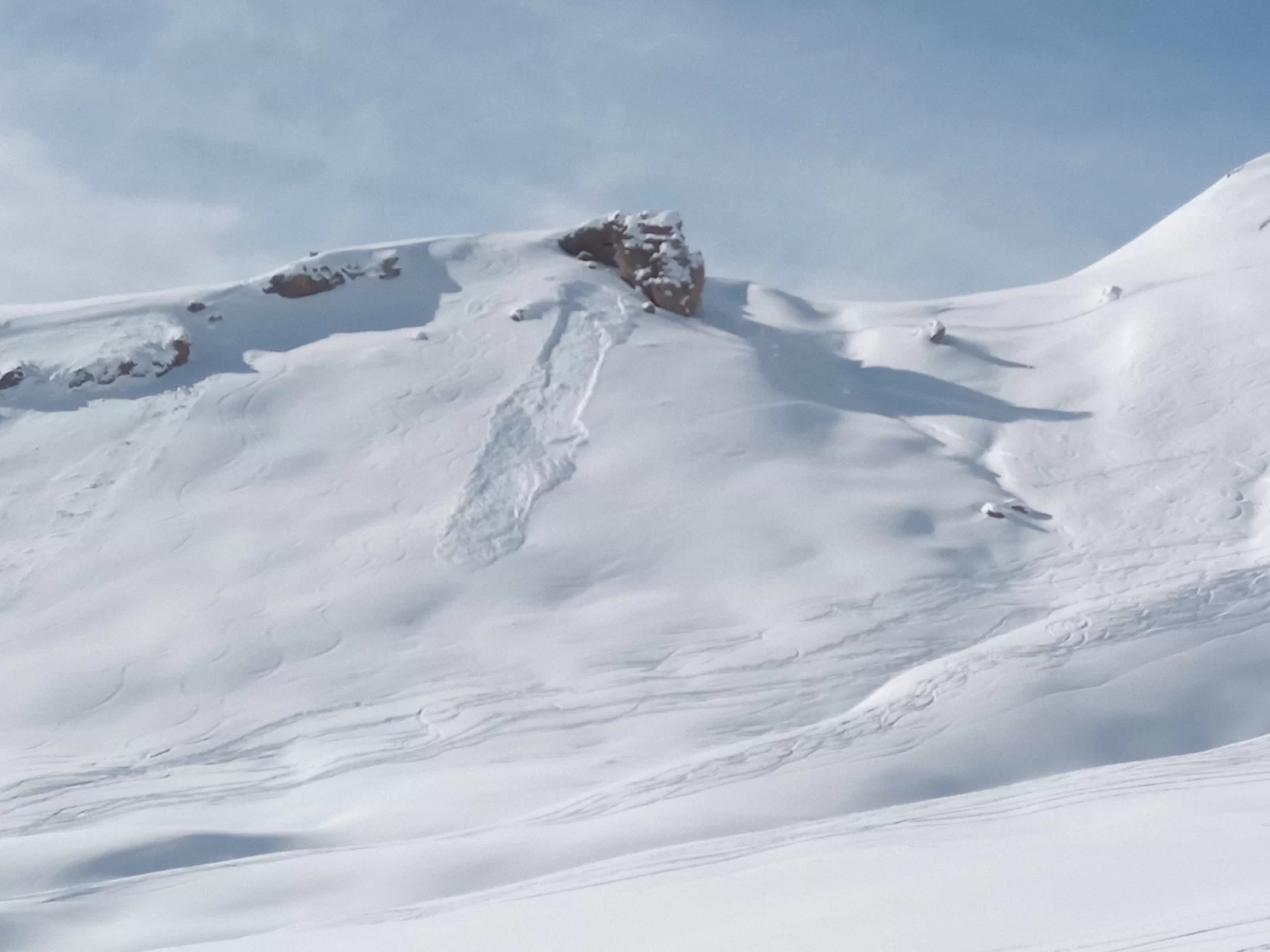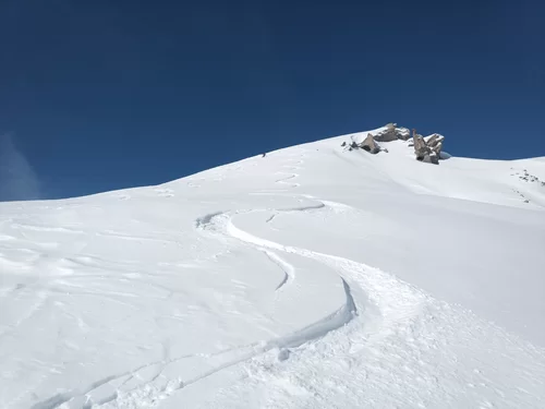Nach ein paar Gipfelfotos fuhren wir die ersten pulvrigen Hänge aus Sicherheitsgründen einzeln, später nach dem Flachstück hatte es dann wieder weniger Schnee und viele Steine, man musste gut schauen und der eine oder andere Kratzer gab es dann doch noch.